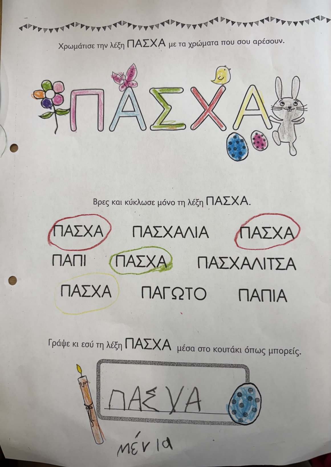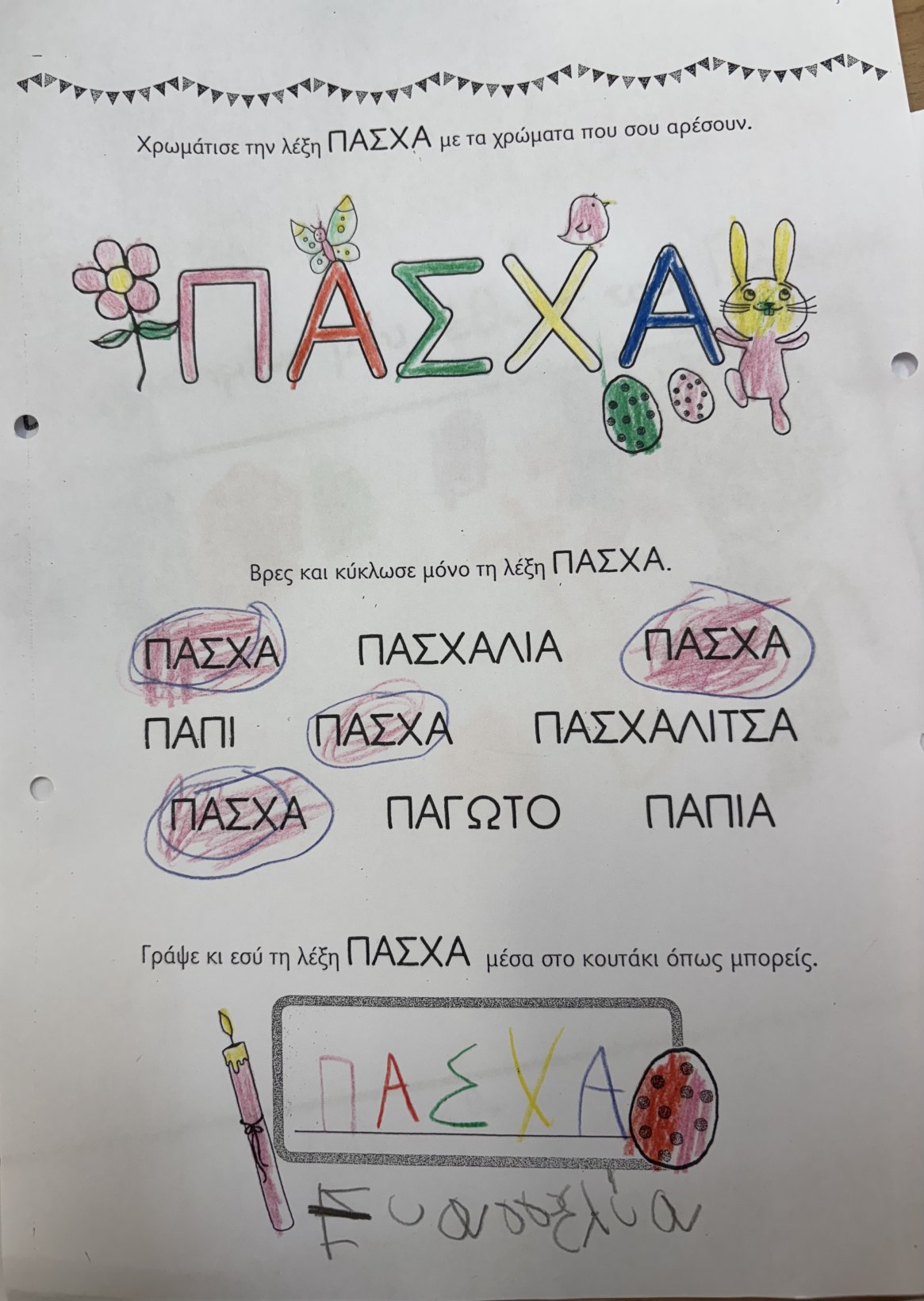 - Γνωρίσαμε τη λέξη Πάσχα, την κυκλώσαμε και προσπαθήσαμε να τη γράψουμε…
