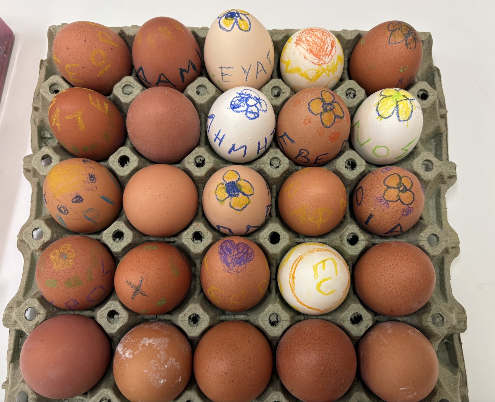Η μεγάλη έκπληξη όμως ήρθε στο τέλος της εβδομάδας… Ένα κυνήγι πασχαλινών αυγών περίμενε τα παιδιά μέσα στην τάξη μας! Μικρά αυγουλάκια είχαν κρυφτεί σε απίθανα σημεία, και κάθε ένα έκρυβε κι από ένα γράμμα. Όταν τα ανακαλύψαμε όλα και τα βάλαμε στη σωστή σειρά, το μήνυμα αποκαλύφθηκε: «Καλό Πάσχα»!