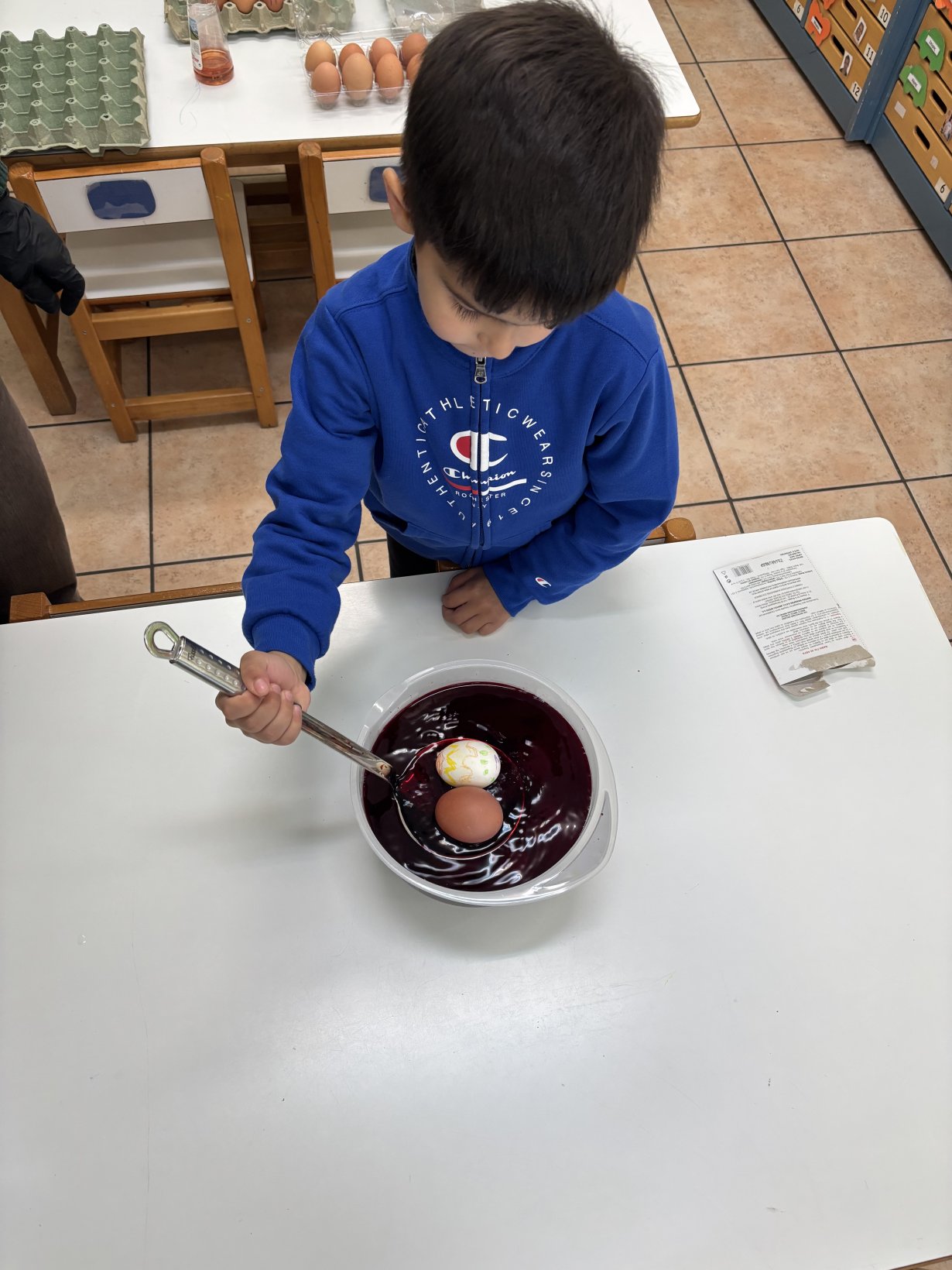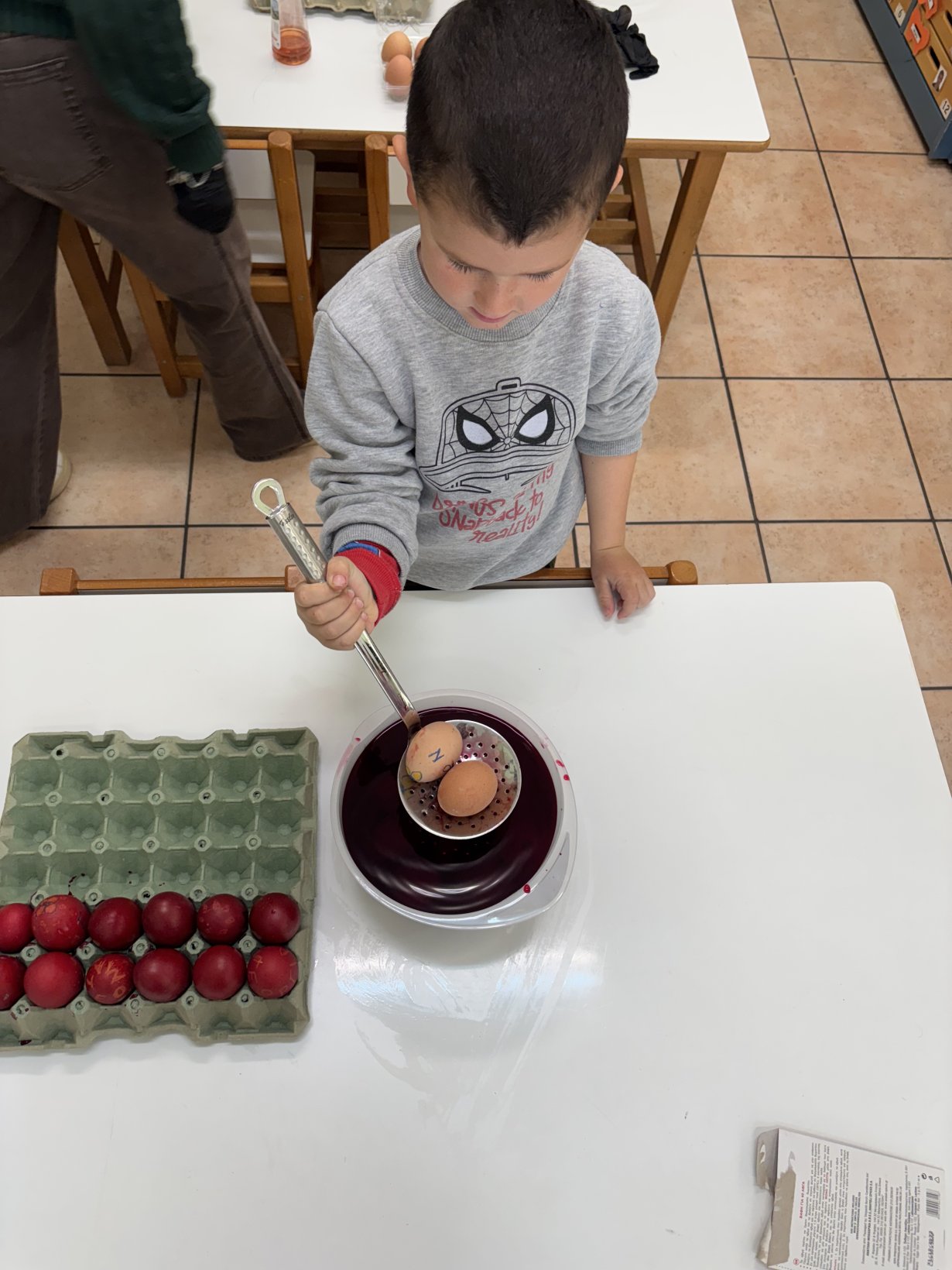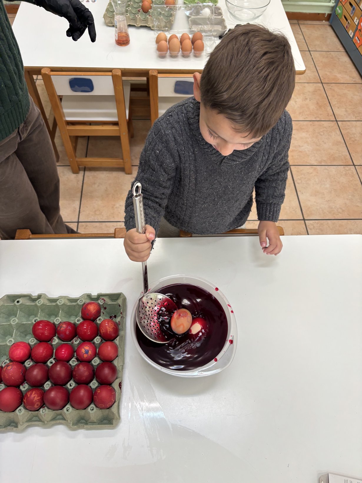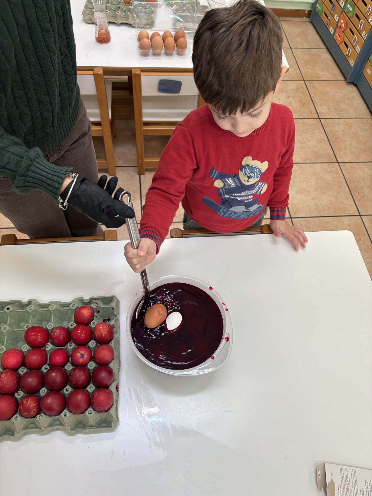 Πήραμε από το σπίτι βρασμένα αυγά, τα ζωγραφίσαμε με λαδοπαστέλ, τα βάψαμε κόκκινα και φέραμε τη παράδοση μέσα στην τάξη!