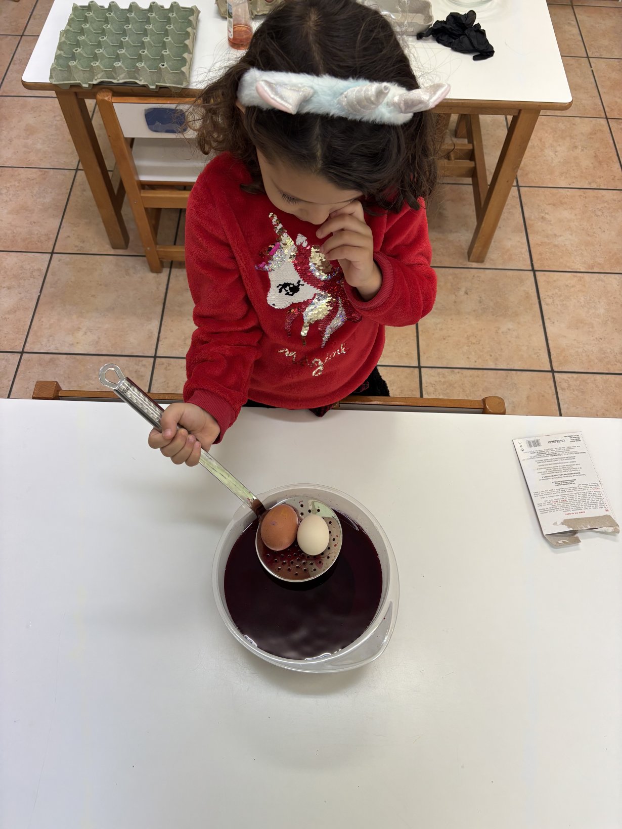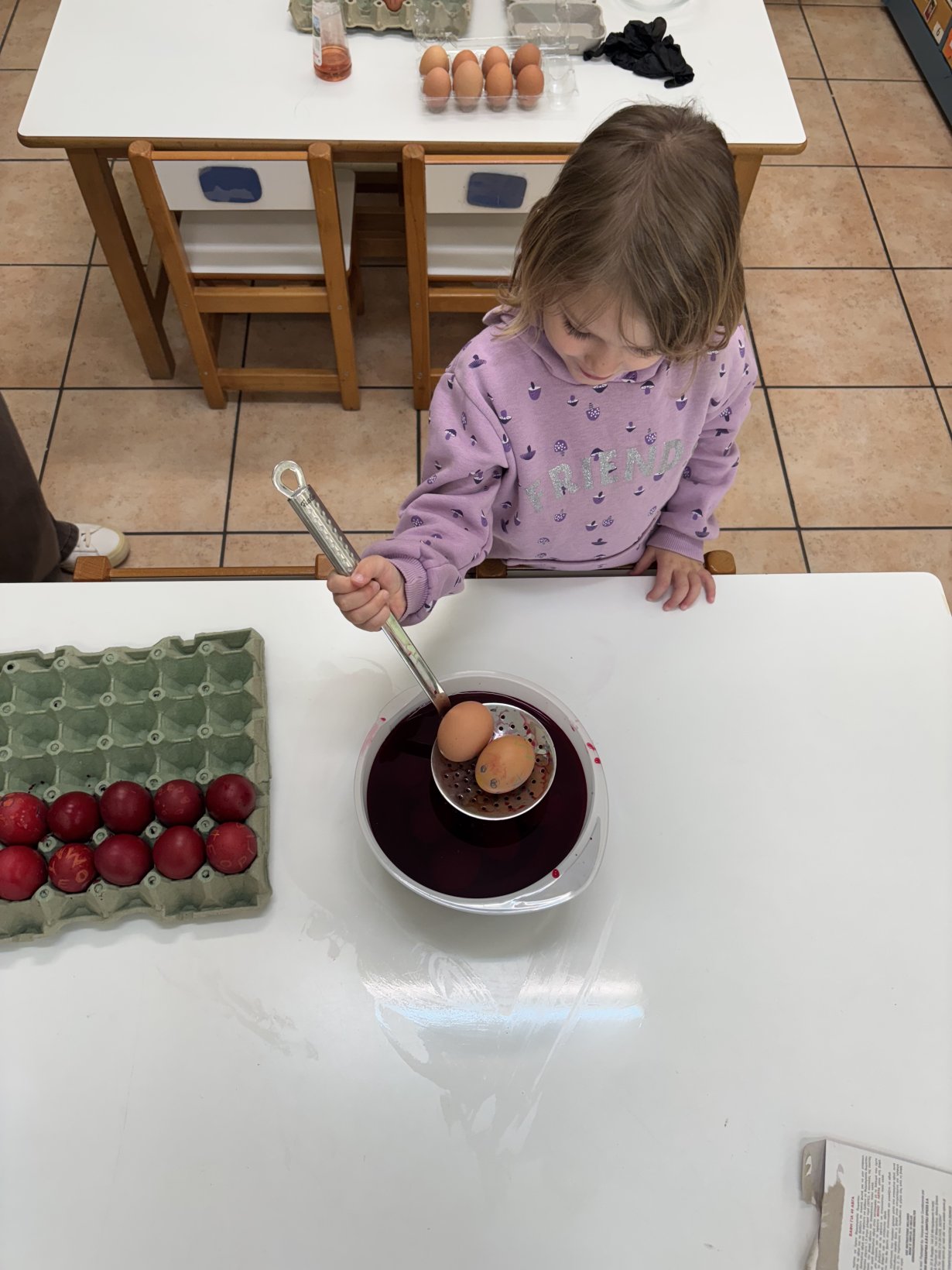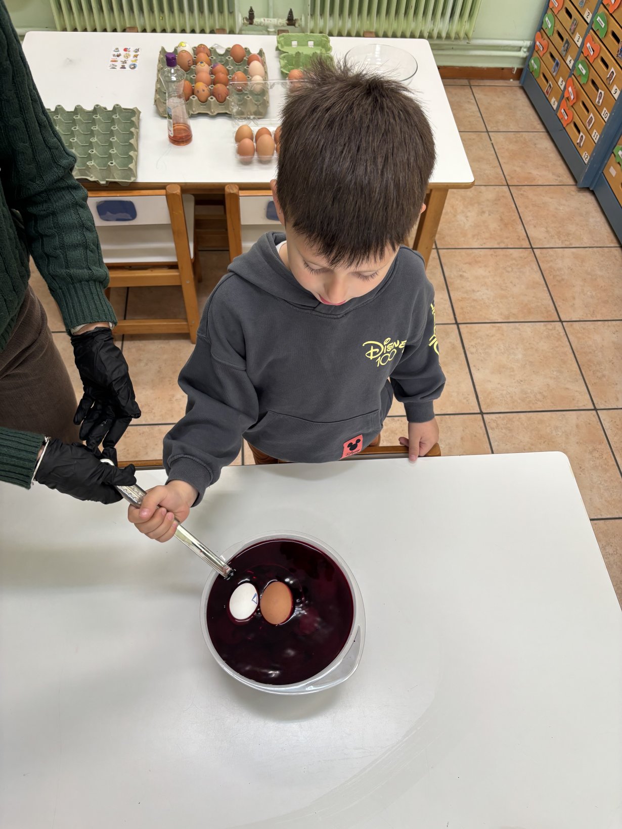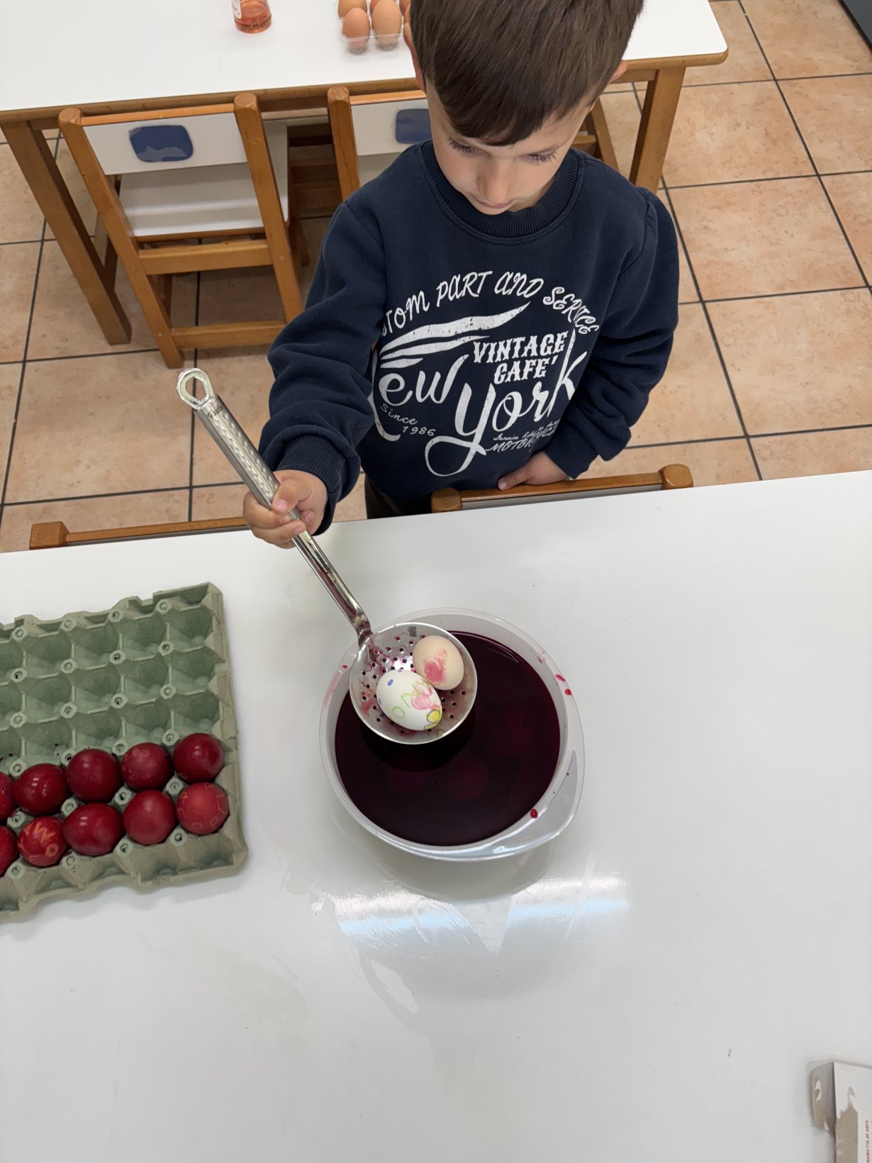Πήραμε από το σπίτι βρασμένα αυγά, τα ζωγραφίσαμε με λαδοπαστέλ, τα βάψαμε κόκκινα και φέραμε τη παράδοση μέσα στην τάξη!