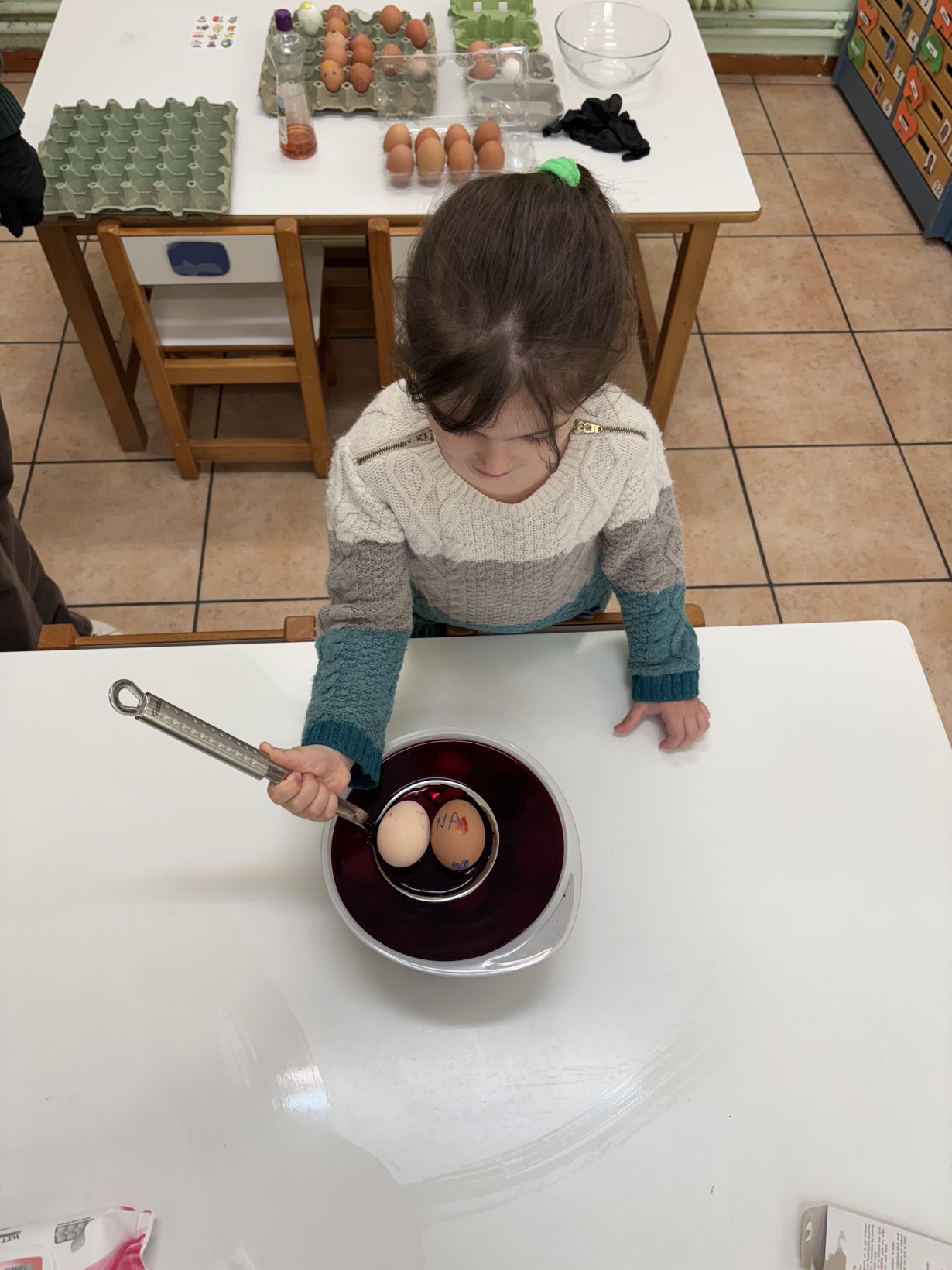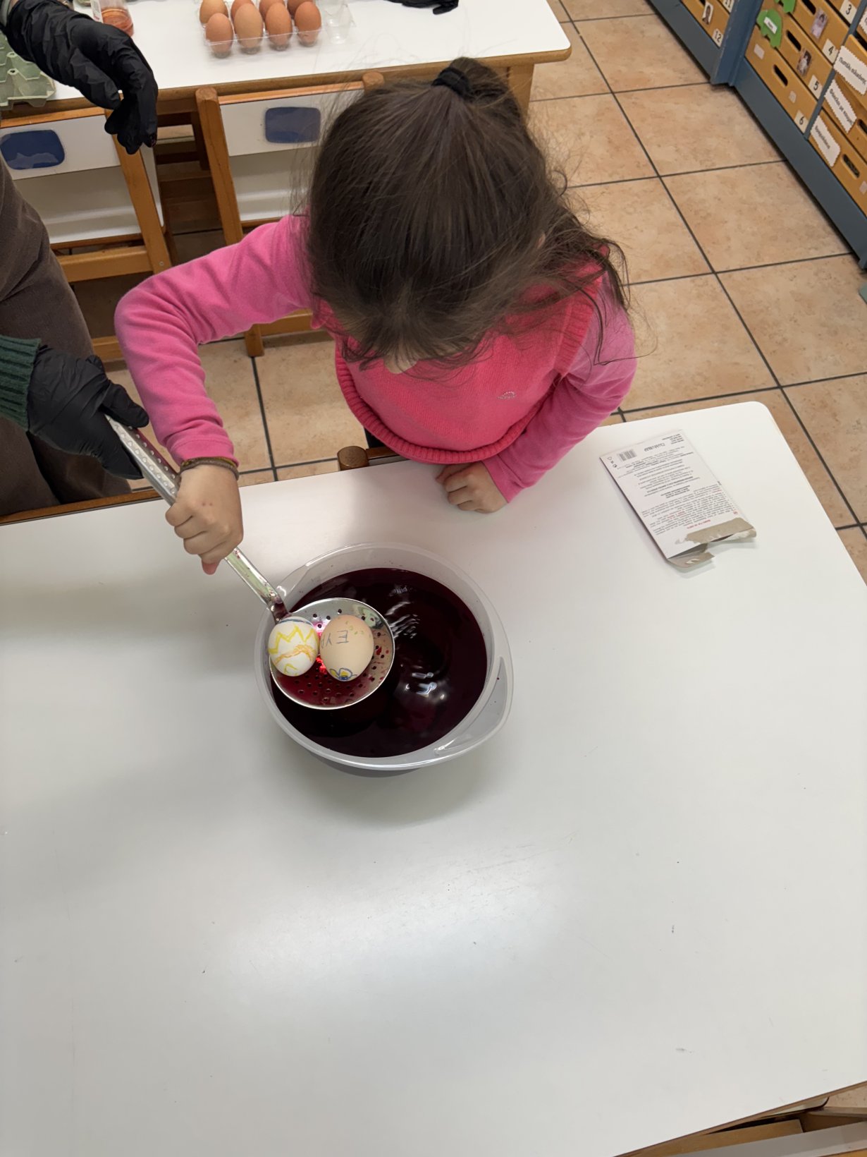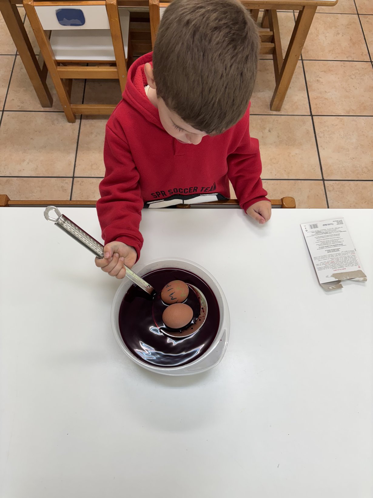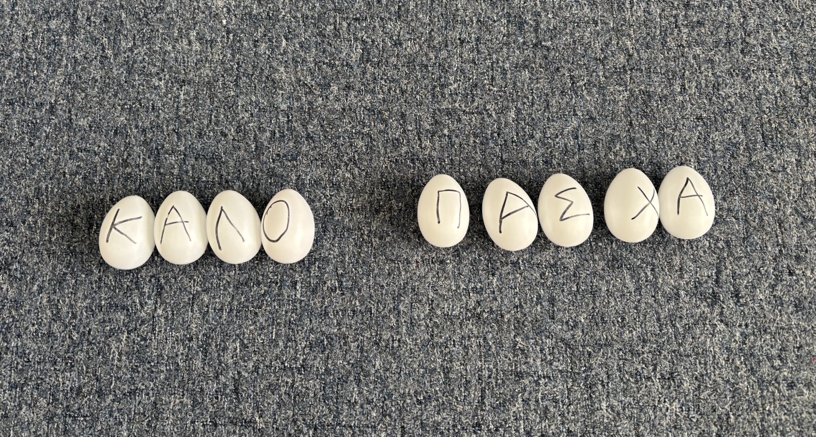 Πήραμε από το σπίτι βρασμένα αυγά, τα ζωγραφίσαμε με λαδοπαστέλ, τα βάψαμε κόκκινα και φέραμε τη παράδοση μέσα στην τάξη!