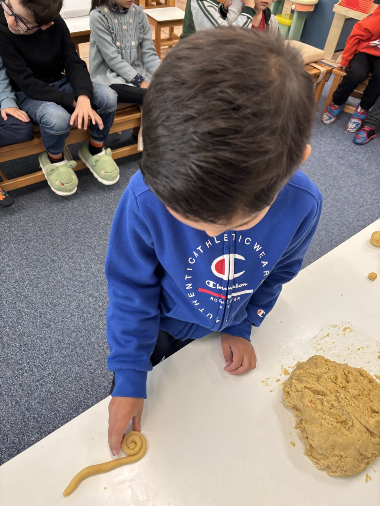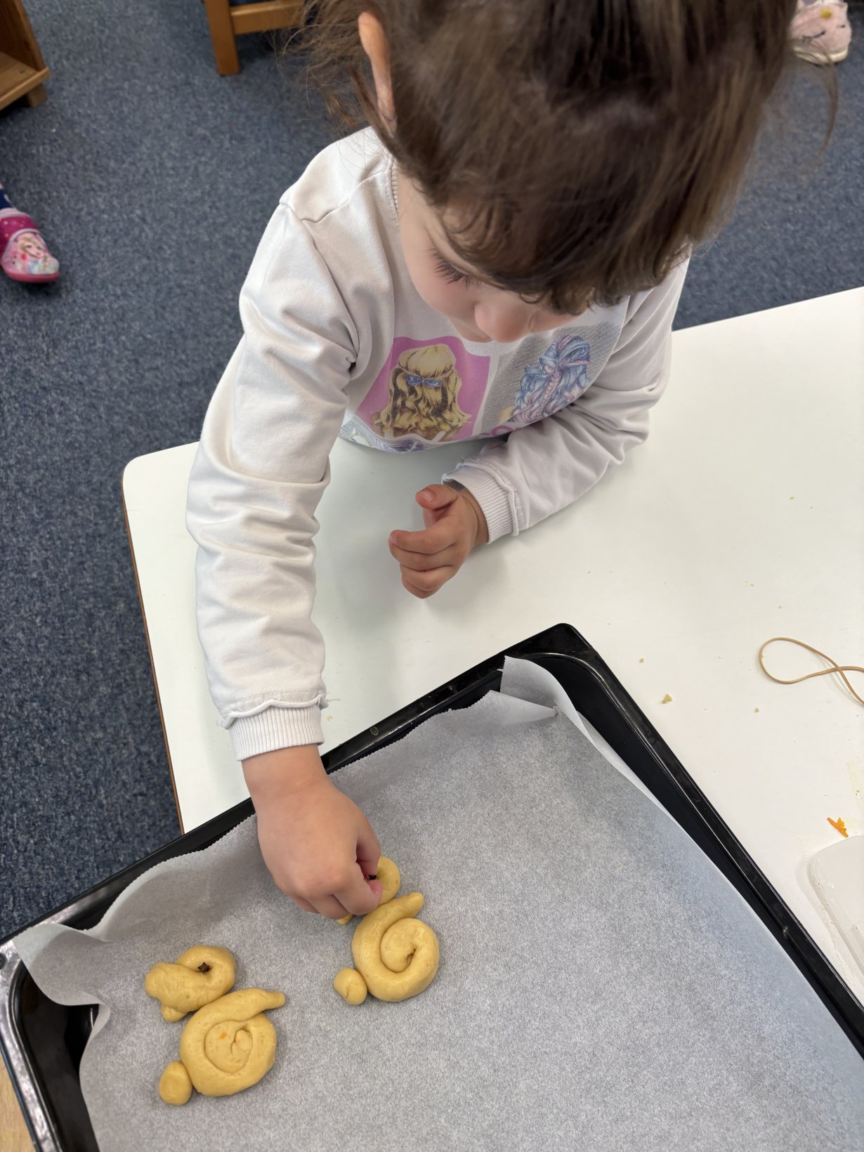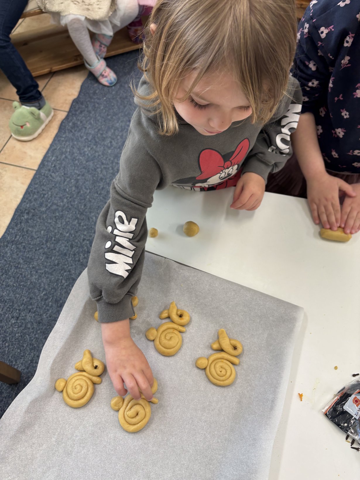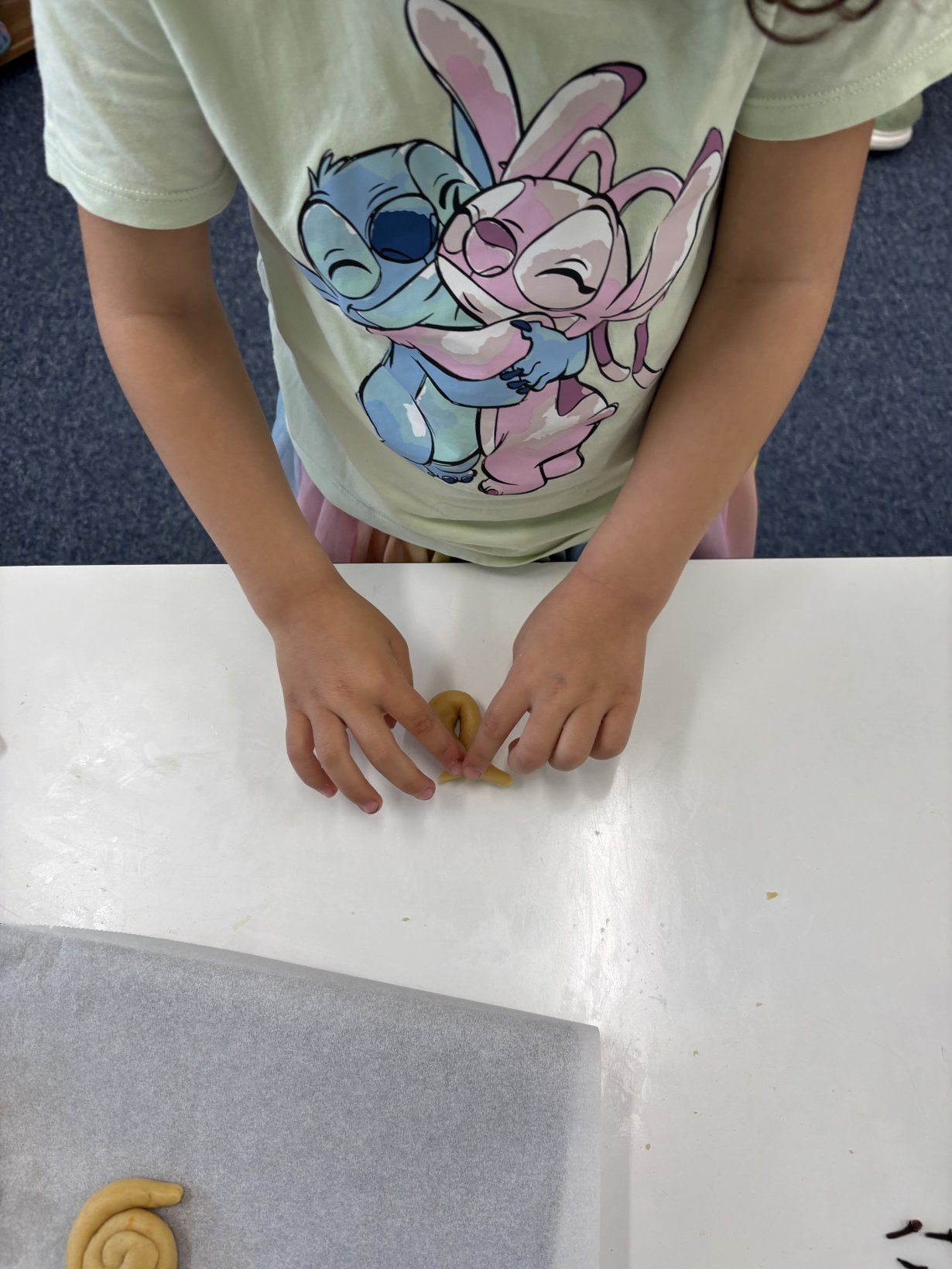Η γιορτινή διάθεση συνεχίστηκε με τα λαχταριστά πασχαλινά κουλουράκια που φτιάξαμε με τα χεράκια μας. Διαβάσαμε τη συνταγή, μετρήσαμε, ανακατέψαμε, ζυμώσαμε και πλάσαμε όμορφα λαγουδάκια. Όταν τα ψήσαμε το σχολείο μας μύρισε … Πάσχα!