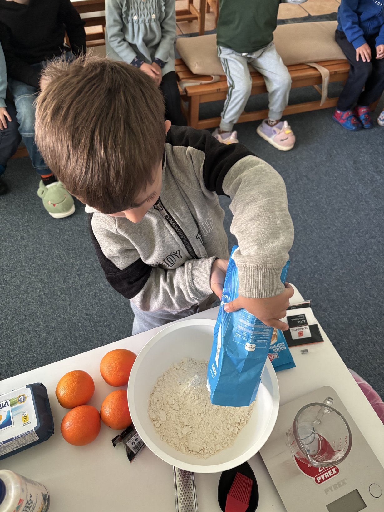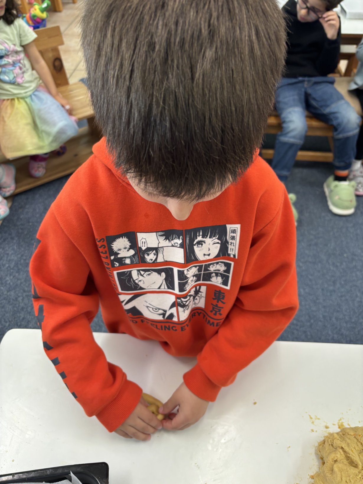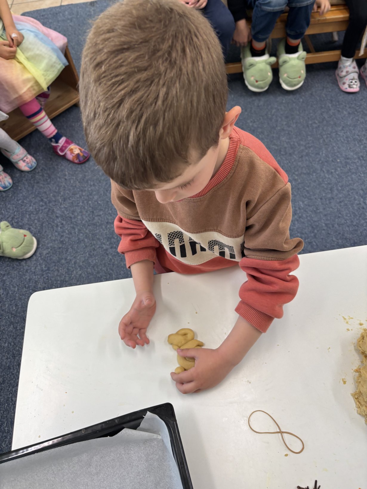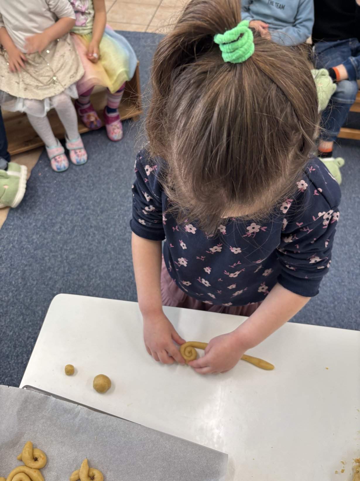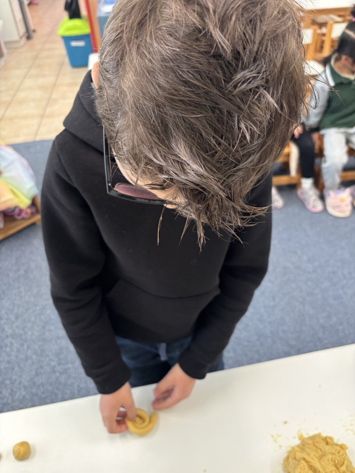 Η γιορτινή διάθεση συνεχίστηκε με τα λαχταριστά πασχαλινά κουλουράκια που φτιάξαμε με τα χεράκια μας. Διαβάσαμε τη συνταγή, μετρήσαμε, ανακατέψαμε, ζυμώσαμε και πλάσαμε όμορφα λαγουδάκια. Όταν τα ψήσαμε το σχολείο μας μύρισε … Πάσχα!