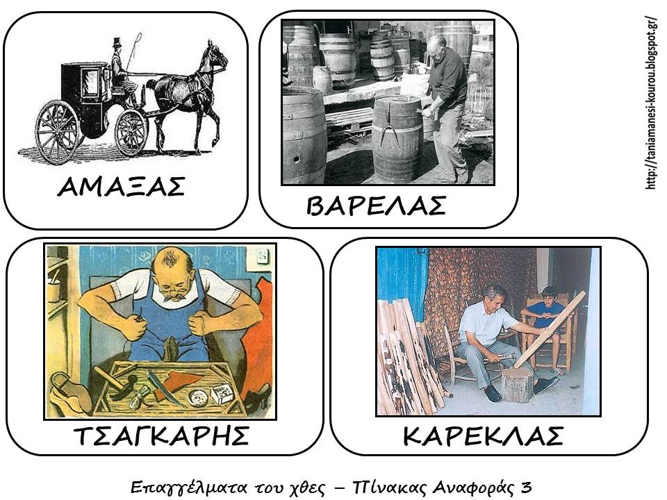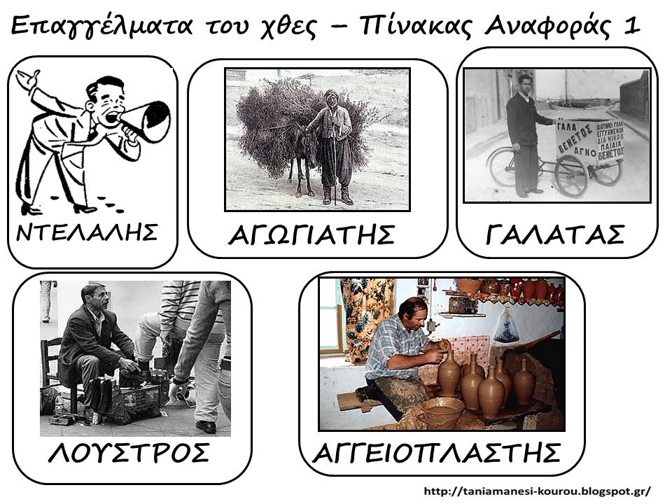 Δείτε πληροφοριες για τα παραδοσιακά επαγγέλματα πατώντας στον παρακάτω σύνδεσμο .Οταν επισκεφθείτε τη σελίδα πατάτε πάνω στα μπλέ γράμματα και βλέπετε τις πληροφοριες https://el.wikipedia.org/wiki/