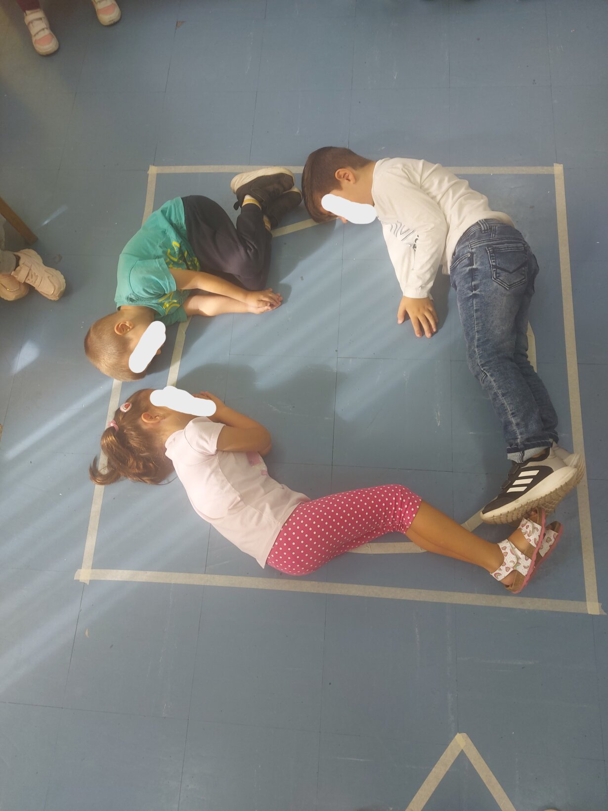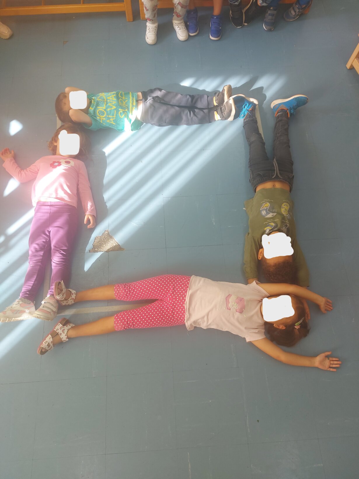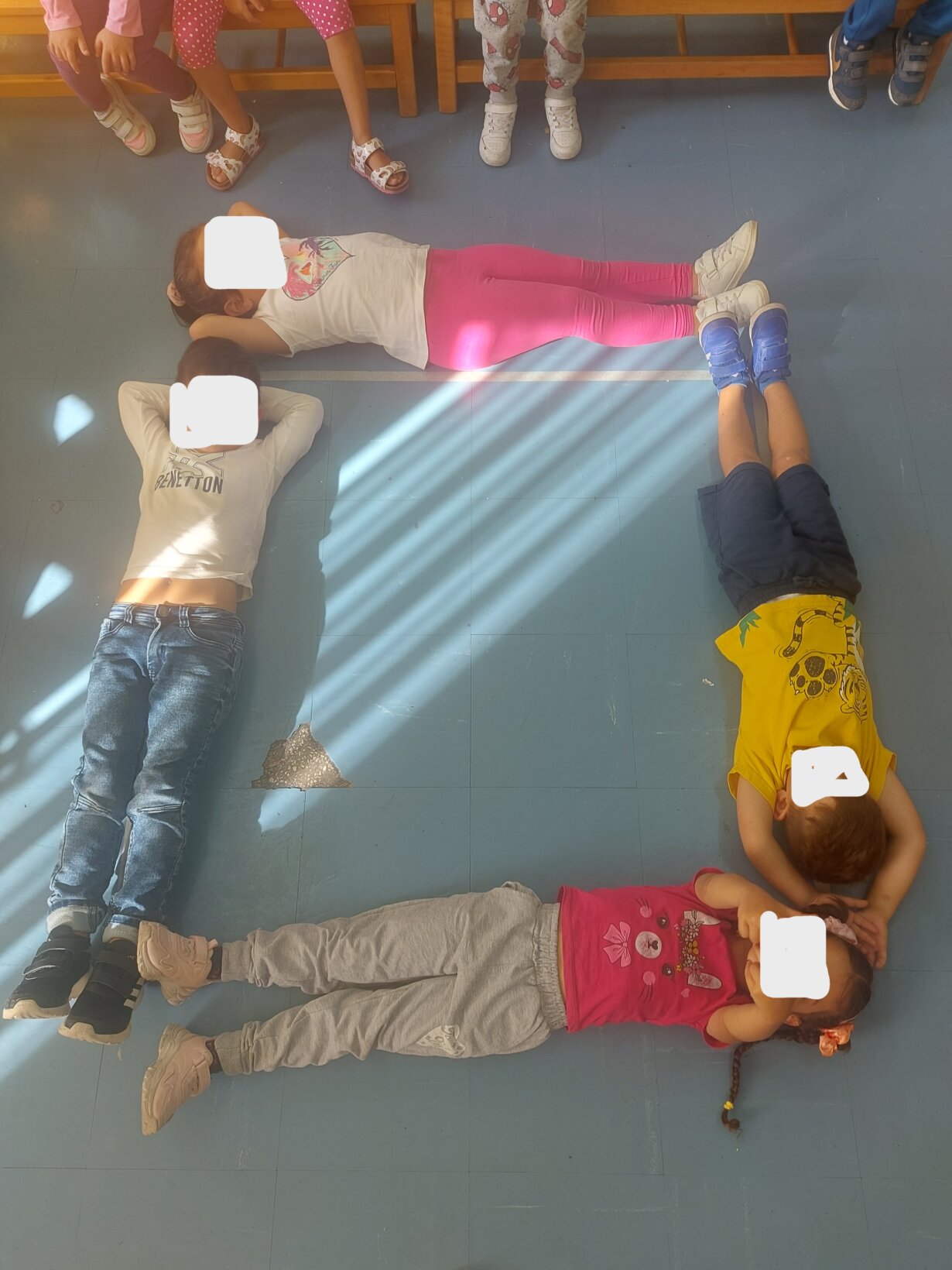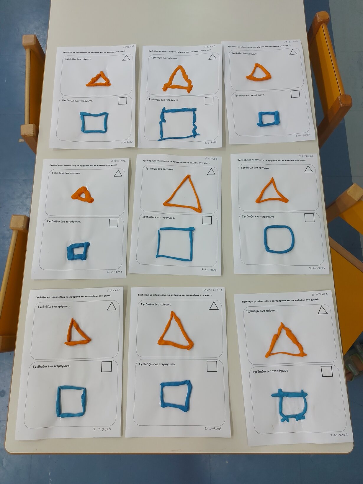 Αναφέραμε όλα τα επίπεδα σχήματα και προσπαθήσαμε να τα κατανοήσουμε. Σε αυτό βοήθησε η σκέψη να σχηματίσουμε τα σχήματα στο πάτωμα. Αφού τα περπατήσαμε, αποφασίσαμε να τα σχηματίσουμε με το σώμα μας. Και τα αποτελέσματα ήταν εξαιρετικά.