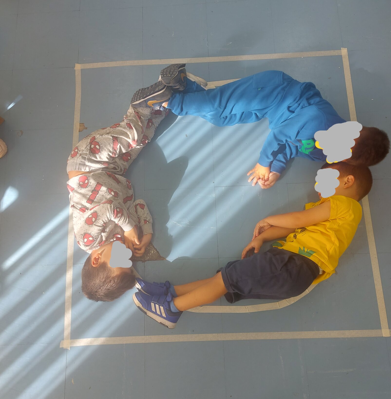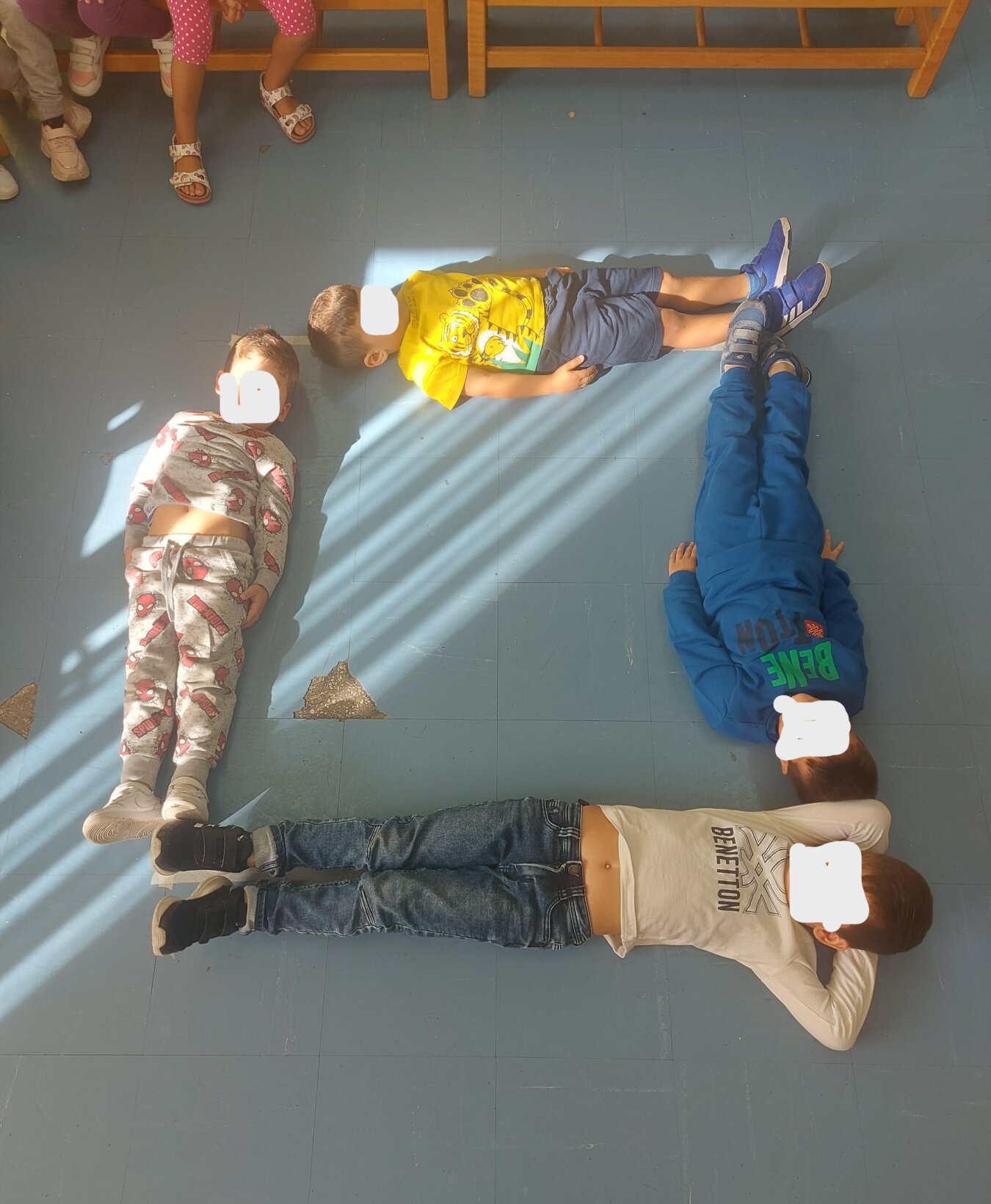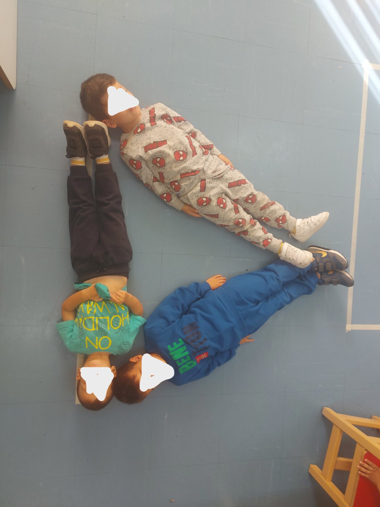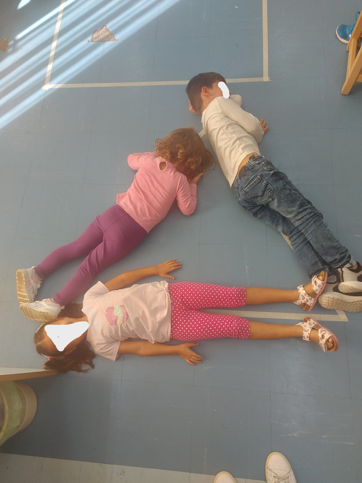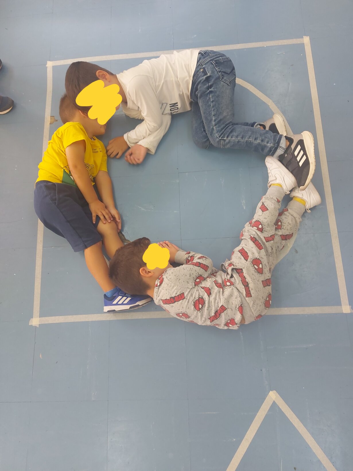 Αναφέραμε όλα τα επίπεδα σχήματα και προσπαθήσαμε να τα κατανοήσουμε. Σε αυτό βοήθησε η σκέψη να σχηματίσουμε τα σχήματα στο πάτωμα. Αφού τα περπατήσαμε, αποφασίσαμε να τα σχηματίσουμε με το σώμα μας. Και τα αποτελέσματα ήταν εξαιρετικά.