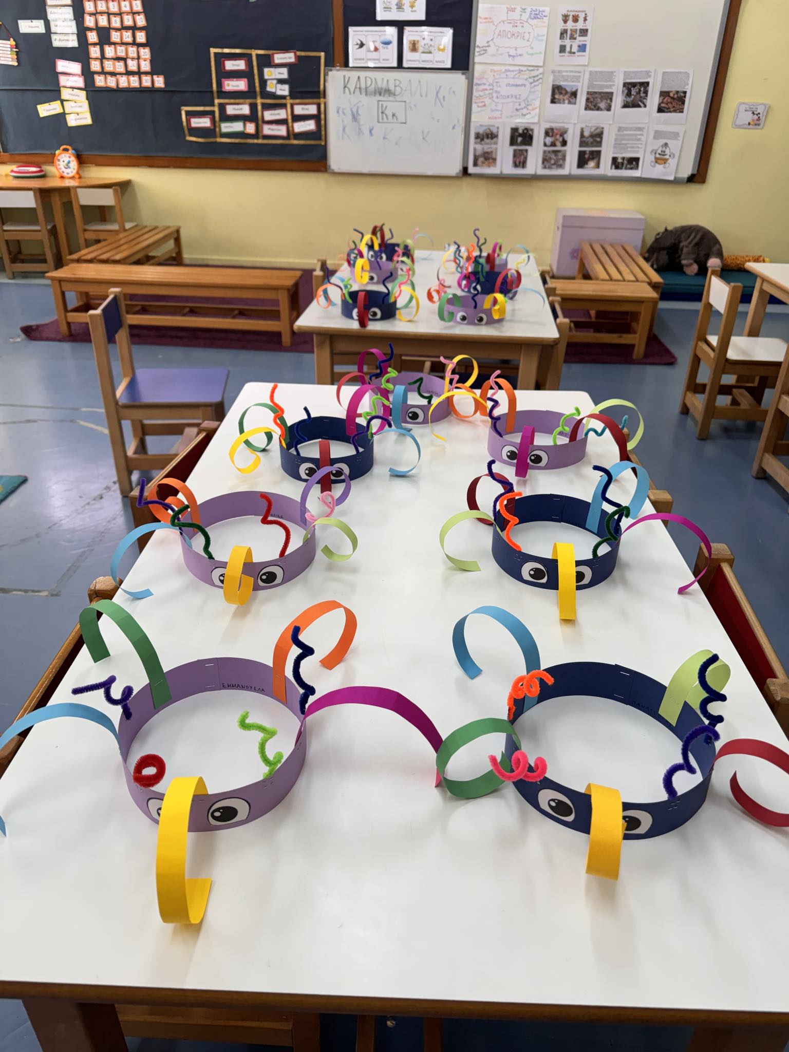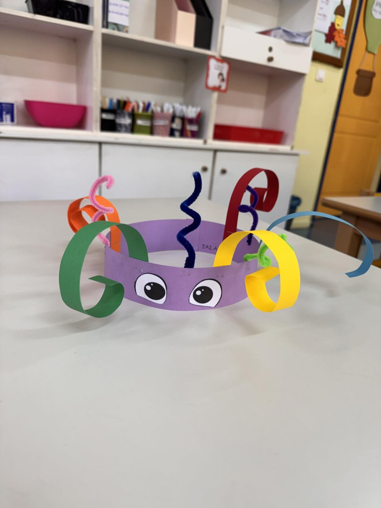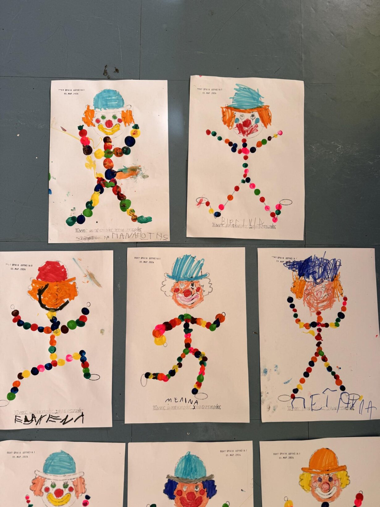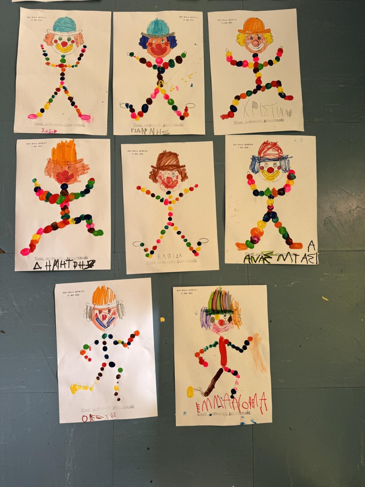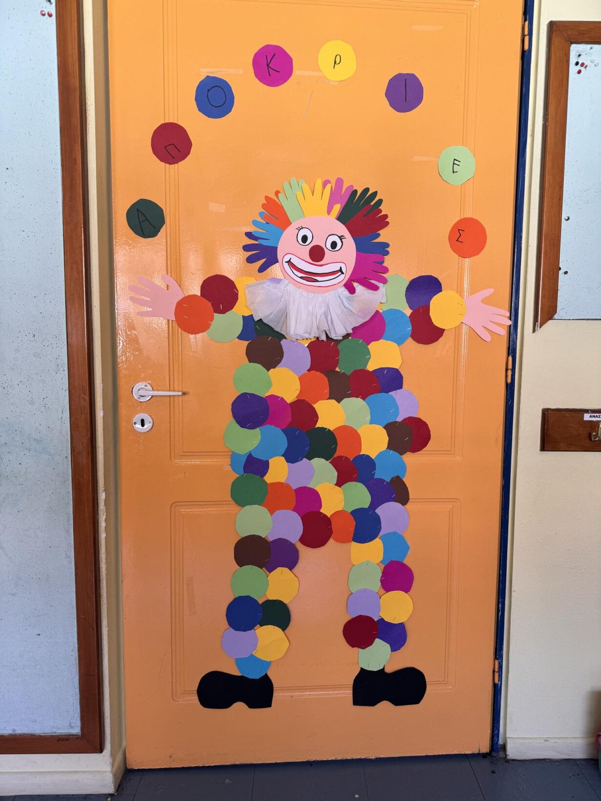 Ο στολισμός της τάξης ήταν επιθυμία των παιδιών κι εμείς χατίρια δεν χαλάμε. Πρώτη κατασκευή ο αυτοσχέδιος κλόουν μας να μας καλημερίζει την πόρτα. Κόλλες, ψαλίδια και χαρτόνια πήραν φωτιά. και ο κλόουν από κύκλους έτοιμος.