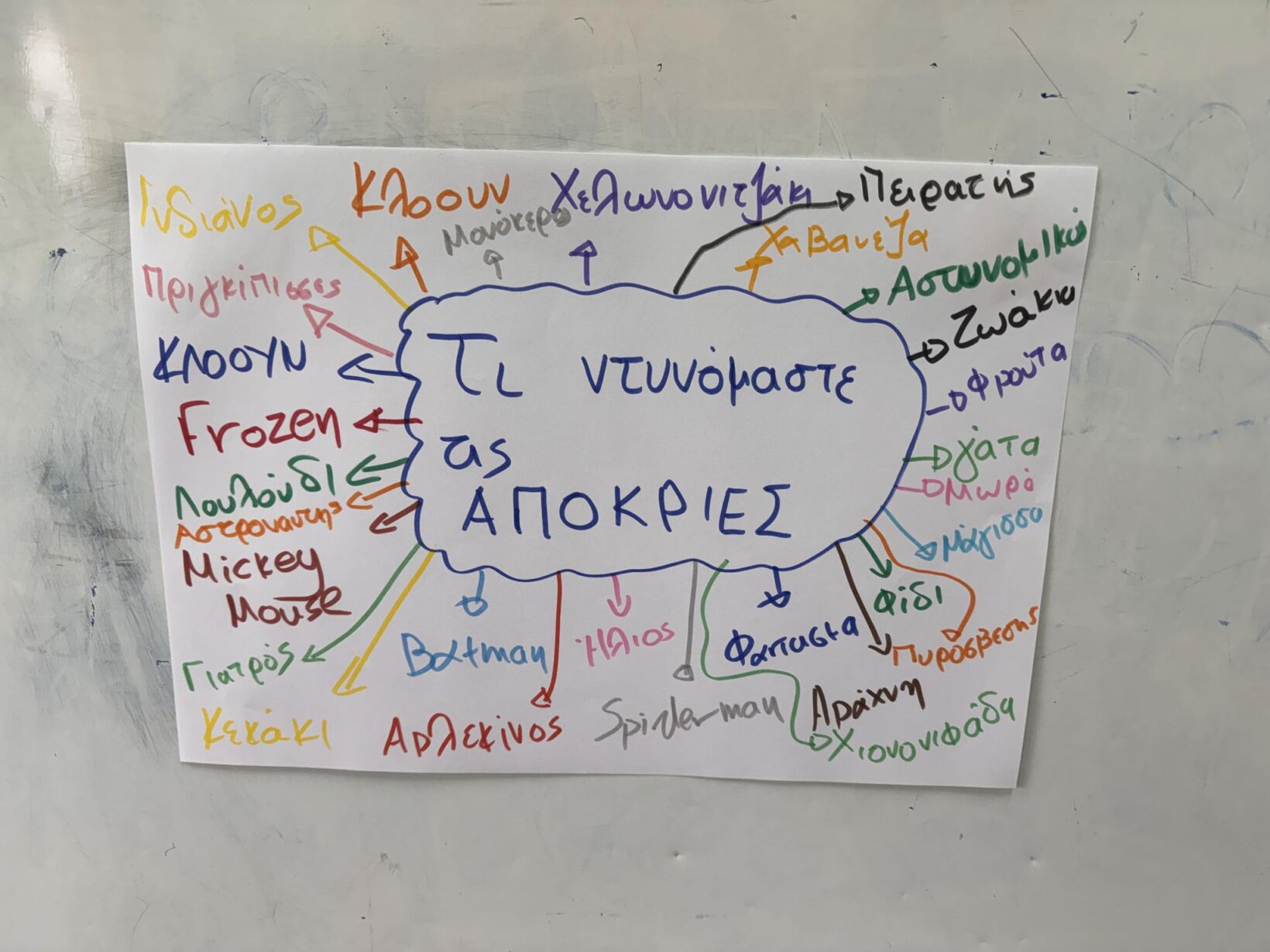 Ωστόσο ήταν πολύ ενδιαφέρον για τα παιδιά να αναφερθούμε στις απόκριες με τον τρόπο που αυτά τις ξέρουν και να καταγράψουμε τι στολές θα ήθελαν να φορέσουν στο Καρναβάλι.