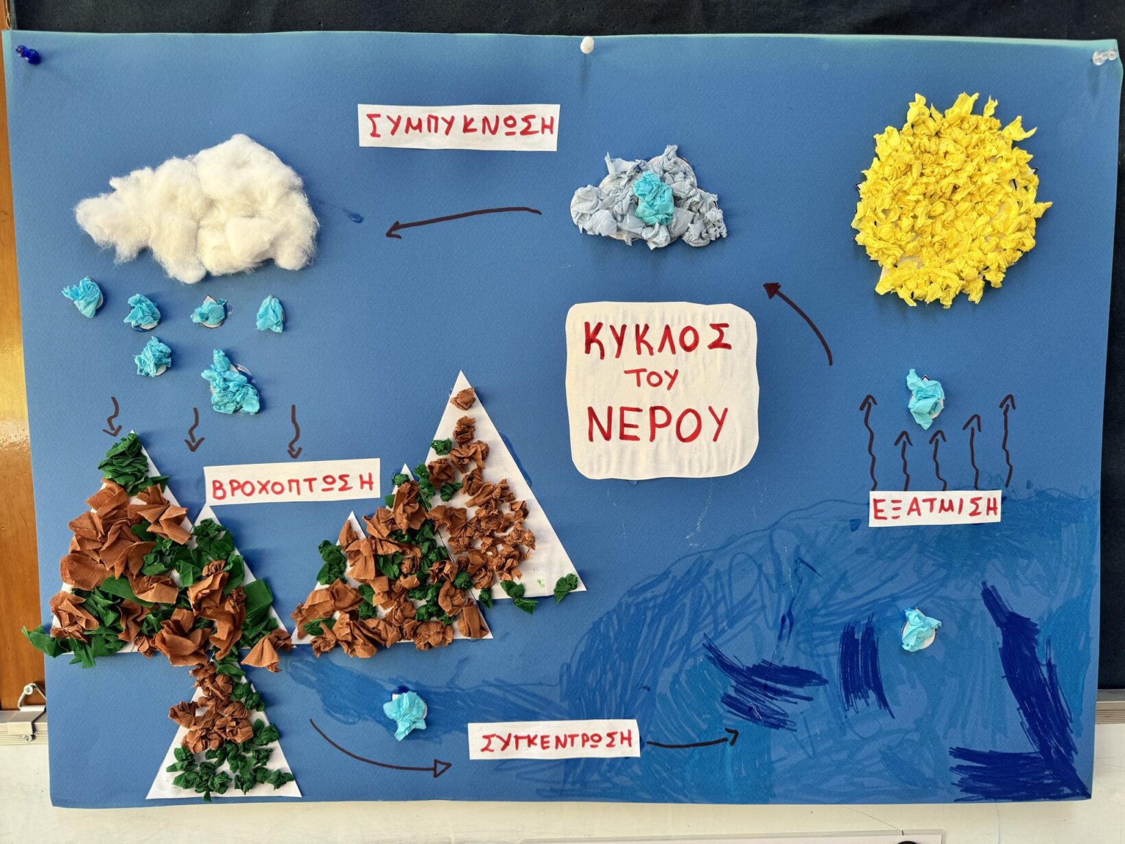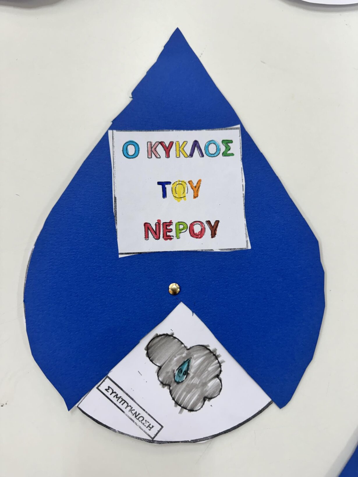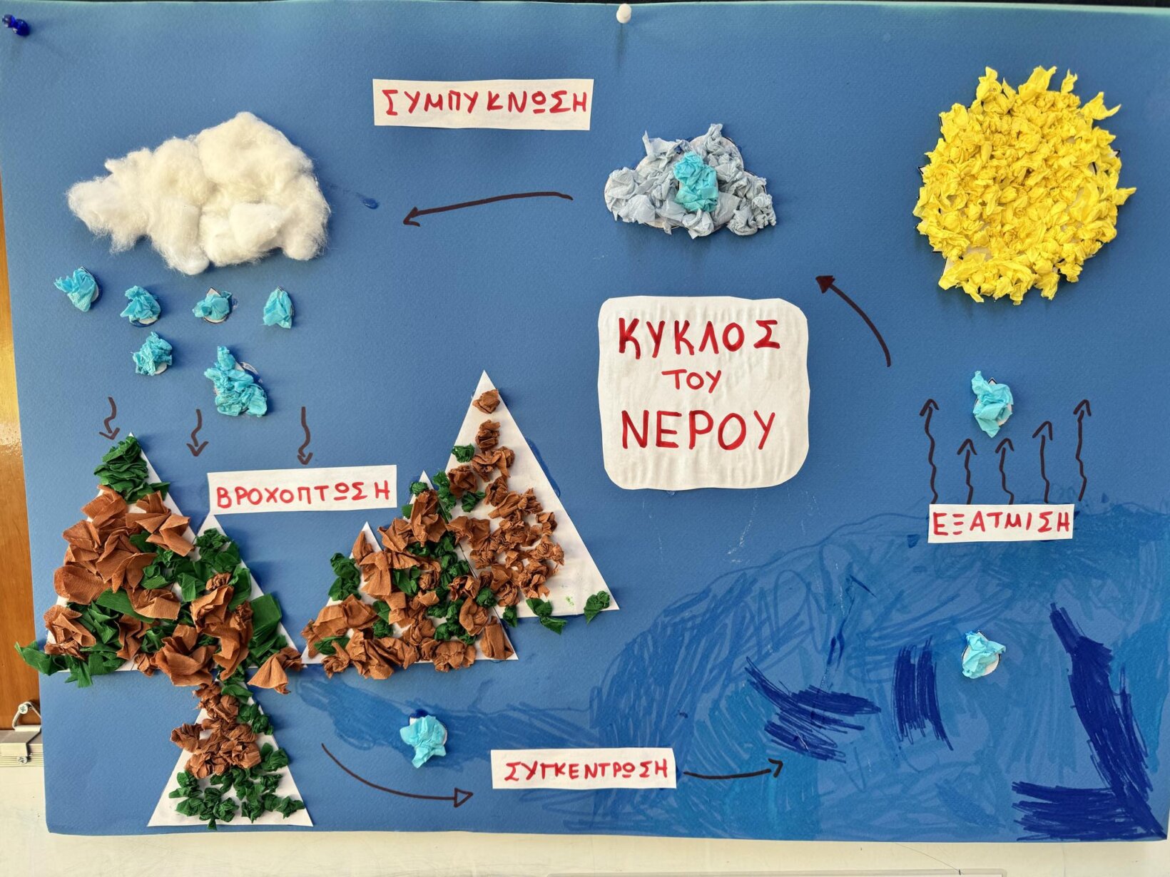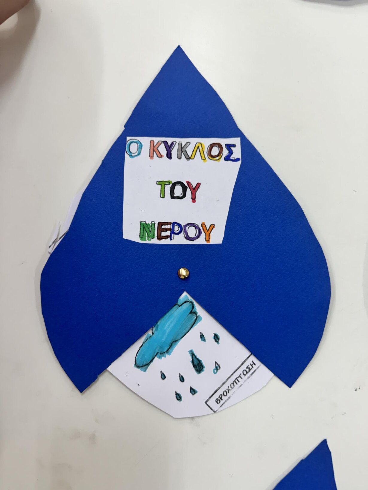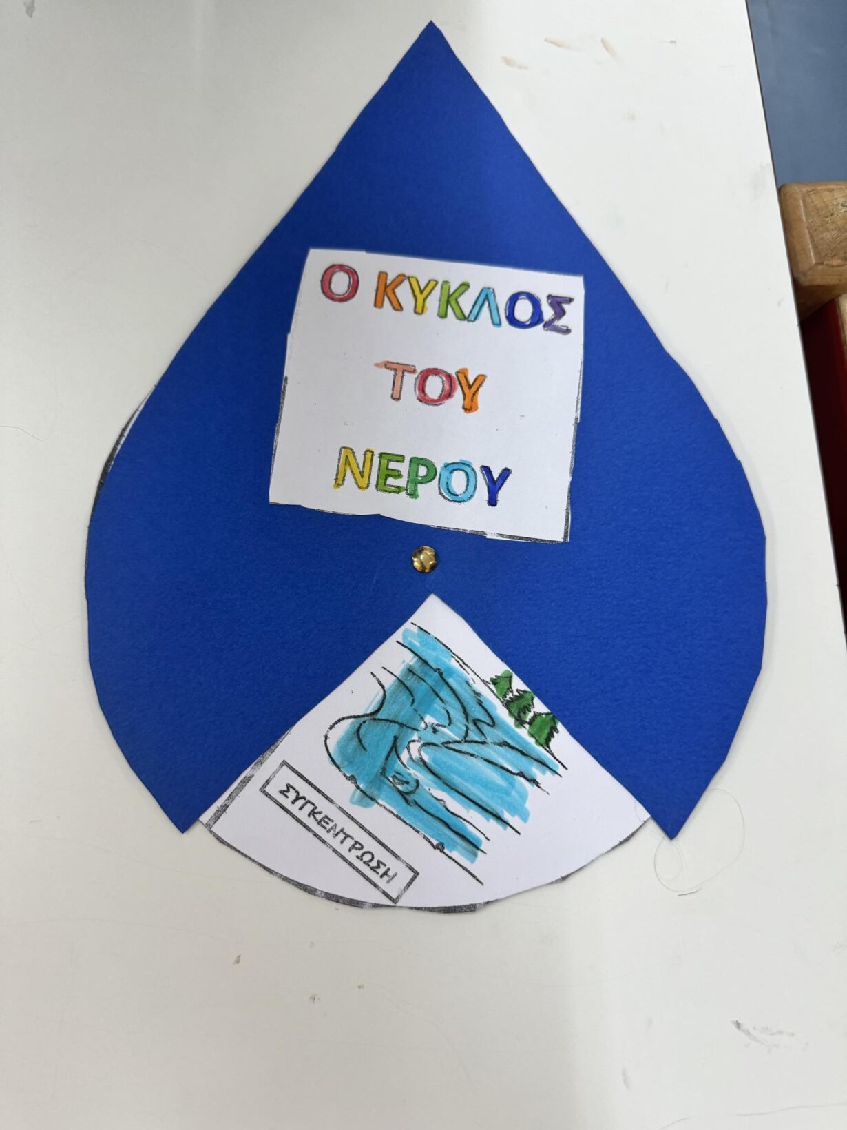 Αφού γνωρίσαμε τον κύκλο του νερού, πήραμε την απόφαση να φτιάξουμε την δική μας μακέτα για την απεικόνιση του ταξιδιού της σταγόνας. Πιάσαμε χαρτόνια, κόλλες, ψαλίδια, μαρκαδόρους και ότι άλλο υλικό χρειαζόμασταν και αρχίσαμε δουλεια.