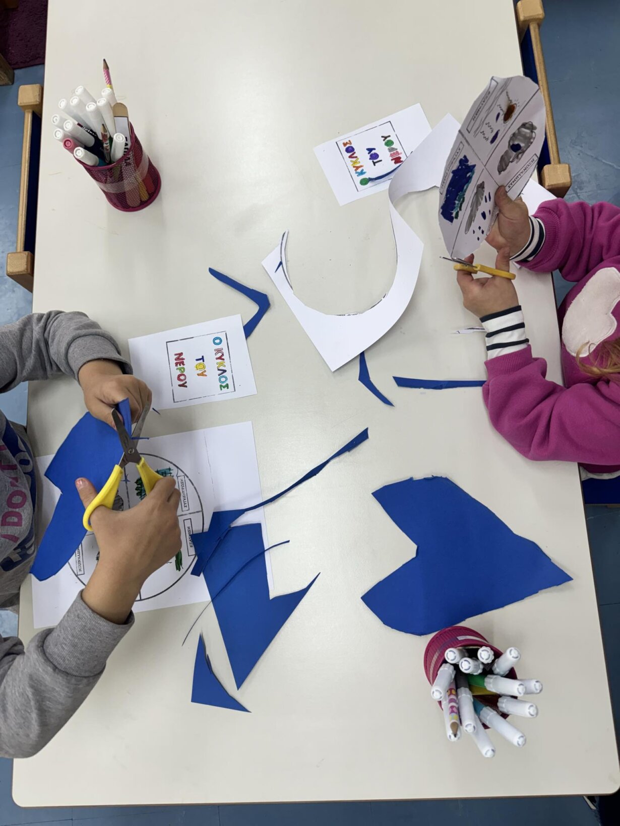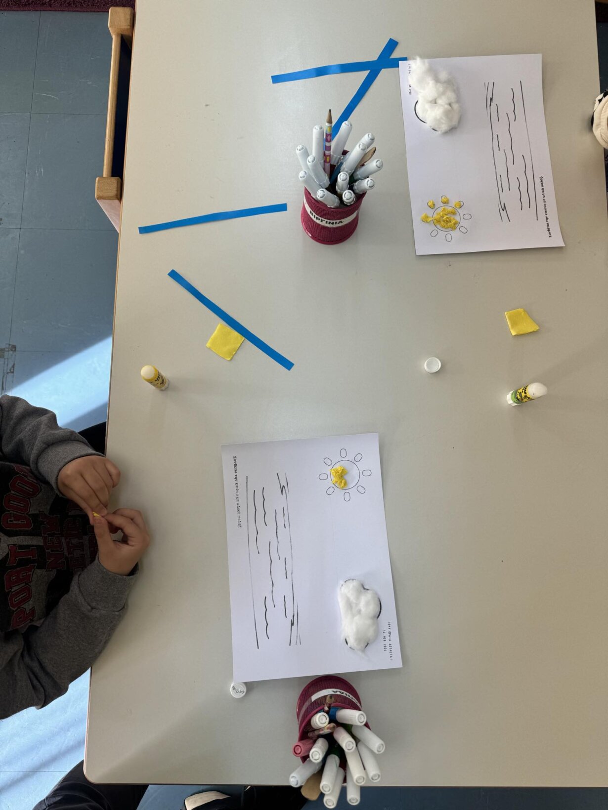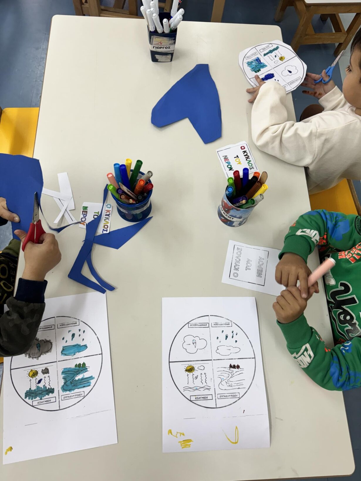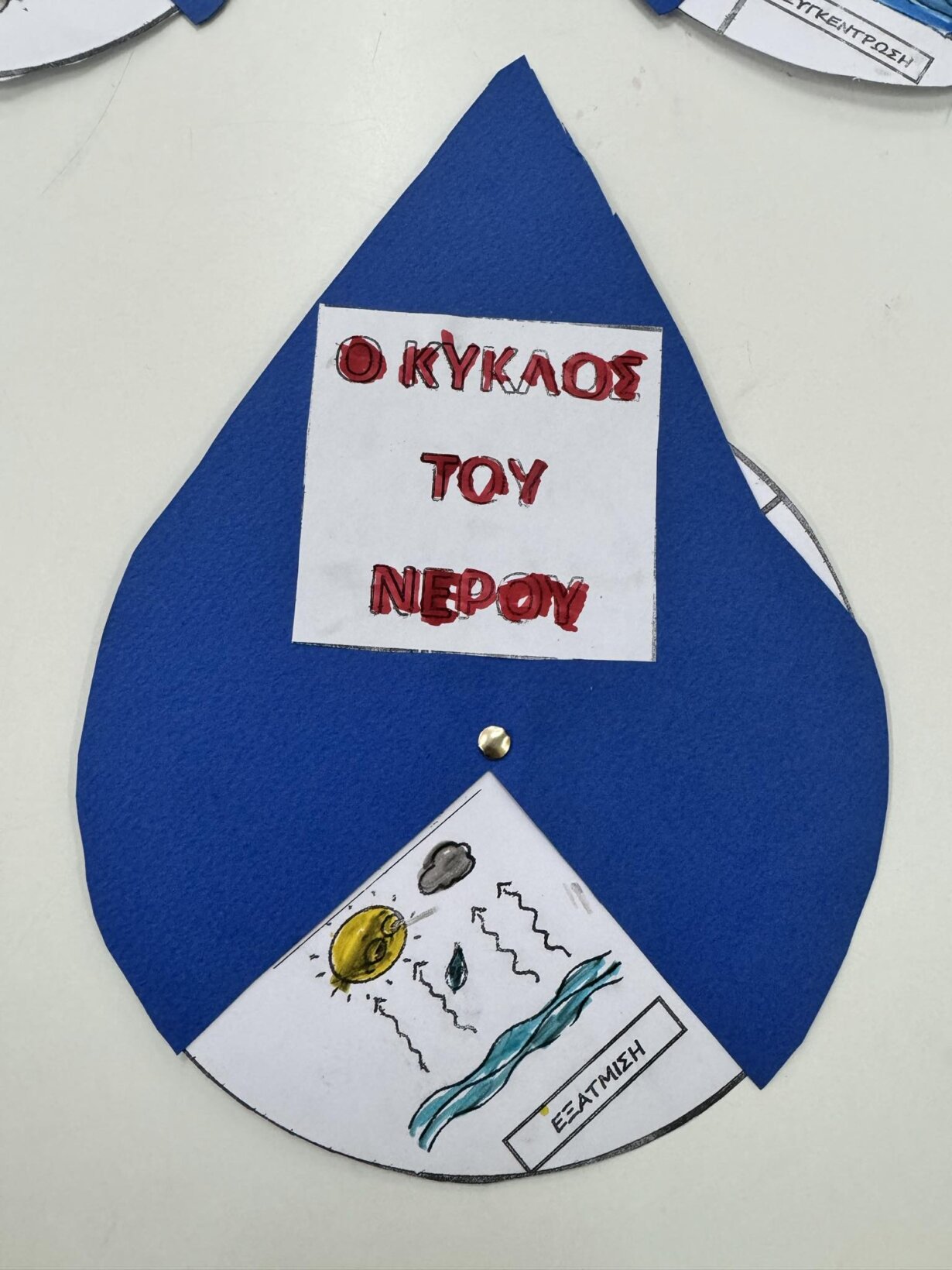 Αφού γνωρίσαμε τον κύκλο του νερού, πήραμε την απόφαση να φτιάξουμε την δική μας μακέτα για την απεικόνιση του ταξιδιού της σταγόνας. Πιάσαμε χαρτόνια, κόλλες, ψαλίδια, μαρκαδόρους και ότι άλλο υλικό χρειαζόμασταν και αρχίσαμε δουλεια.