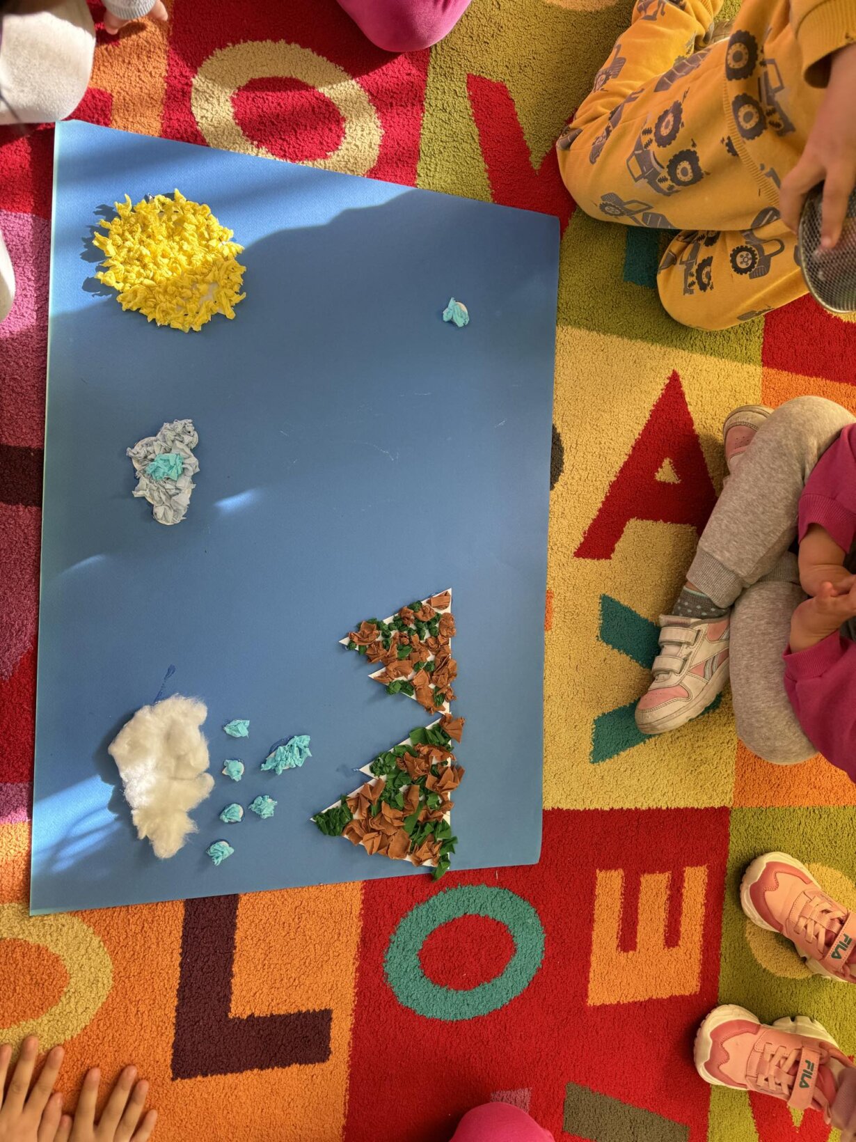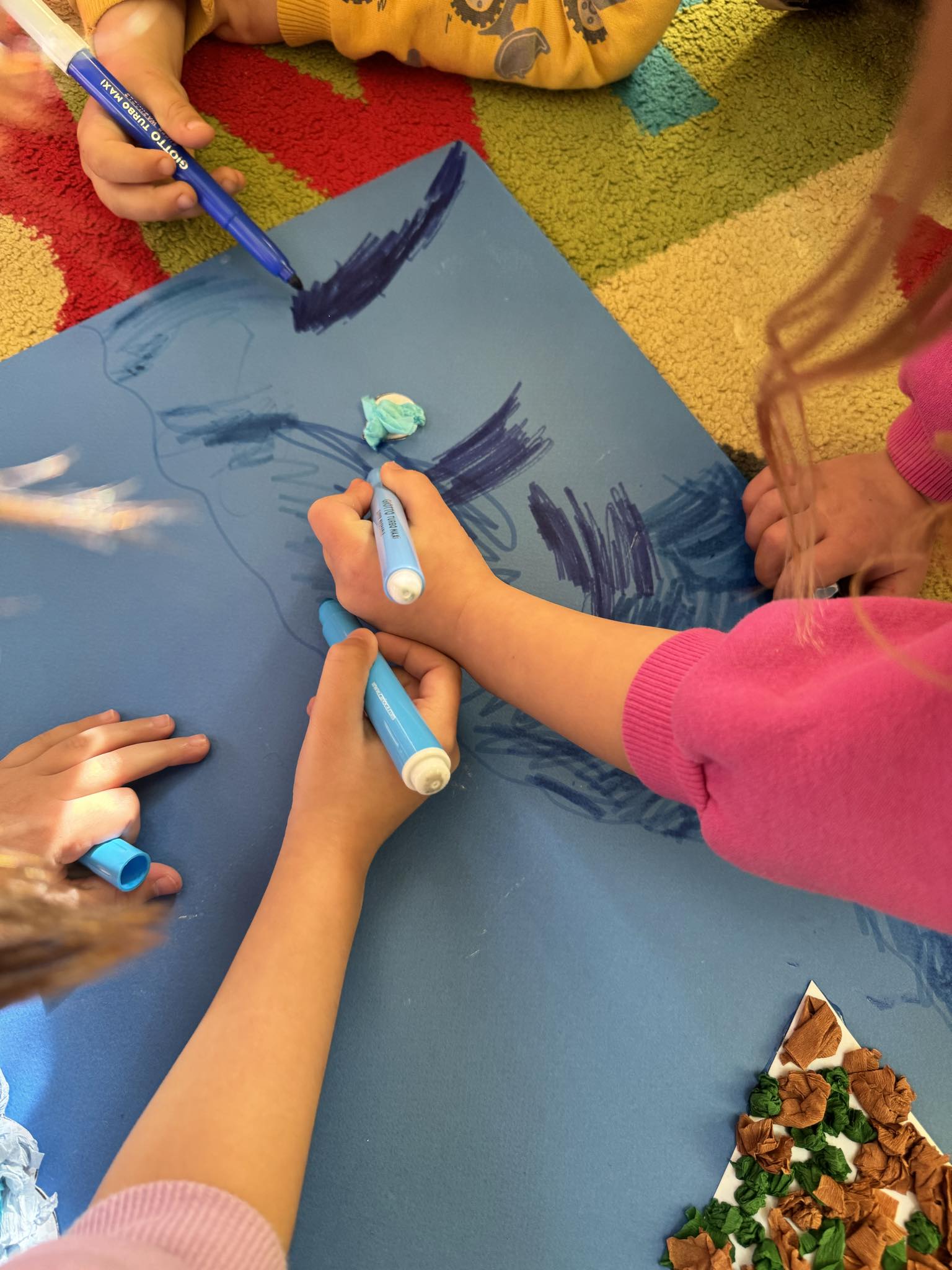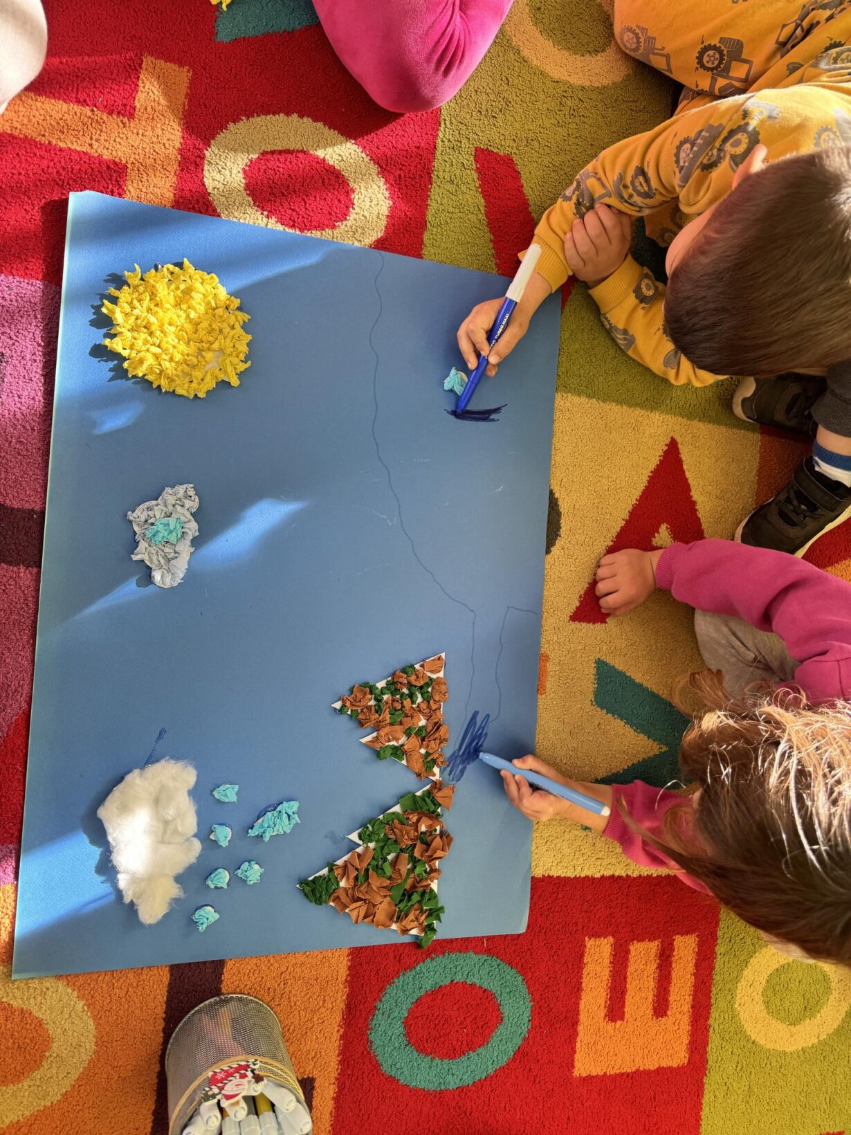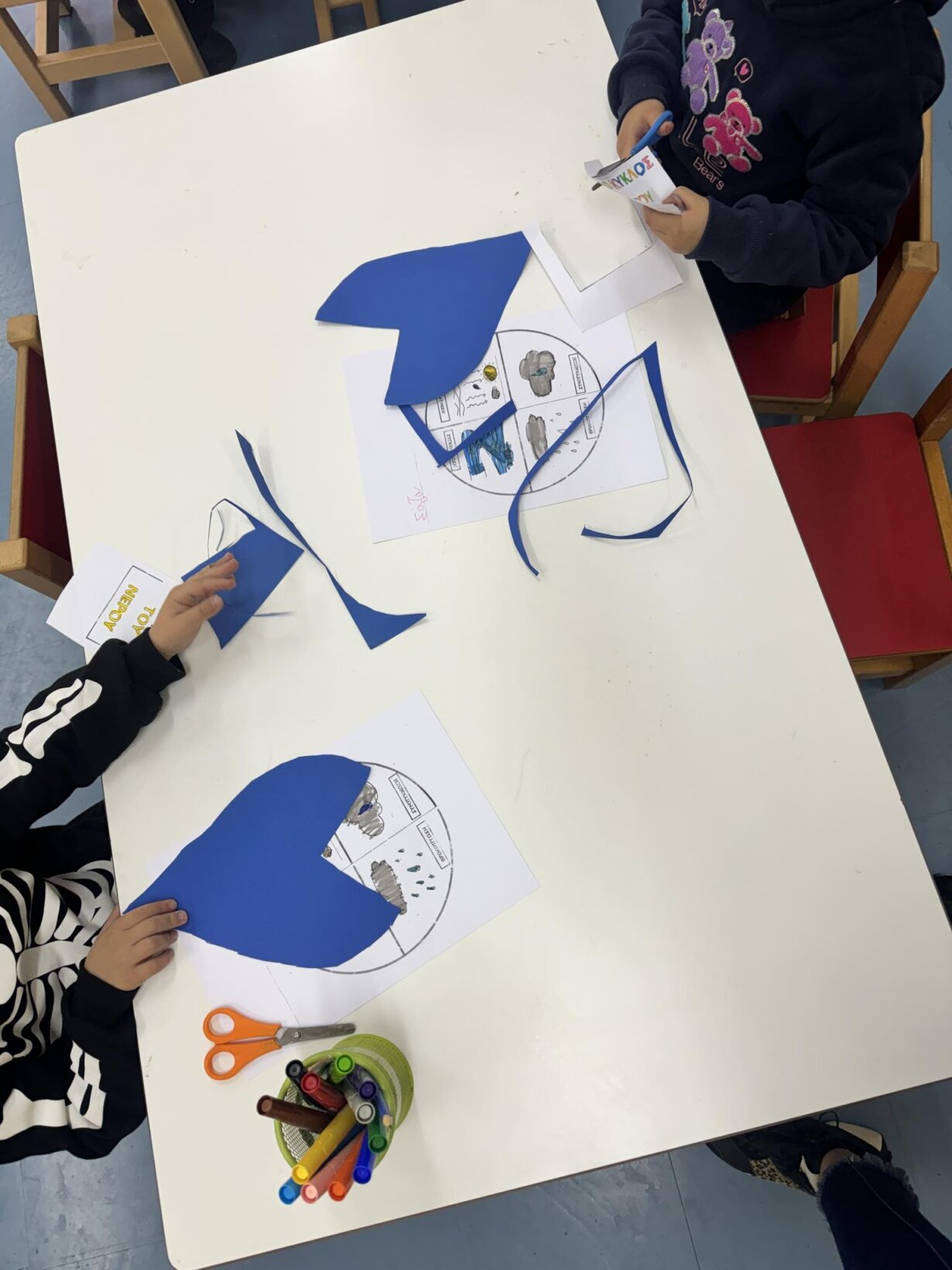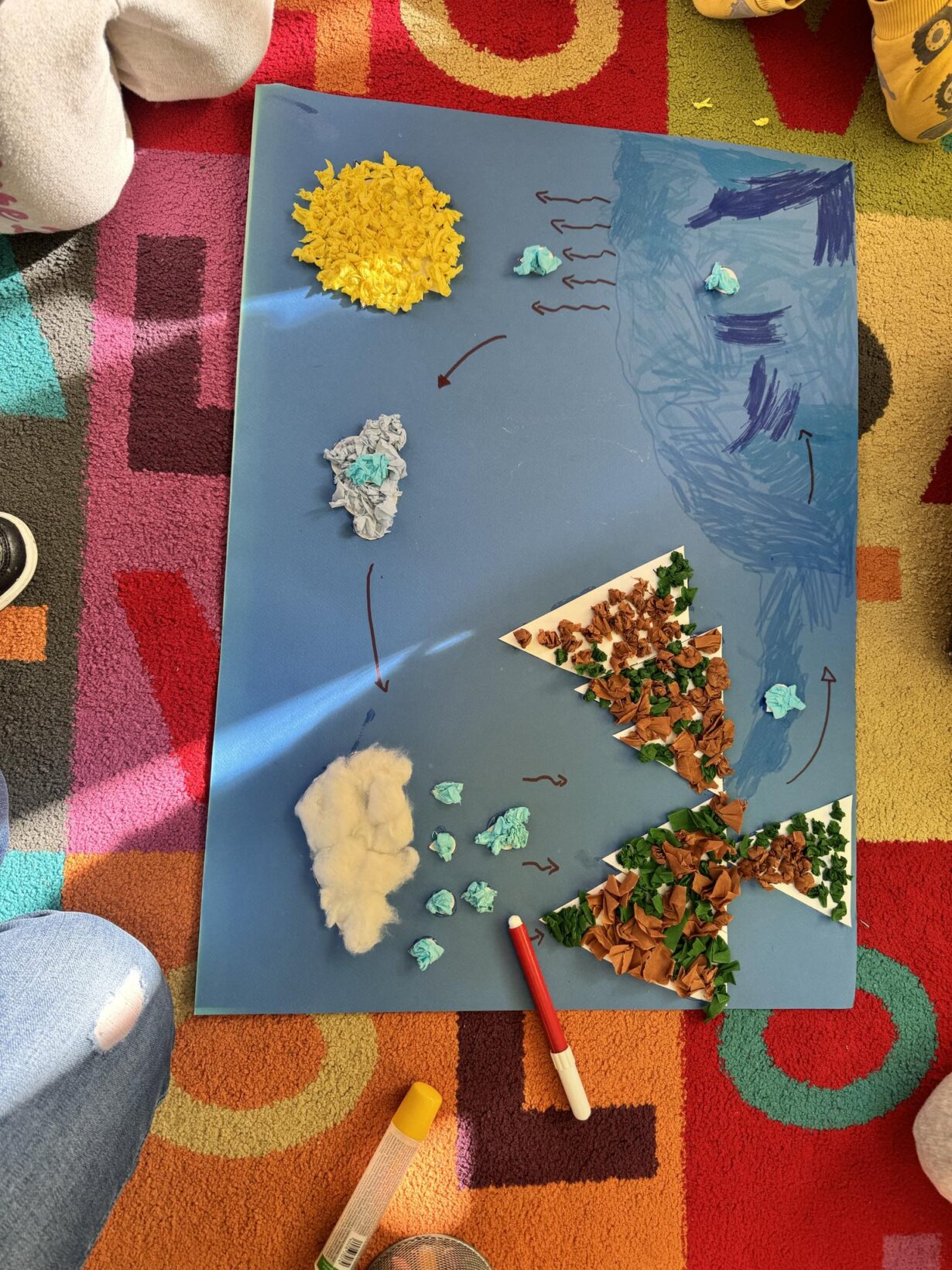 Αφού γνωρίσαμε τον κύκλο του νερού, πήραμε την απόφαση να φτιάξουμε την δική μας μακέτα για την απεικόνιση του ταξιδιού της σταγόνας. Πιάσαμε χαρτόνια, κόλλες, ψαλίδια, μαρκαδόρους και ότι άλλο υλικό χρειαζόμασταν και αρχίσαμε δουλεια.