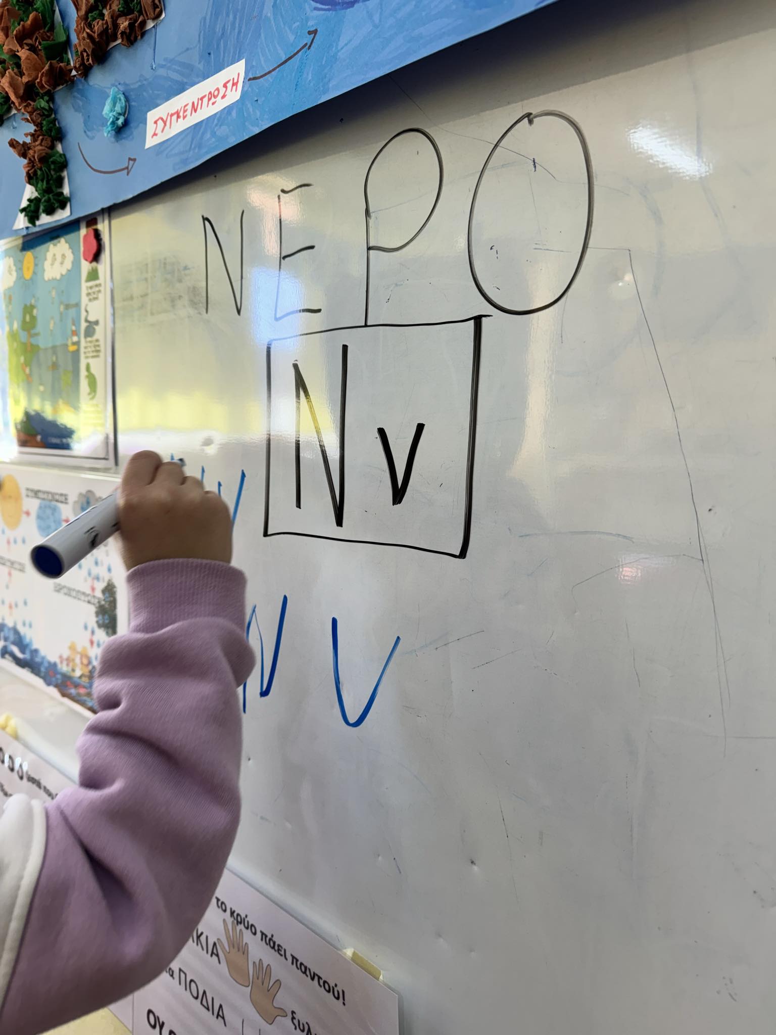 Με αφορμή τον κύκλο του νερού, γνωρίσαμε το γράμμα Νν. Το γράψαμε, βρήκαμε λέξεις και ακούσαμε γλωσσοδέτες.