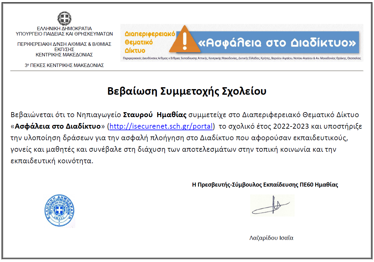 Το Νηπιαγωγείο μας τη σχολική χρονιά 2022-23 εντάχθηκε για τρίτη χρονιά στο Διαπεριφερειακό Θεματικό Δίκτυο «Ασφάλεια στο Διαδίκτυο».