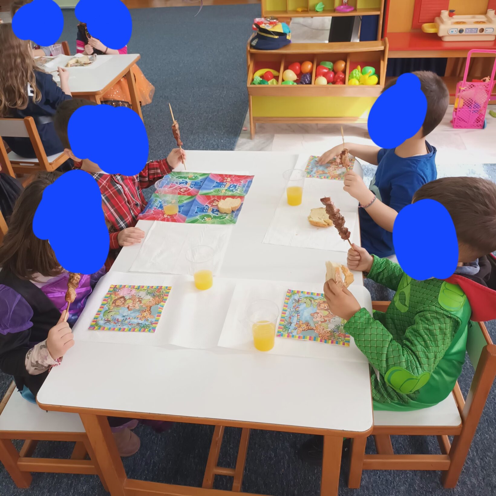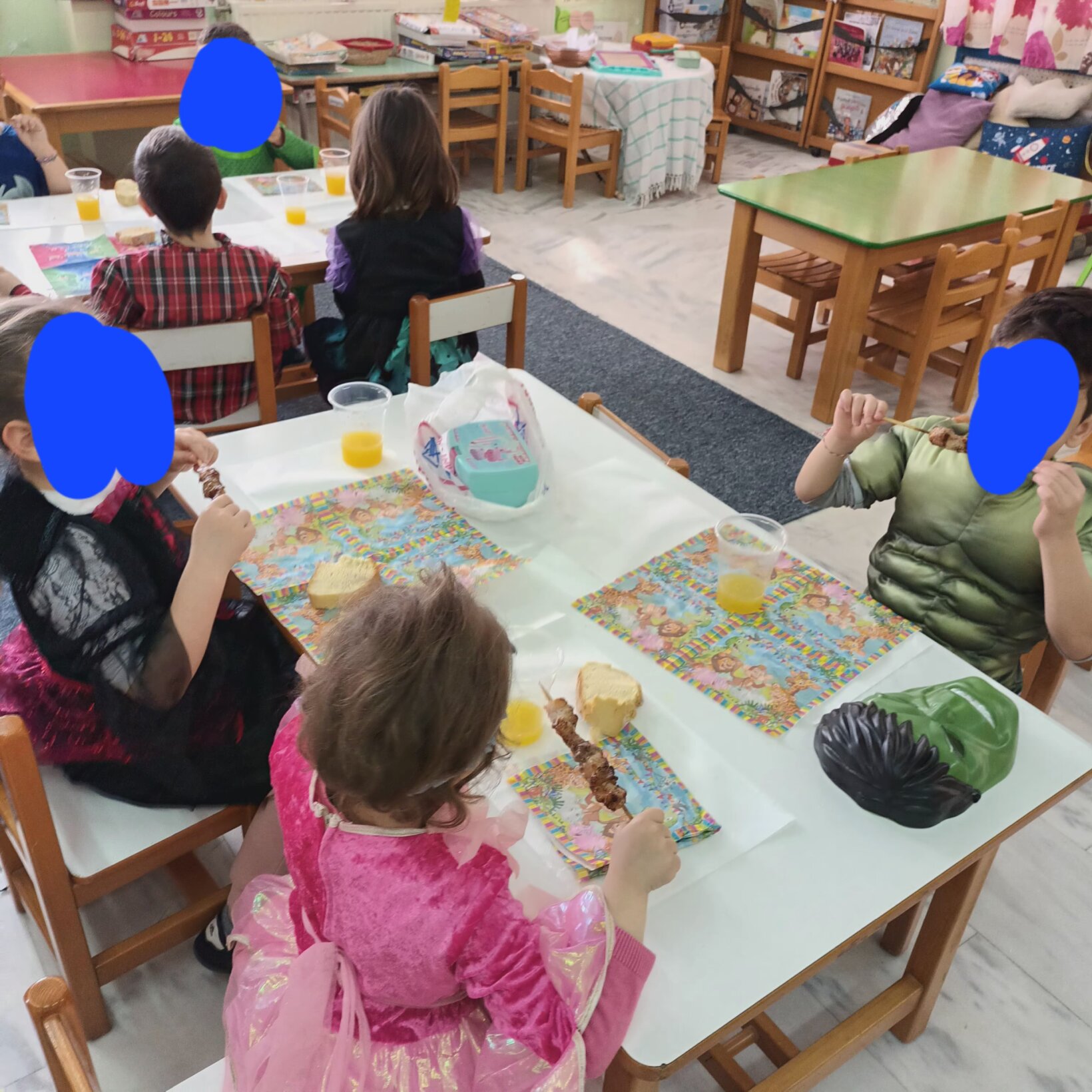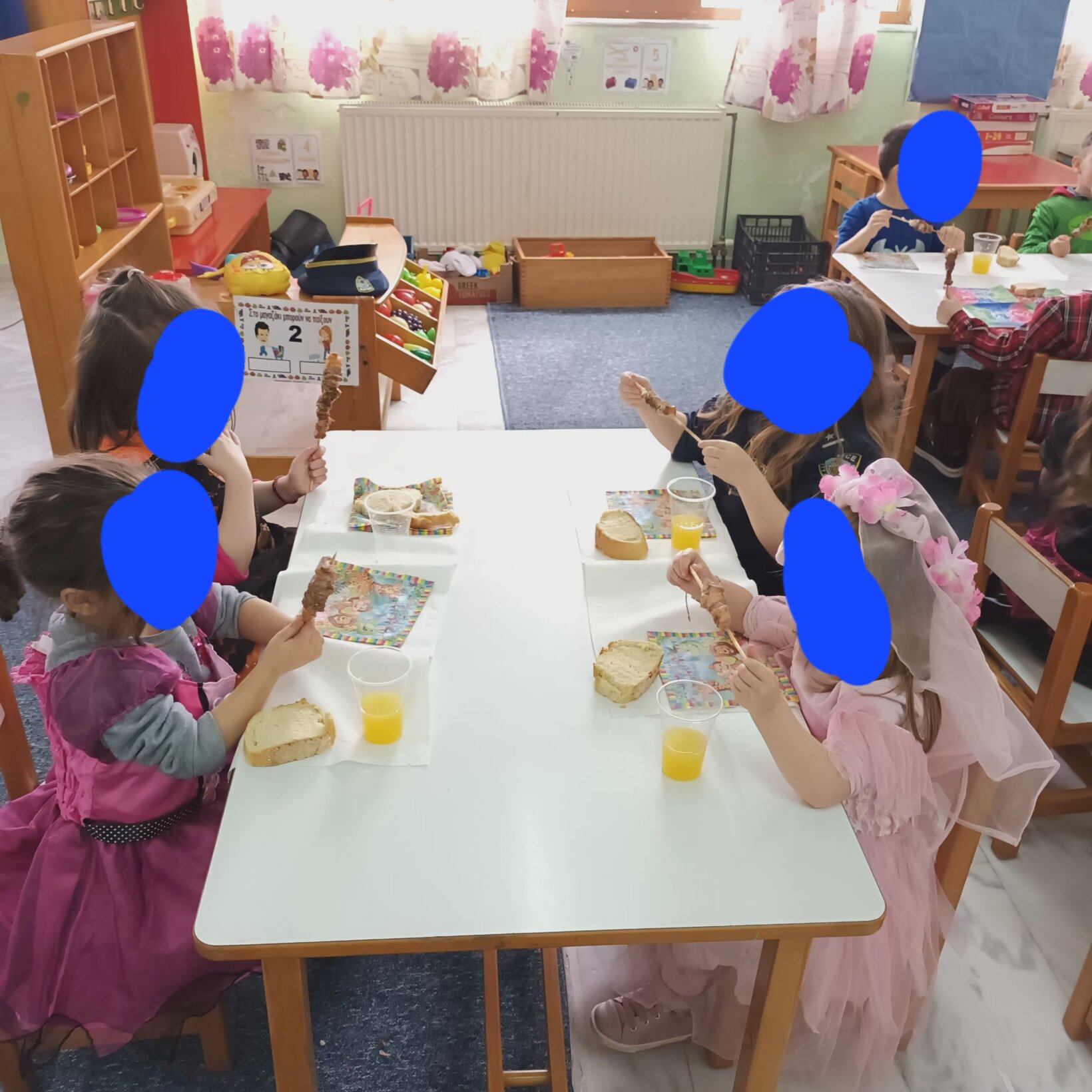 Τσικνοπέμπτη Τα παιδιά ντυμένα με τις αποκριάτικες στολές τους,χόρεψαν ,έπαιξαν, και με μέριμνα των γονέων έφαγαν τα καθιερωμένα σουβλάκια.