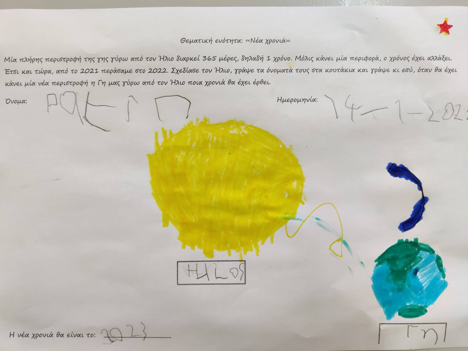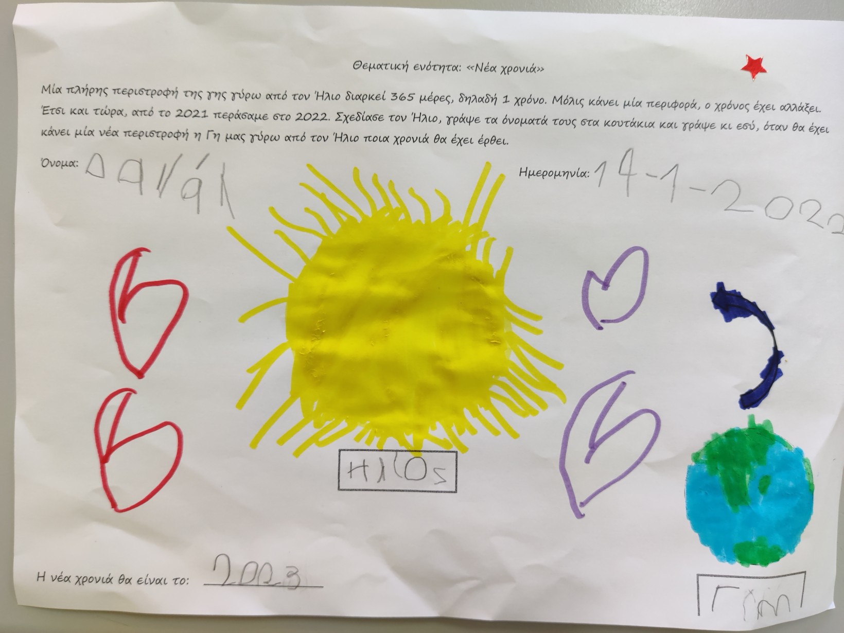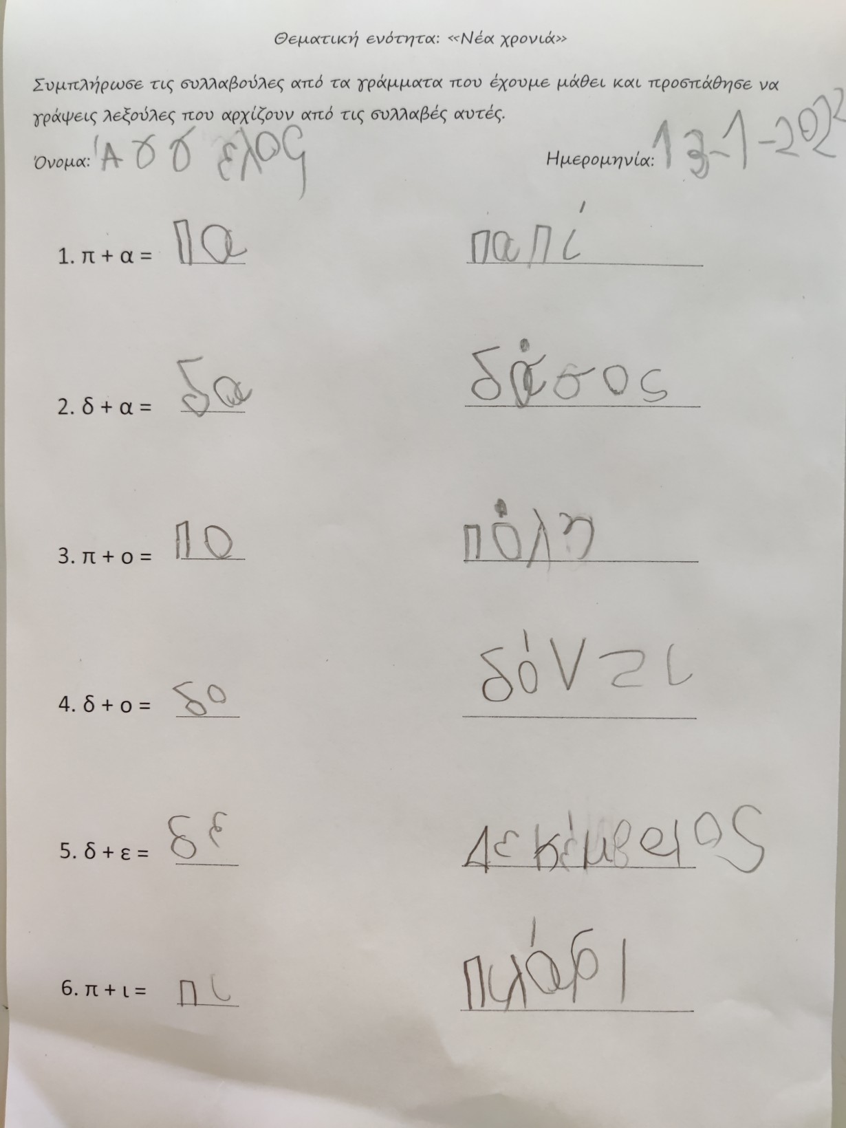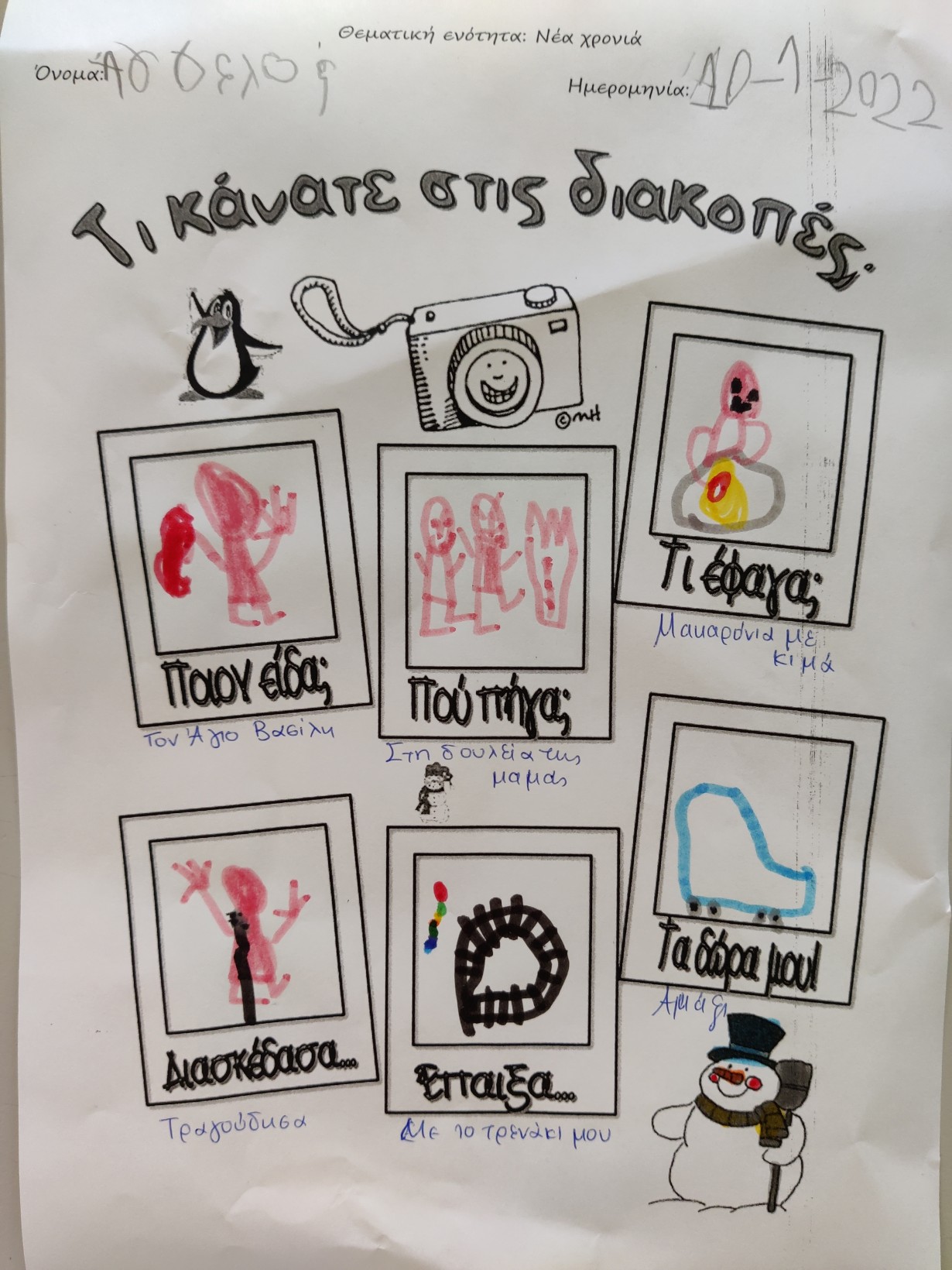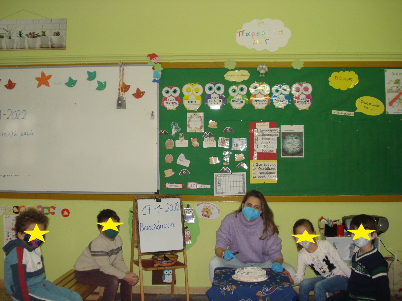 1.2345 Φτιάχνοντας τα γούρια για τη φετινή χρονιά.1234567 Ζωγραφίζοντας τη νέα χρονιά, τους μήνες και τις εποχές της με ωραία χρώματα και πολλές ελπίδες.1234567 Γιατί αλλάζουν οι χρονιές; Πόσες μέρες έχει ο χρόνος; Και ποιος ο ρόλος της Γης και του Ήλιου σε αυτή την αλλαγή; ΠείραμαΓίναμε Γη και Ήλιος.Τους ζωγραφίσαμε1και καταγράψαμε τις νέες μας γνώσεις.23456 Επανάληψη στα γραμματάκια που έχουμε μάθει έως τώρα. Μπορούμε να δημιουργήσουμε συλλαβούλες με αυτά και να σχηματίσουμε λέξεις;123456 Και φυσικά, τηρήσαμε και φέτος το έθιμο της βασιλόπιτας.Την κόψαμε,τηρώντας τα υγειονομικά πρωτόκολλα,τη μοιράσαμε σε σακουλάκια για να την απολαύσουμε στο σπίτι με ασφάλειακαι πήραμε και τα δωράκια μας,για το καλό.Έχουμε νικητή! Πάντα τυχερός να είσαι Παντελή μου!Και του χρόνου με υγεία!