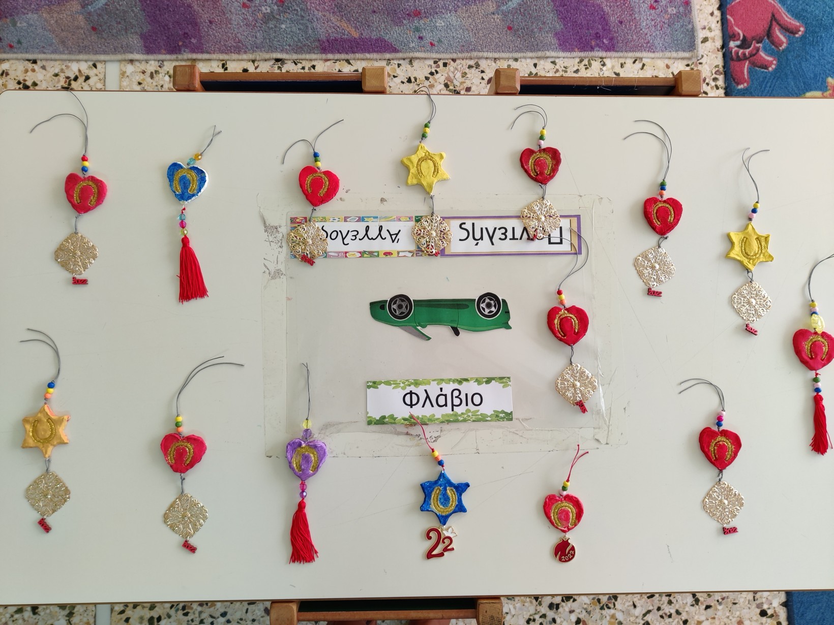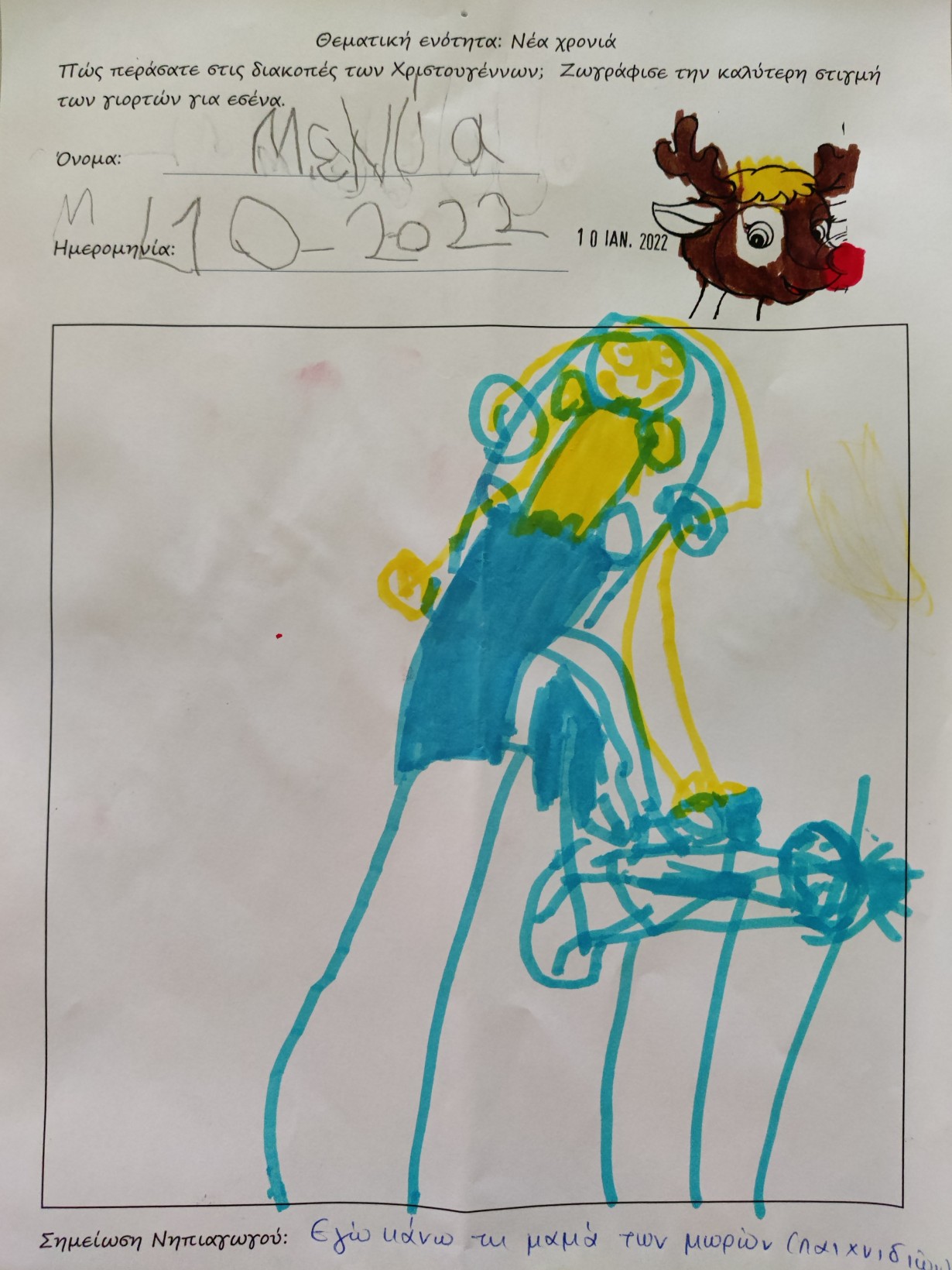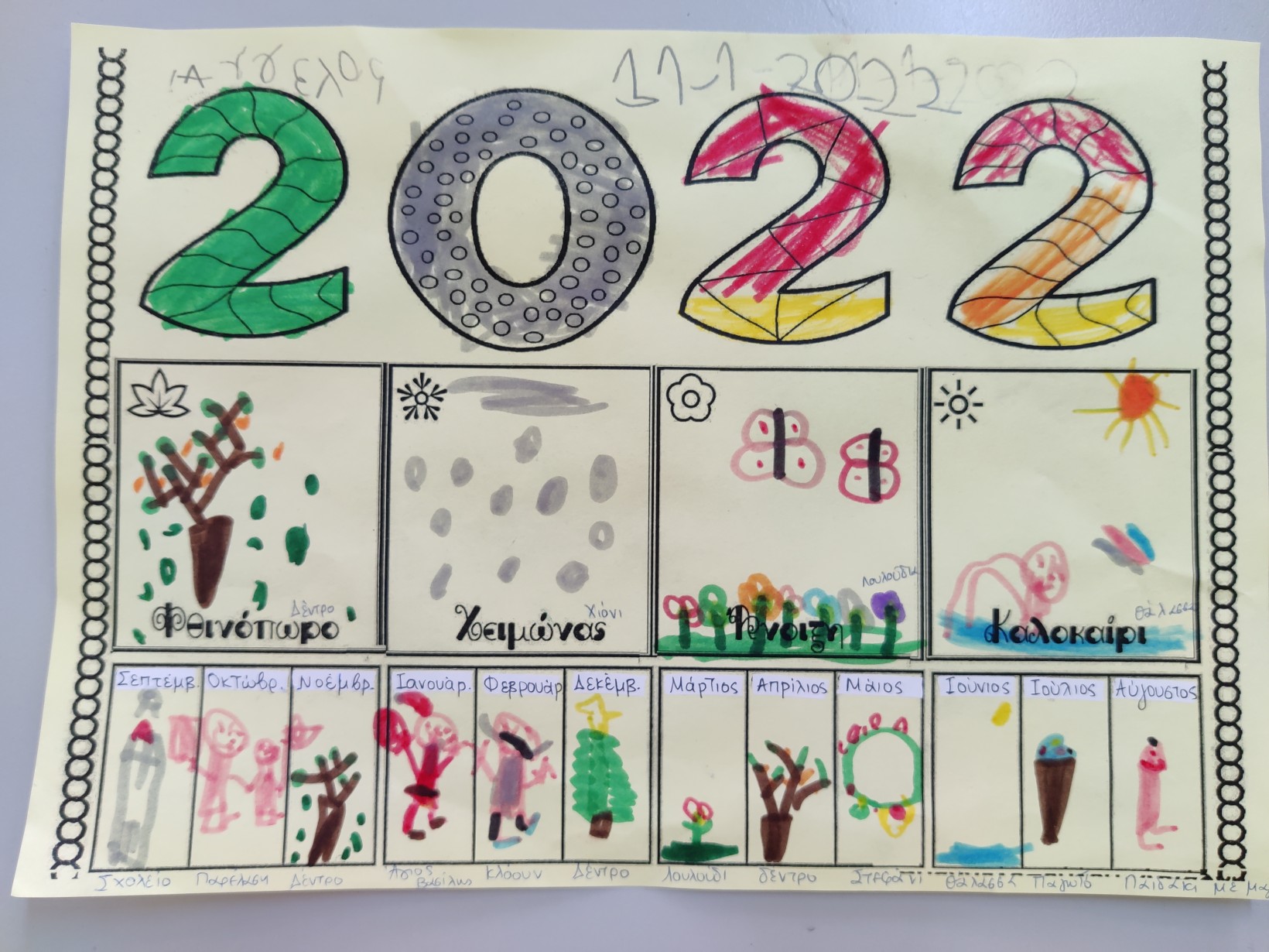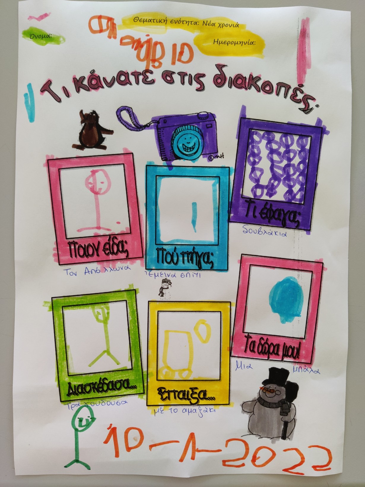 1.2345 Φτιάχνοντας τα γούρια για τη φετινή χρονιά.1234567 Ζωγραφίζοντας τη νέα χρονιά, τους μήνες και τις εποχές της με ωραία χρώματα και πολλές ελπίδες.1234567 Γιατί αλλάζουν οι χρονιές; Πόσες μέρες έχει ο χρόνος; Και ποιος ο ρόλος της Γης και του Ήλιου σε αυτή την αλλαγή; ΠείραμαΓίναμε Γη και Ήλιος.Τους ζωγραφίσαμε1και καταγράψαμε τις νέες μας γνώσεις.23456 Επανάληψη στα γραμματάκια που έχουμε μάθει έως τώρα. Μπορούμε να δημιουργήσουμε συλλαβούλες με αυτά και να σχηματίσουμε λέξεις;123456 Και φυσικά, τηρήσαμε και φέτος το έθιμο της βασιλόπιτας.Την κόψαμε,τηρώντας τα υγειονομικά πρωτόκολλα,τη μοιράσαμε σε σακουλάκια για να την απολαύσουμε στο σπίτι με ασφάλειακαι πήραμε και τα δωράκια μας,για το καλό.Έχουμε νικητή! Πάντα τυχερός να είσαι Παντελή μου!Και του χρόνου με υγεία!