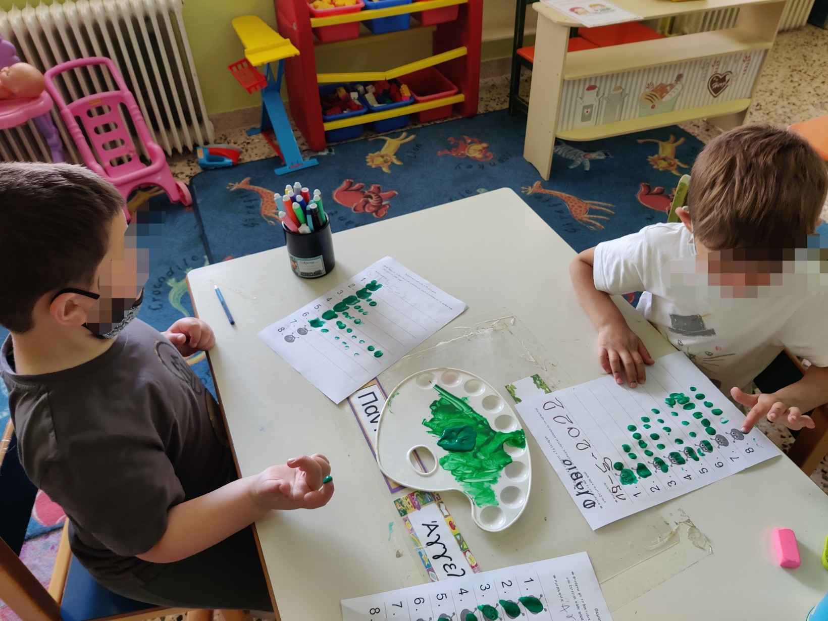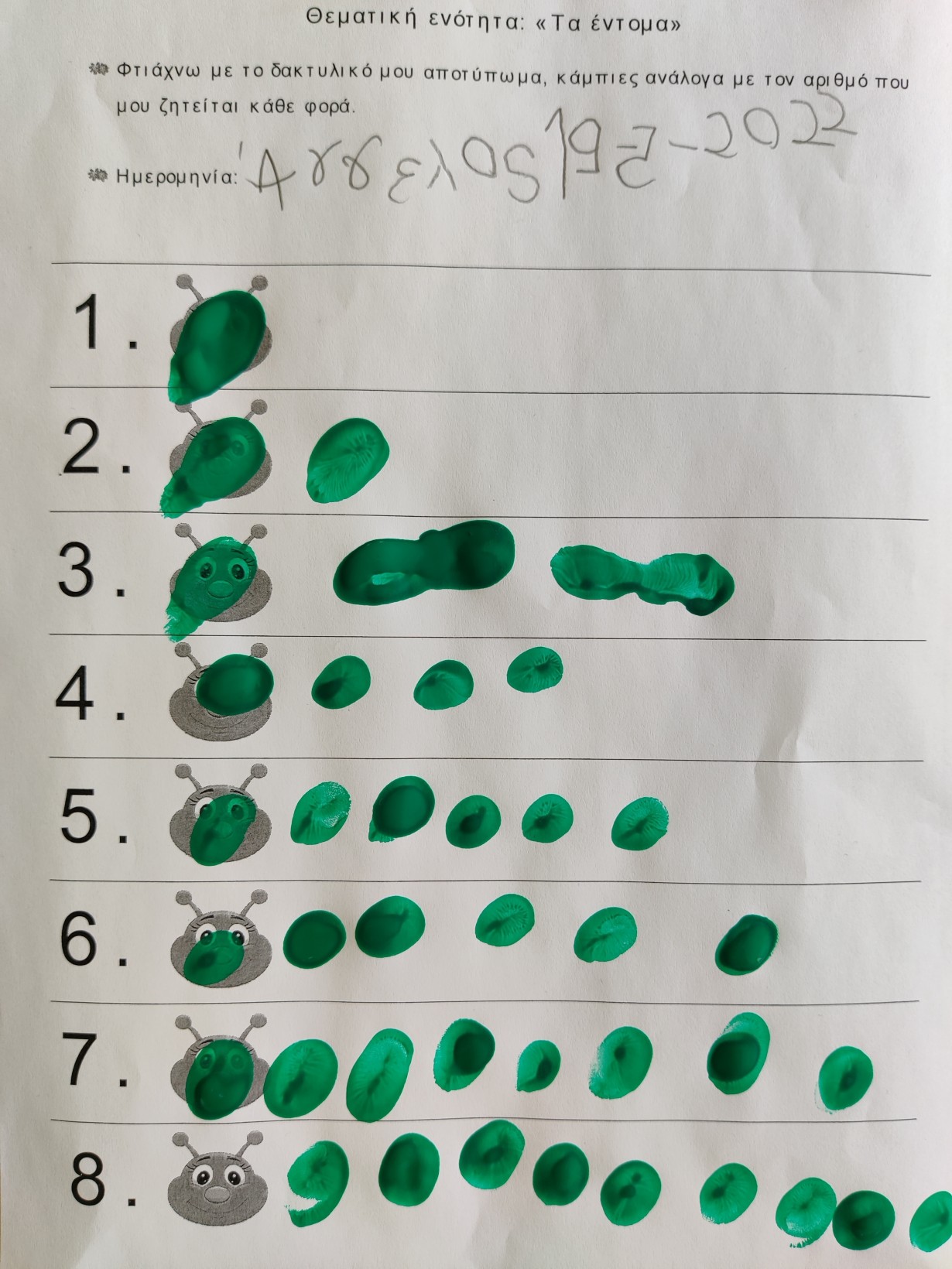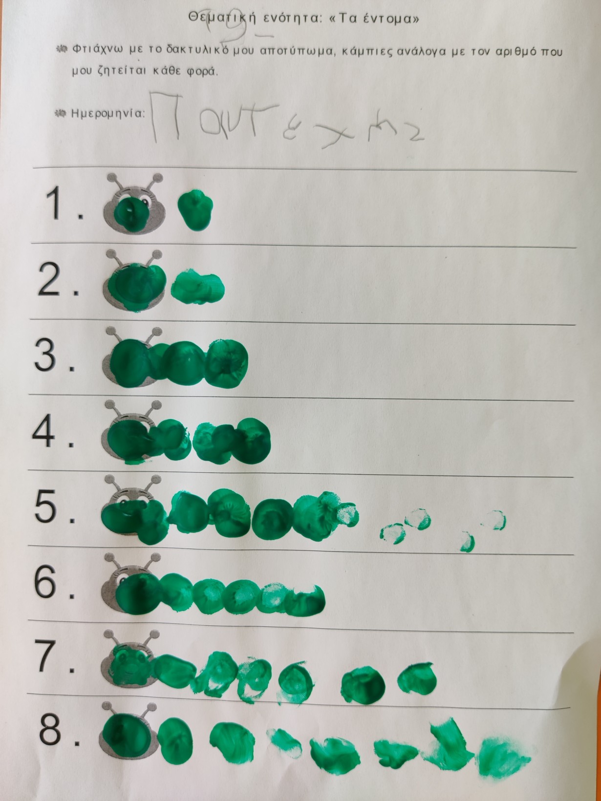 8 Φτιάξαμε με δαχτυλομπογιά τόσα κυκλάκια στο σώμα της κάμπιας όσα μας υποδεικνύει ο αριθμός.