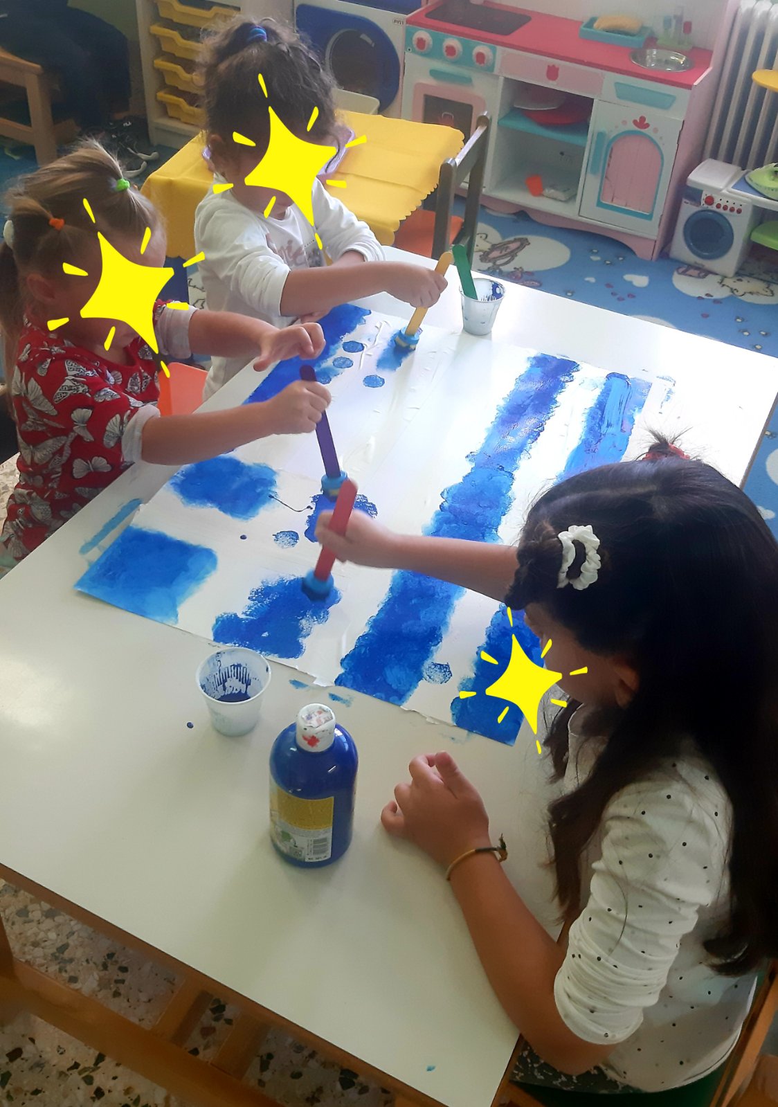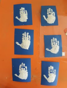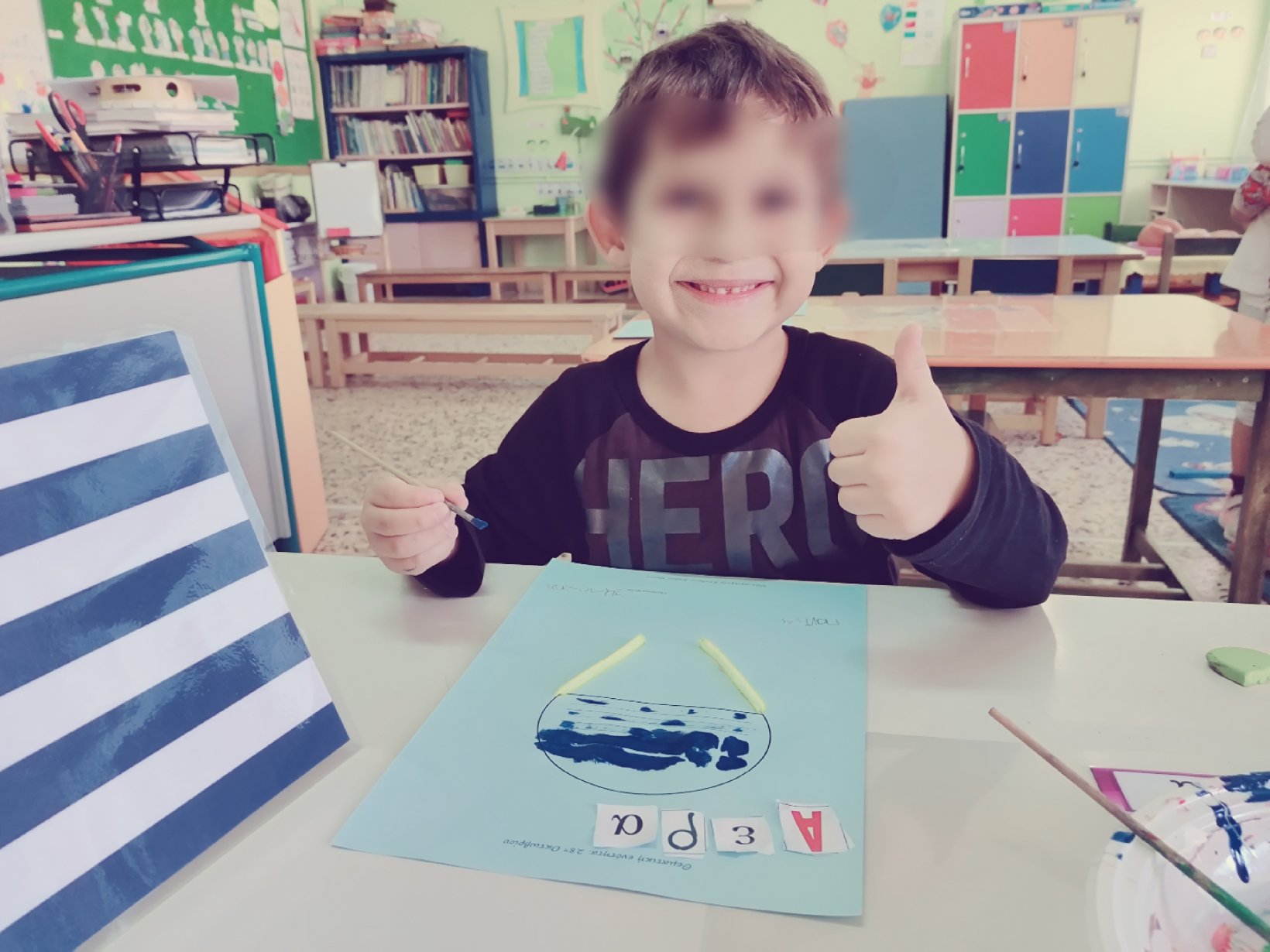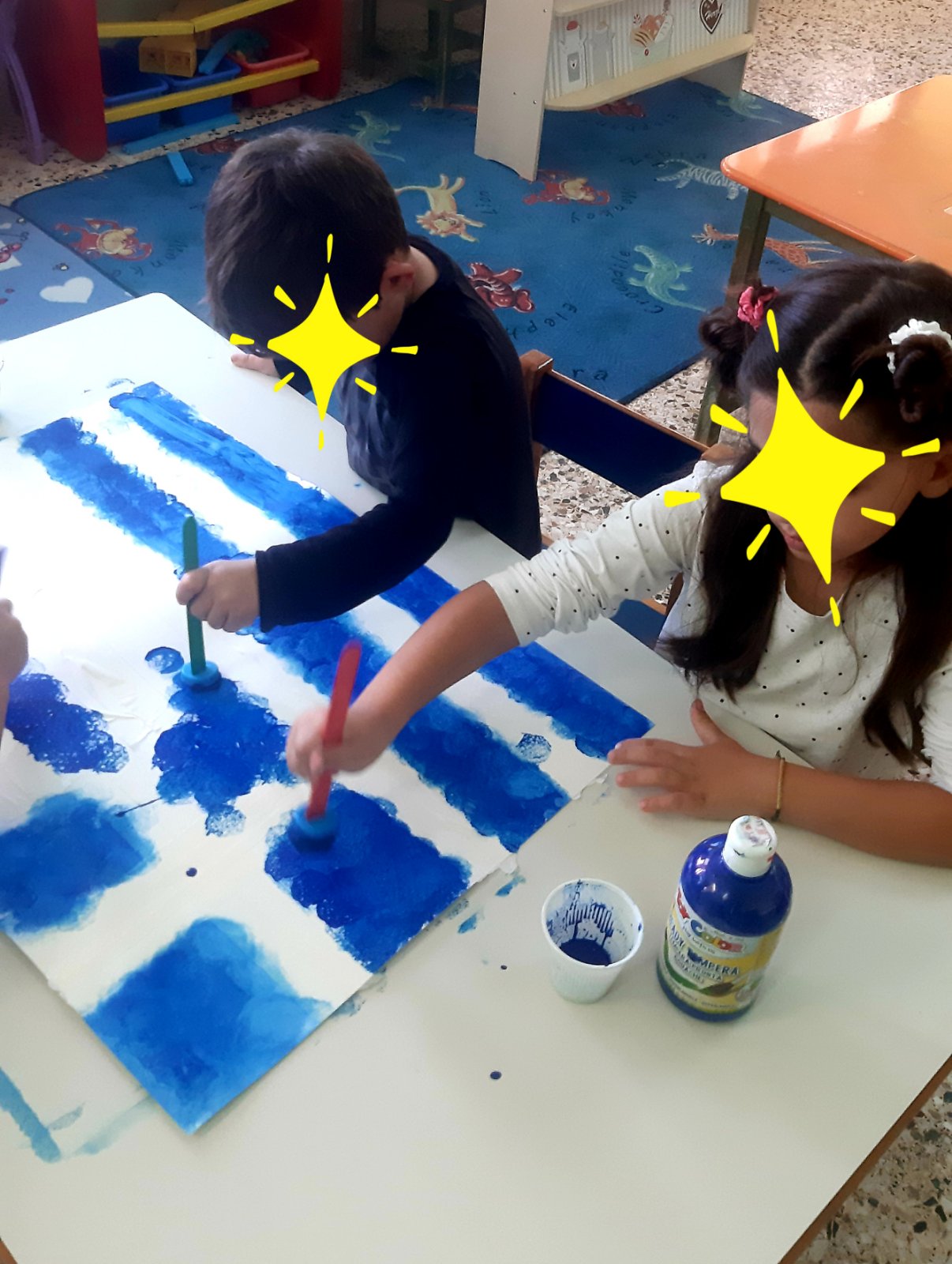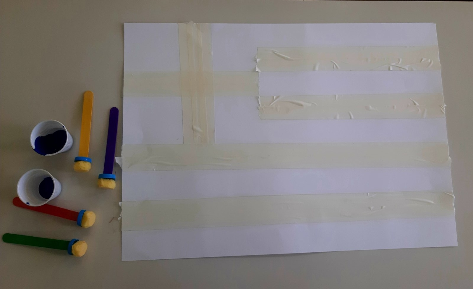 Μιλήσαμε για την Ελληνική σημαίαΖωγραφίσαμε με τυπώματατις μπλε λωρίδες τηςξεκολλήσαμε τις χαρτοταινίες