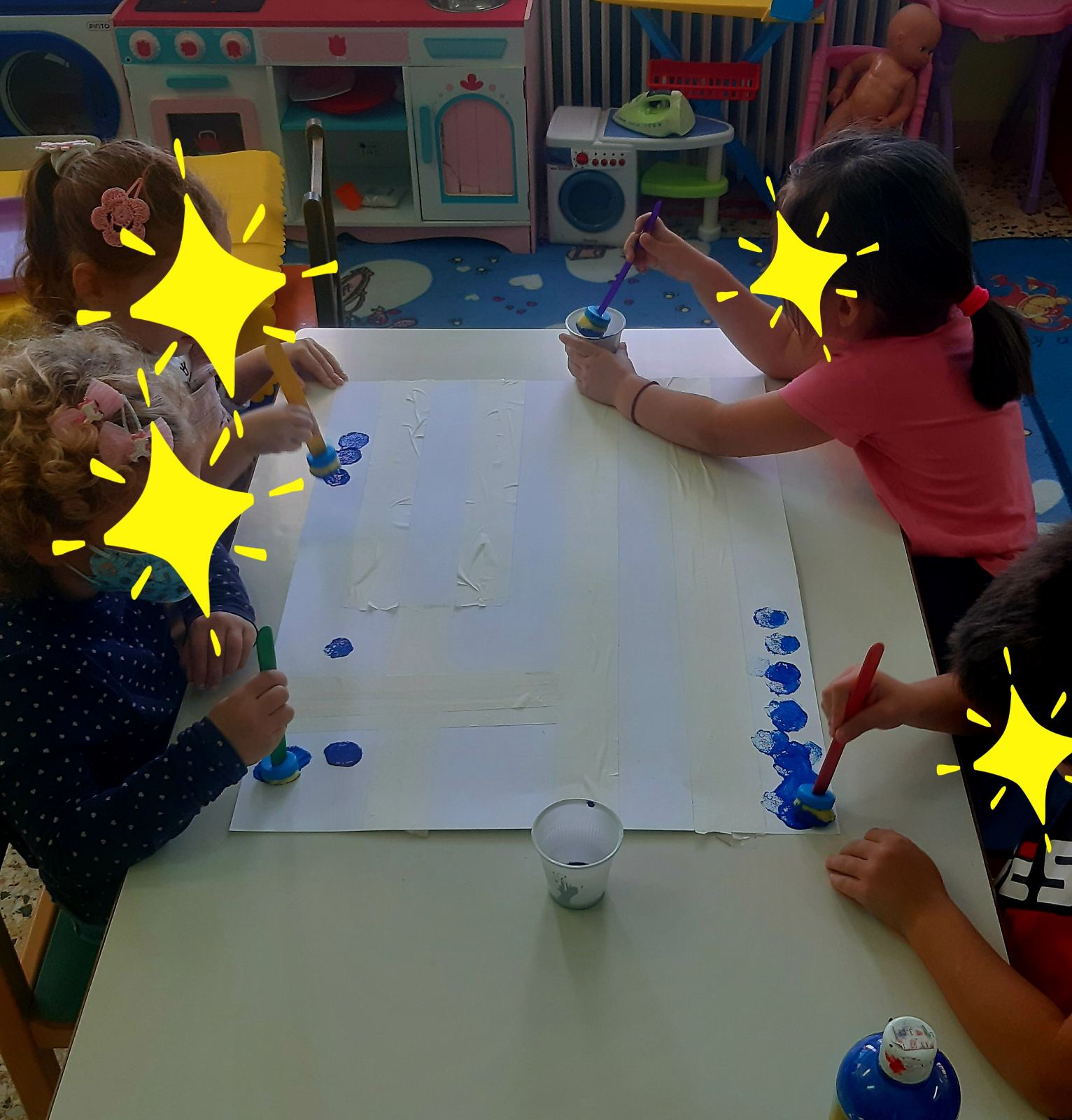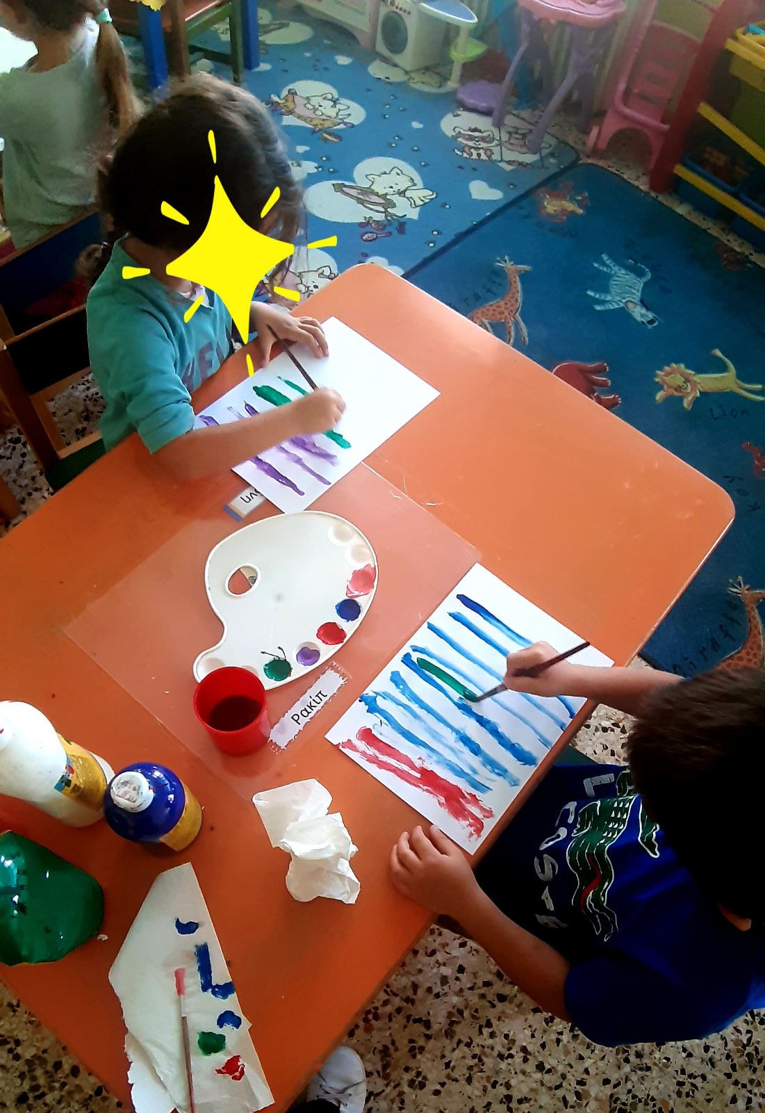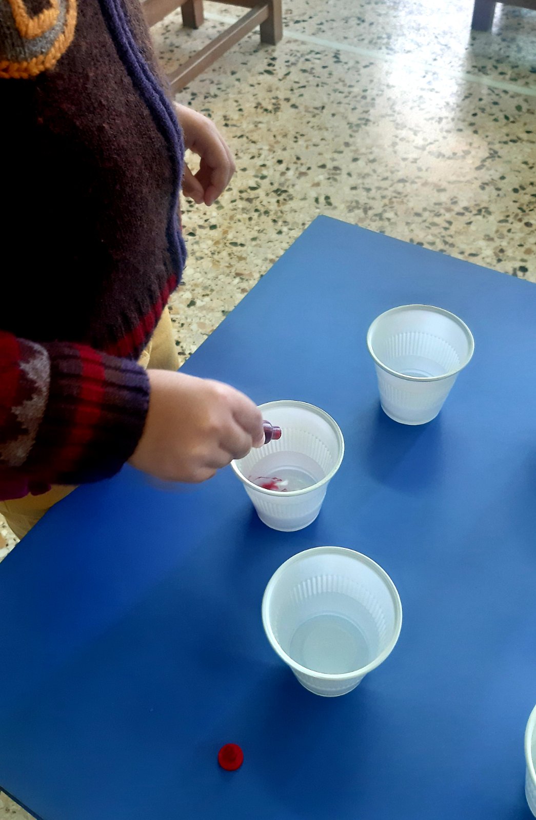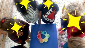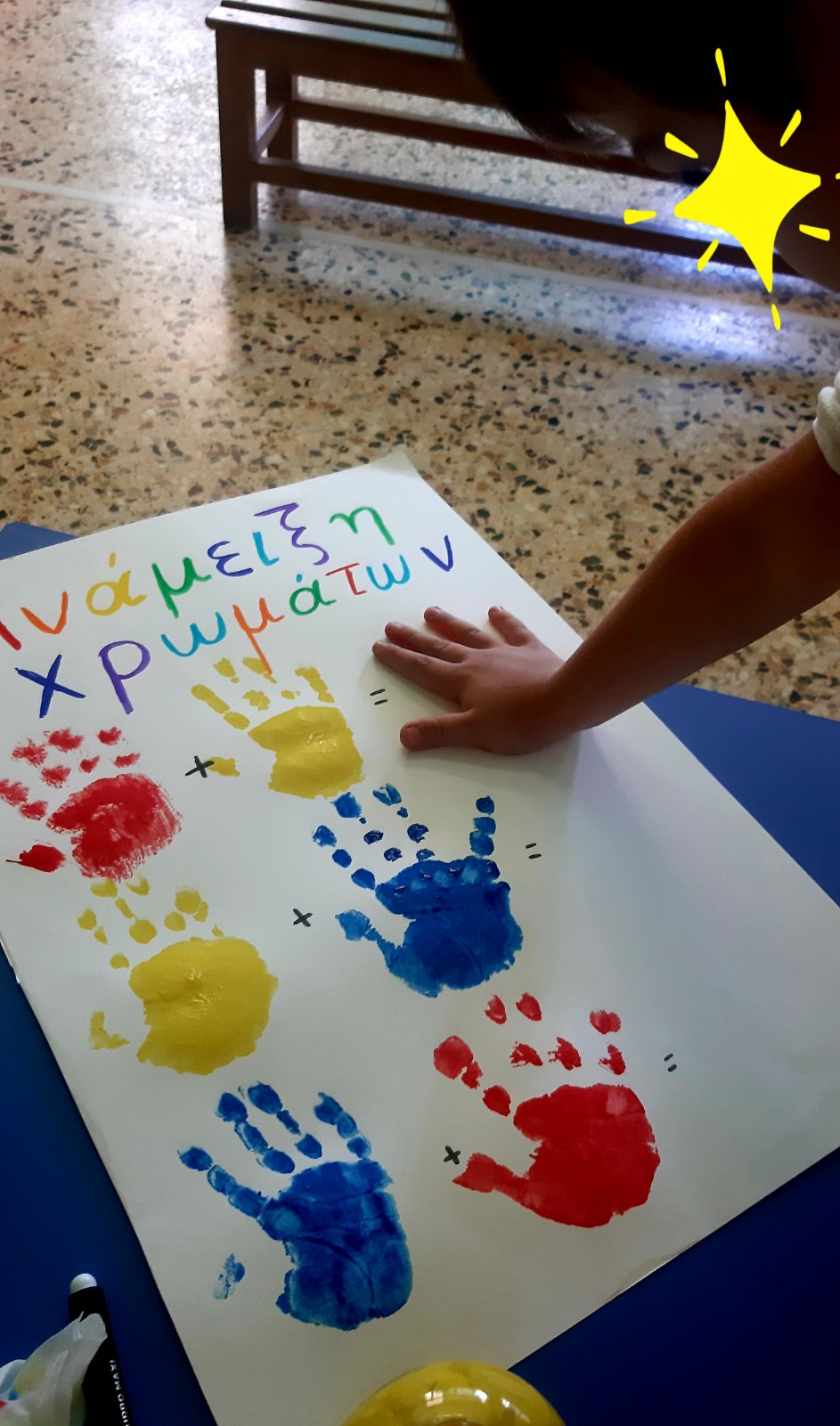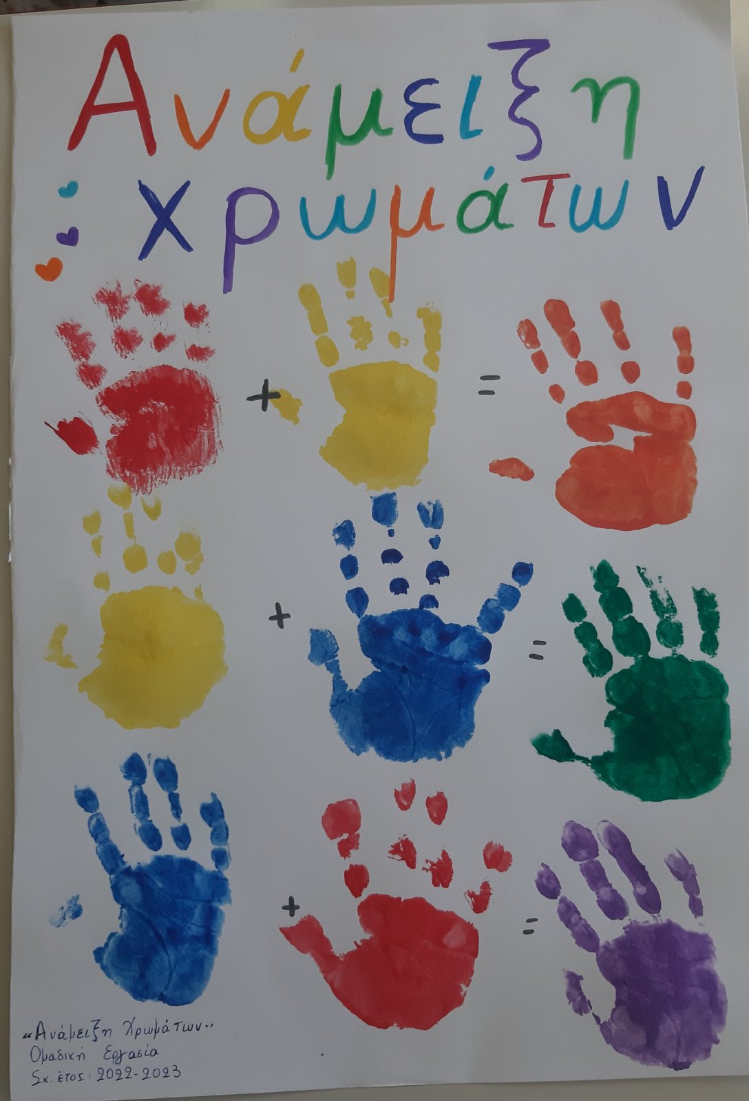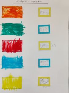 Ρίξαμε χρώματα ζαχαροπλαστικήςσε πλαστικά ποτήρια με νερό και προσθέσαμε χαρτί κουζίνας.Το αποτέλεσμα του πειράματος ήταν…..μαγικό!Εύκολα λοιπόν μετά,καταγράψαμε στον πίνακα αλλά και στο χαρτί μαςτα νέα χρώματα που προκύπτουν από την μίξη των χρωμάτων.Ώρα να το τυπώσουμε και στο χαρτόνι, σε μια ομαδική κατασκευή.Λερώσαμε τα χεράκια μας, αλλά το ευχαριστηθήκαμε.Αφίσα