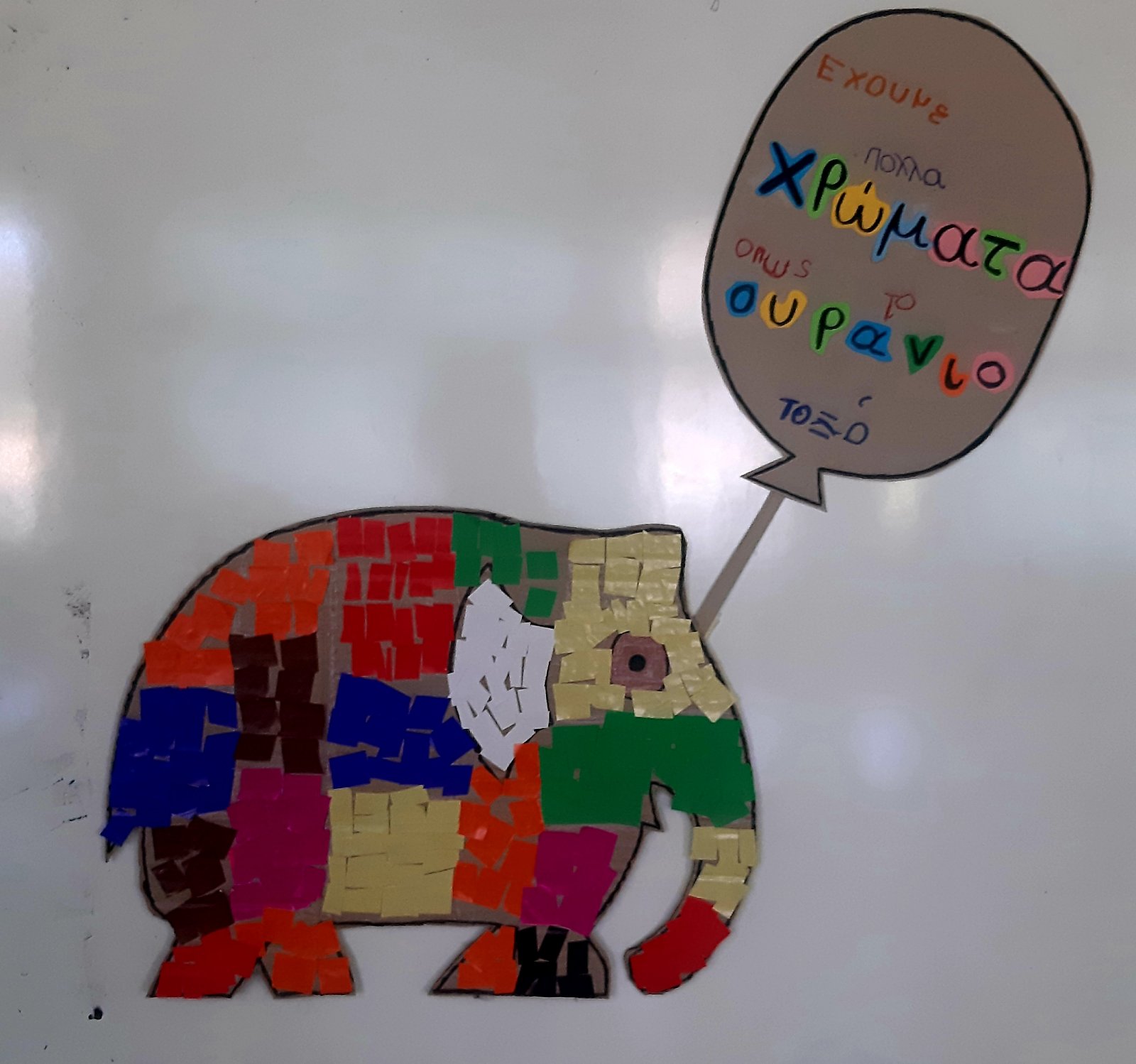 ΈλμερΤου δώσαμε χρώμαμε τα πολύχρωμα χαρτάκια που κόψαμεκαι κολλήσαμε στον αγαπημένο μας ελέφαντα.Γράψανε τα νήπια,Κόλλησαν τα γράμματα τα προνήπια.Έτοιμος ο Έλμερ μας!Τον σειροθετήσαμεανάλογα με το μέγεθός του.Τον ζωγραφίσαμεμε όμορφα χρώματα.