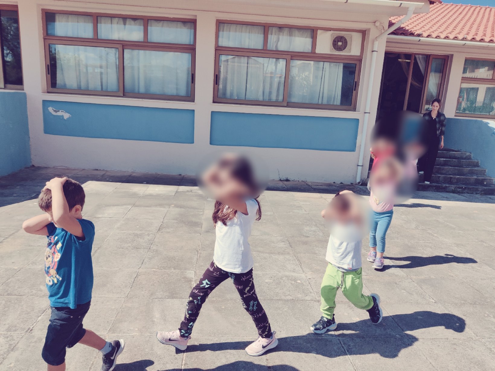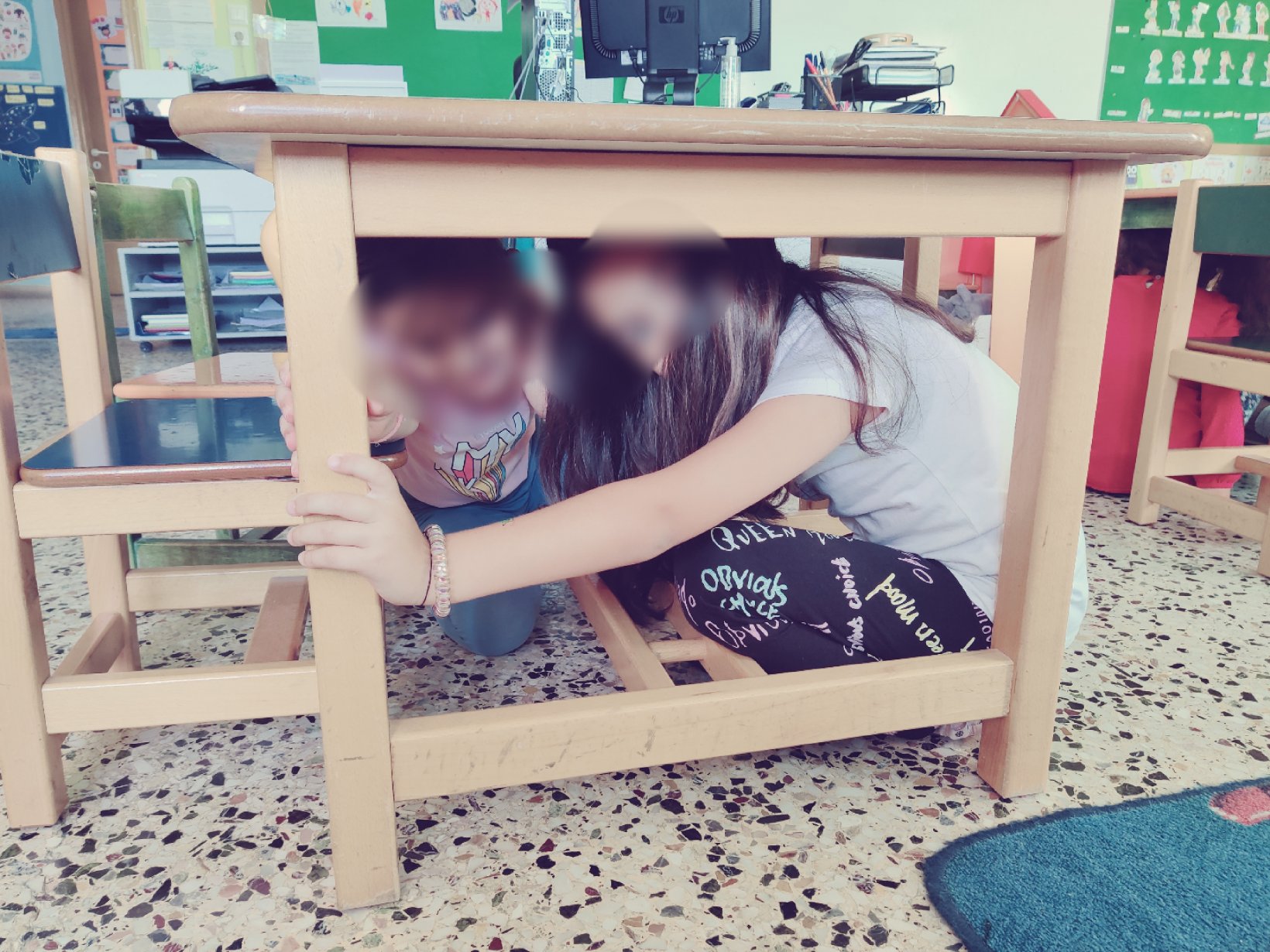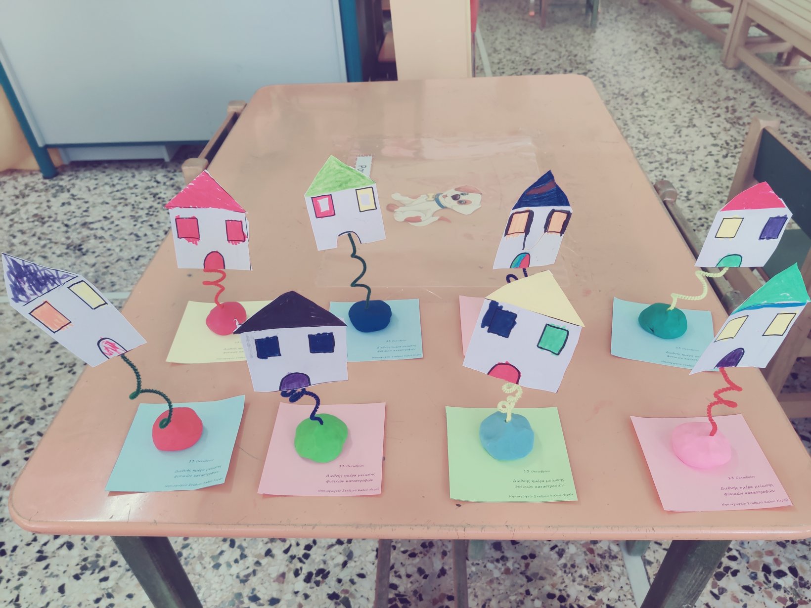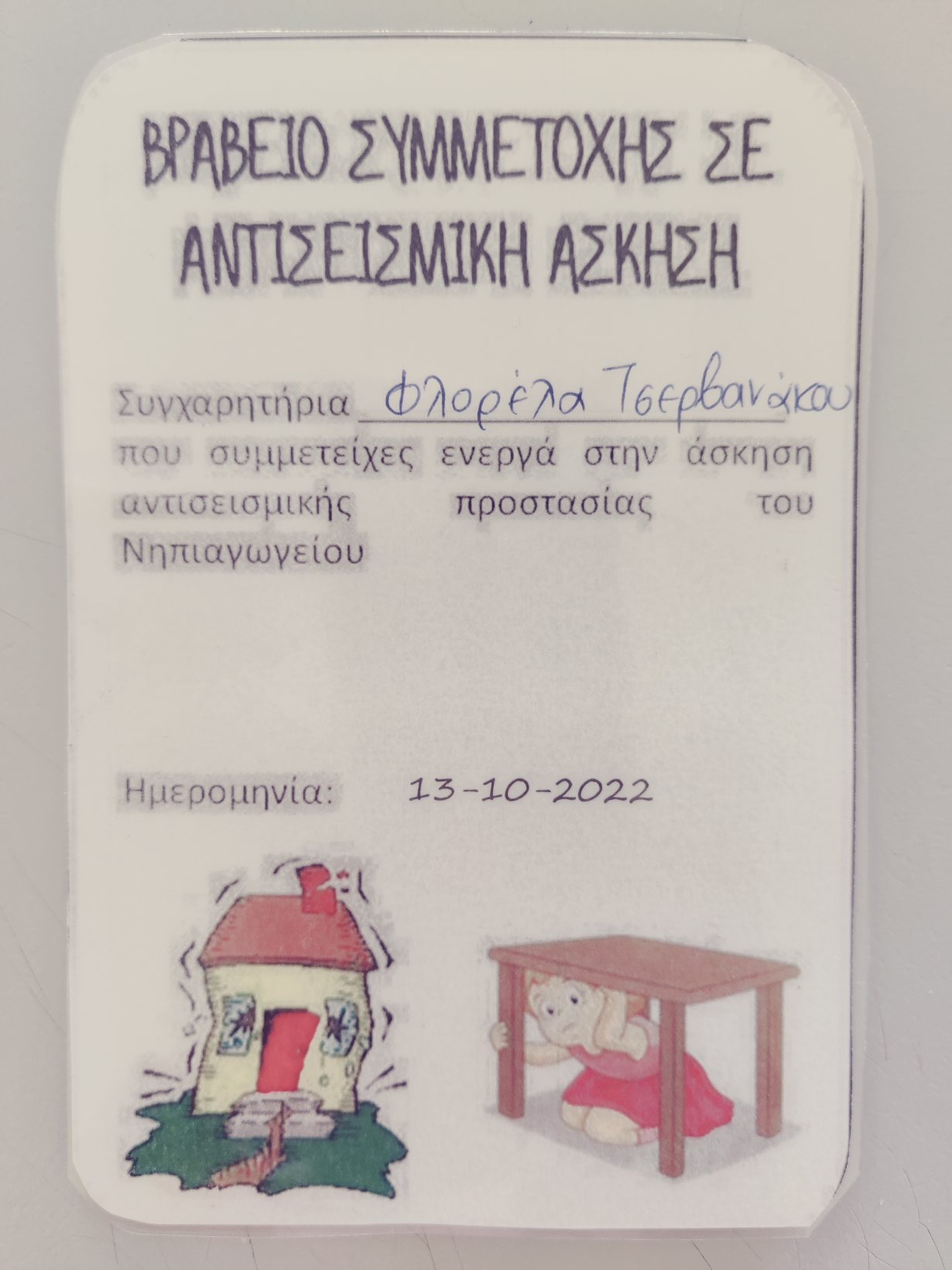 Πρώτα κρυφτήκαμε κάτω από τα τραπέζια.Αφού “τελείωσε” ο σεισμός, μπήκαμε σε τρένο προστατεύοντας το κεφάλι και τον αυχένα μαςκαι συγκεντρωθήκαμε στη βρύση – χώρος συνάντησης με τους γονείς μας σε επικείμενο σεισμό.Καλύψαμε και το ενδεχόμενο που ο σεισμός θα μας βρει σε σημείο που δεν θα έχουμε πρόσβαση στα θρανία μας.Αφού επιστρέψαμε ασφαλείς στην τάξη μας, ζωγραφίσαμε, κόψαμε, πλάσαμε και κολλήσαμε τα “Σπιτάκια που είναι χτισμένα σε σεισμογενή περιοχή”.Ατομική κατασκευήΚαι επειδή ήμασταν σωστοί στην πρώτη μας άσκηση σεισμούπήραμε και το βραβείο μας.