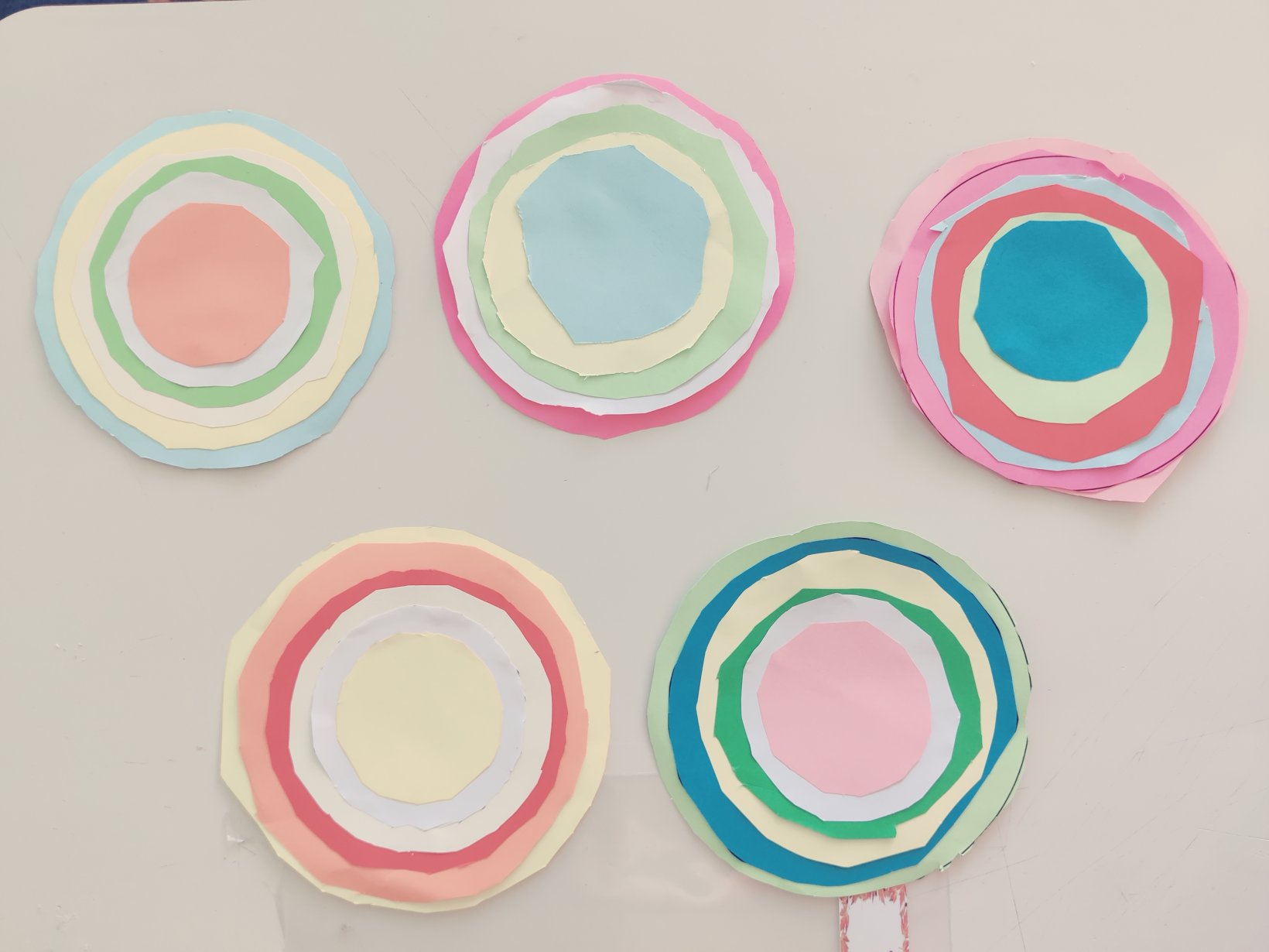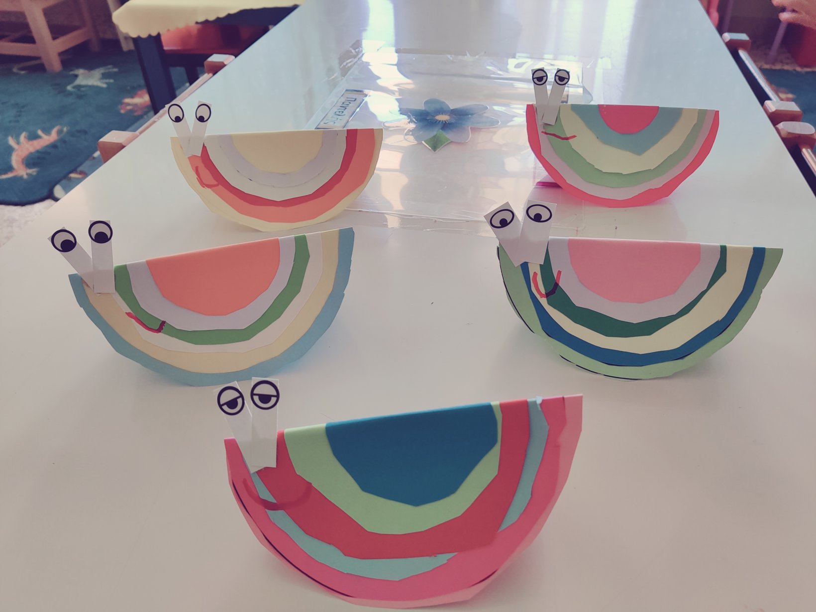 Δείξαμε έναν πίνακα με ομόκεντρους κύκλους και εμπνευστήκαμε.Κόψαμε πολλούς και πολύχρωμους κύκλους.Και φτιάξαμεπολύχρωμα, τρελούτσικα σαλιγκάρια.