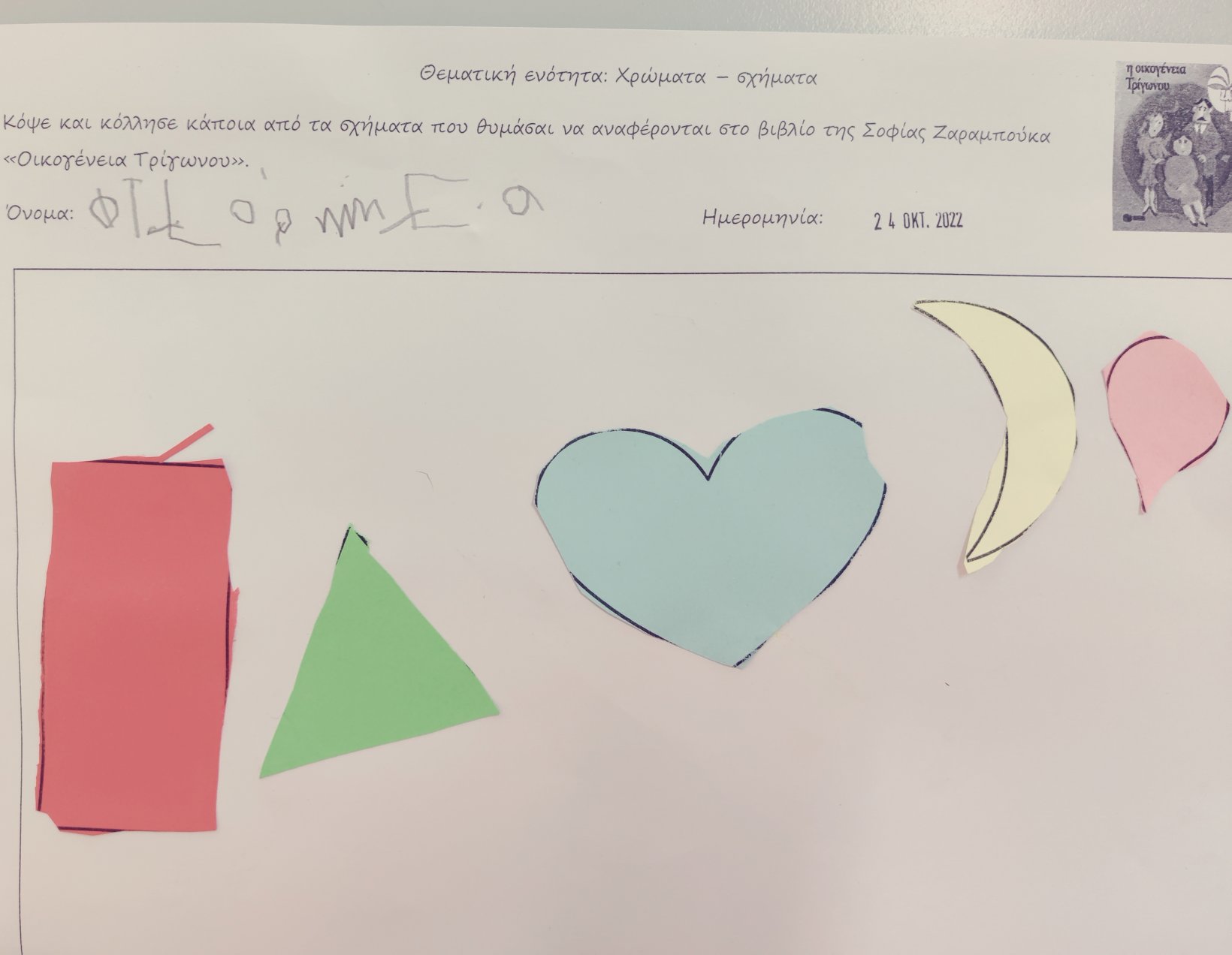 Με αφορμή αυτή τη δραστηριότητα, διαβάσαμε το βιβλίο της Σοφίας Ζαραμπούκα “Οικογένεια Τρίγωνου”.Κόψαμεκαι κολλήσαμεκάποια από τα σχήματαπου αναφέροντανστην ιστορία που διαβάσαμε.