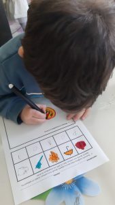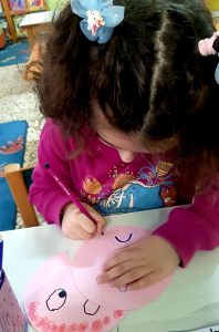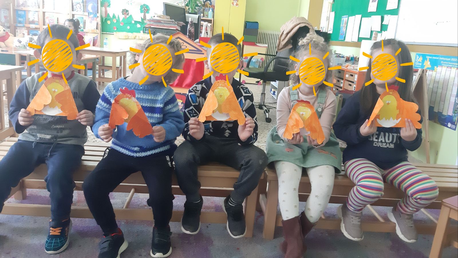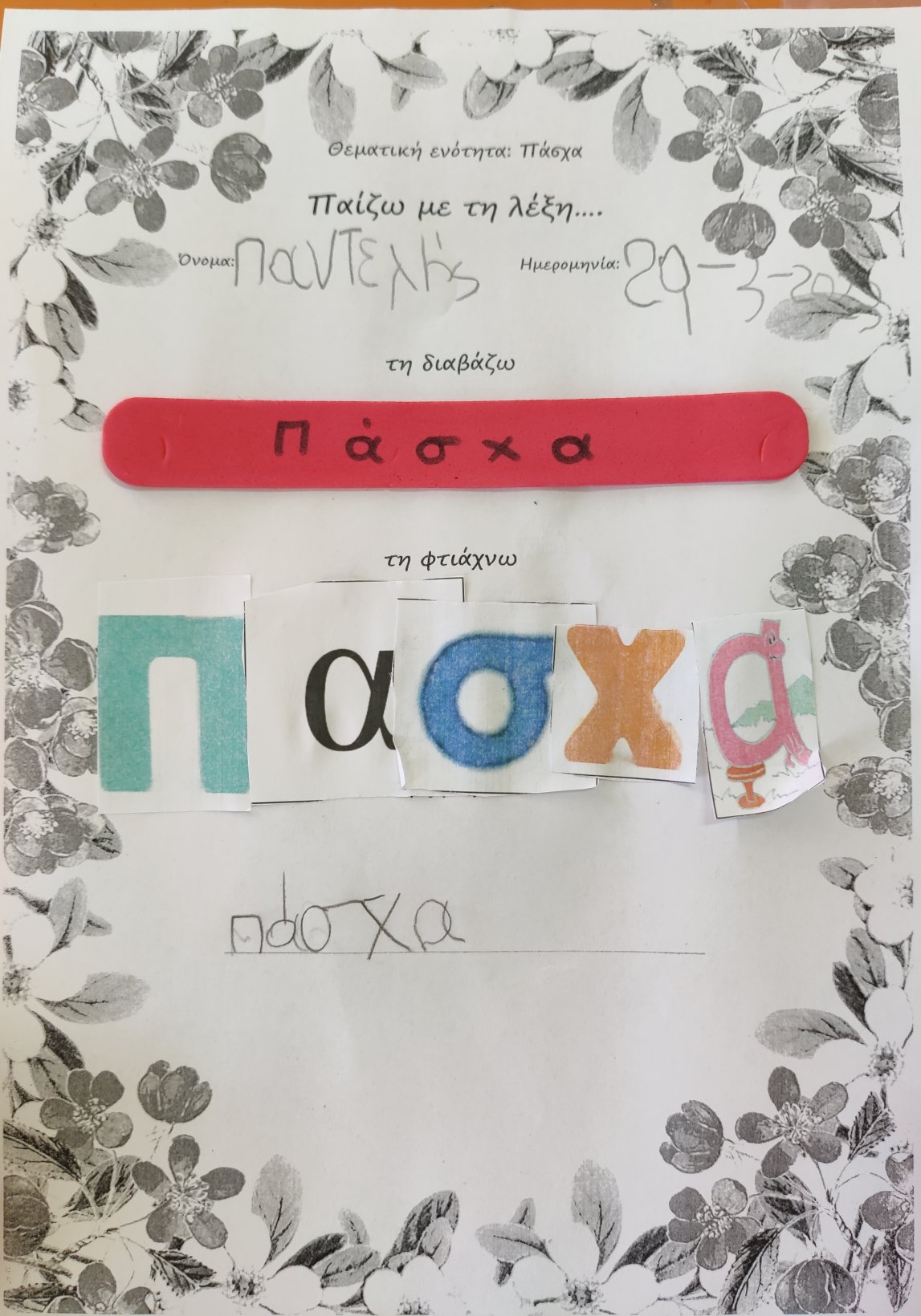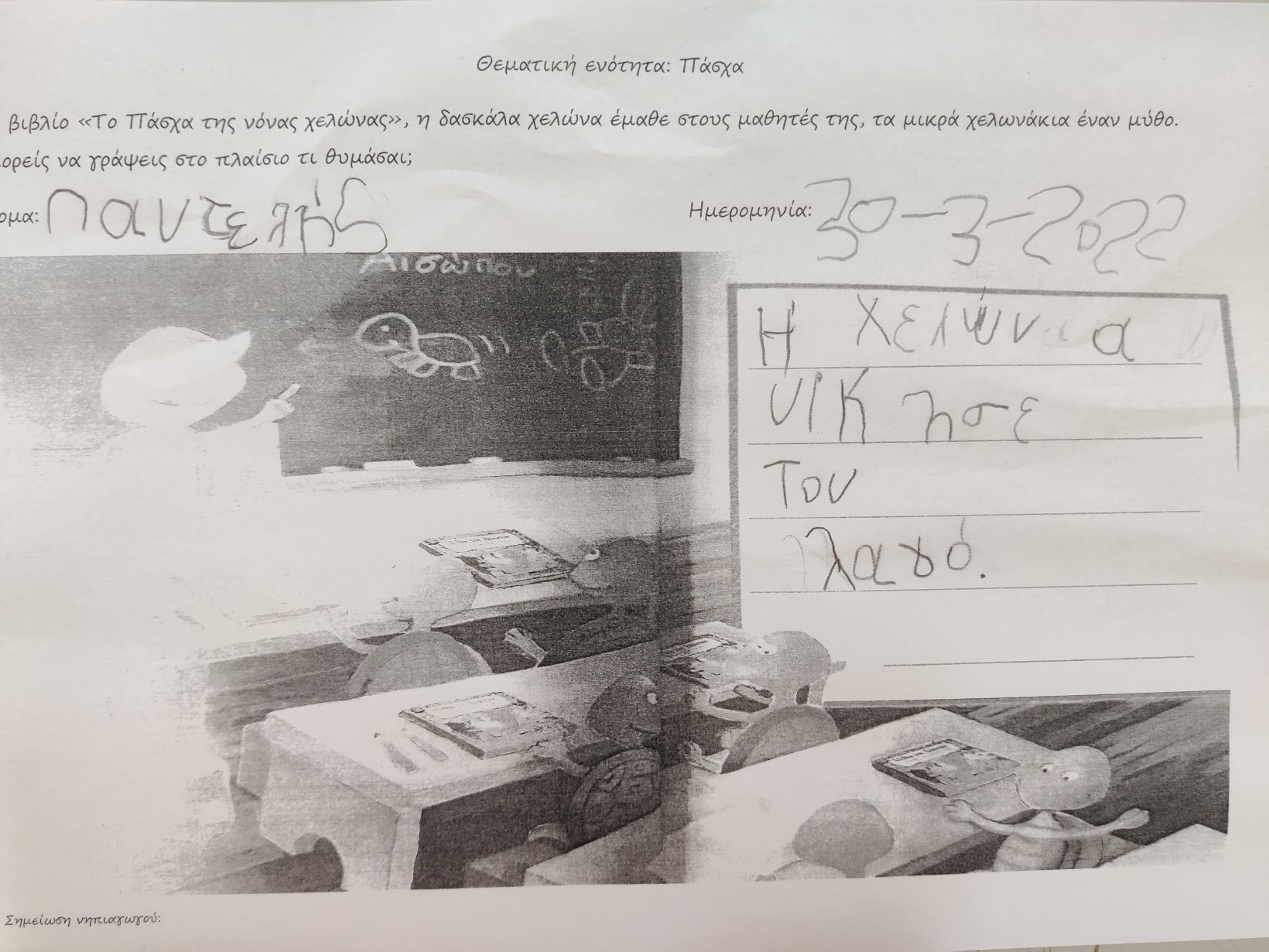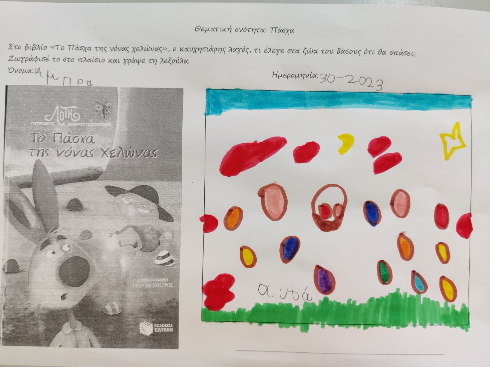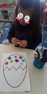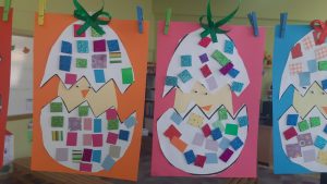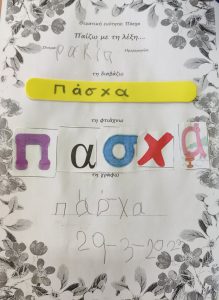 Ετοιμάσαμε τις τσάντες που θα “υποδεχτούν” τις πασχαλινές κατασκευές μας.Επιμεληθήκαμε τόσο την μπροστινή όσο και την πίσω όψη της.1Σχηματίσαμε και γράψαμε τη λέξη Πάσχα.12Φτιάξαμε τα καλάθιαΕτοιμάσαμε τις κάρτες μαςκαι γράψαμε τις ευχές μας.211Διαβάσαμε το υπέροχο βιβλίο της κ. Λότης Πέτροβιτς Ανδρουτσοπούλου.και γράψαμε όπως μπορούσαμε τι έμαθε η δασκάλα χελώνα στα χελωνάκια της.και τι προσπάθησε να σπάσει ο λαγός.Κόψαμε,κολλήσαμε τα ψηφιδωτά μας πάνω στο αυγό για να το διακοσμήσουμεκαι από μέσα ξεπρόβαλε ένα όμορφο κοτόπουλο.1