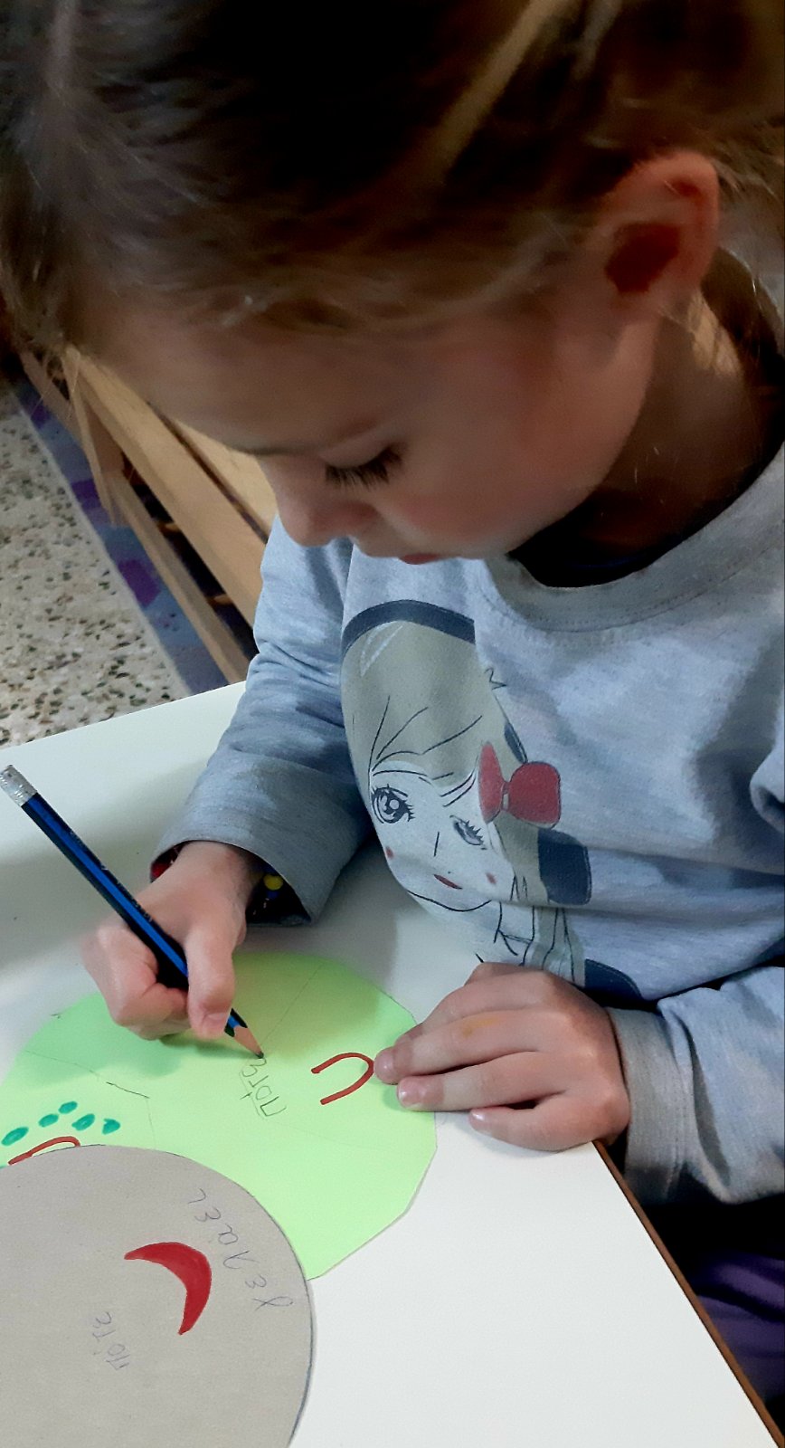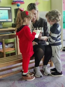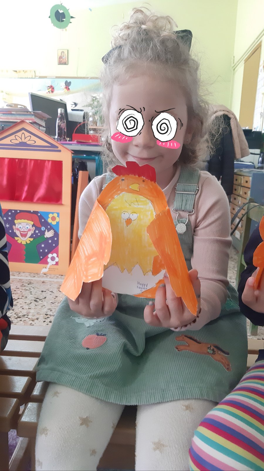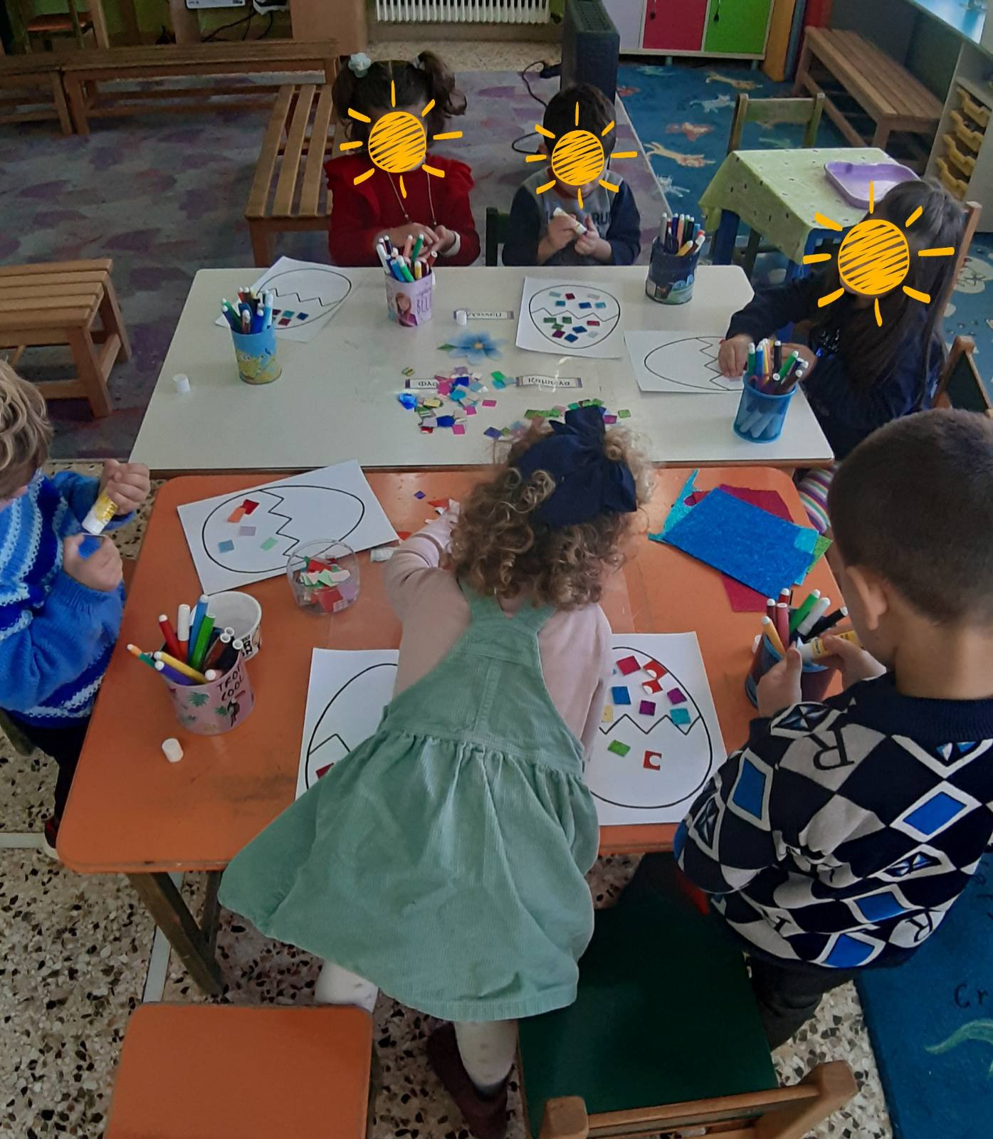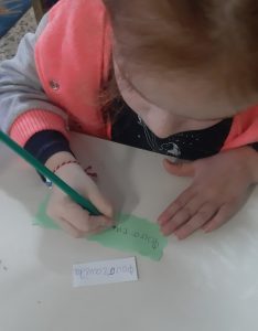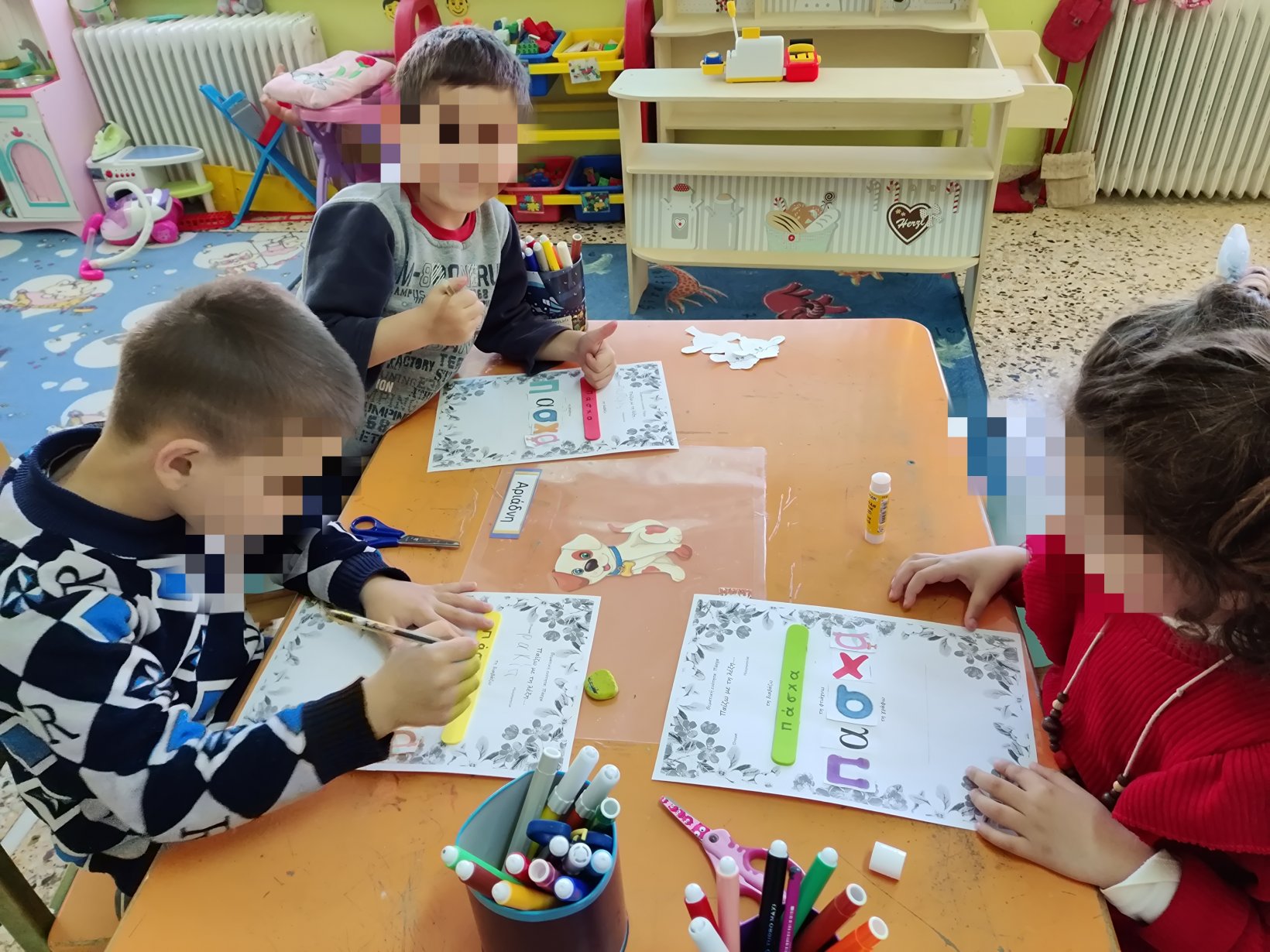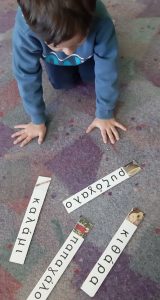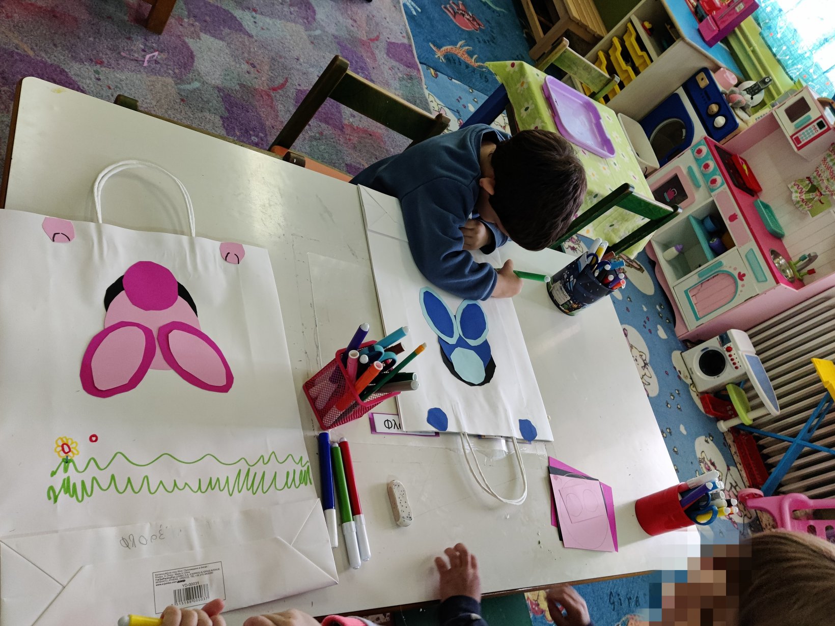 Ετοιμάσαμε τις τσάντες που θα “υποδεχτούν” τις πασχαλινές κατασκευές μας.Επιμεληθήκαμε τόσο την μπροστινή όσο και την πίσω όψη της.1Σχηματίσαμε και γράψαμε τη λέξη Πάσχα.12Φτιάξαμε τα καλάθιαΕτοιμάσαμε τις κάρτες μαςκαι γράψαμε τις ευχές μας.211Διαβάσαμε το υπέροχο βιβλίο της κ. Λότης Πέτροβιτς Ανδρουτσοπούλου.και γράψαμε όπως μπορούσαμε τι έμαθε η δασκάλα χελώνα στα χελωνάκια της.και τι προσπάθησε να σπάσει ο λαγός.Κόψαμε,κολλήσαμε τα ψηφιδωτά μας πάνω στο αυγό για να το διακοσμήσουμεκαι από μέσα ξεπρόβαλε ένα όμορφο κοτόπουλο.1
