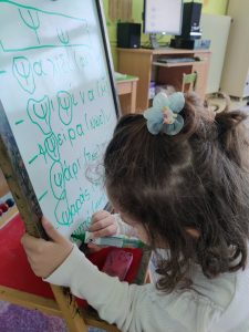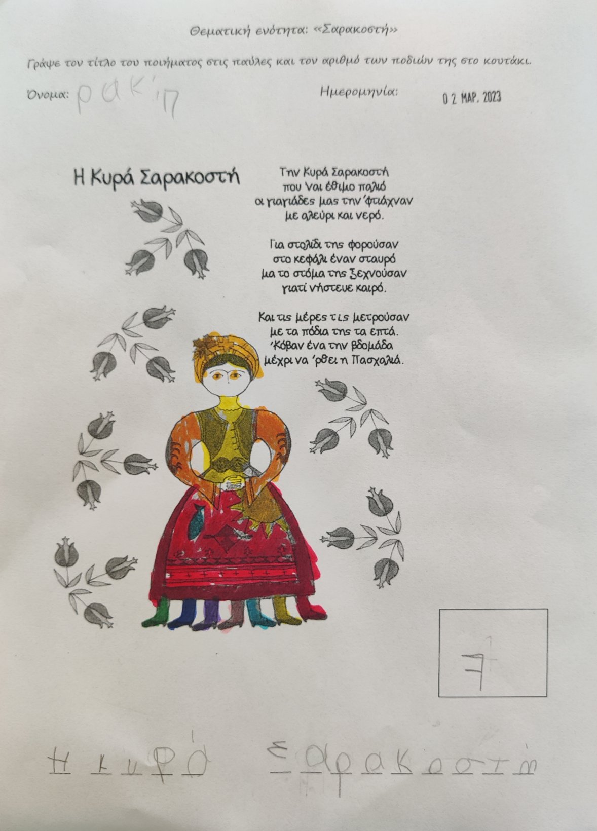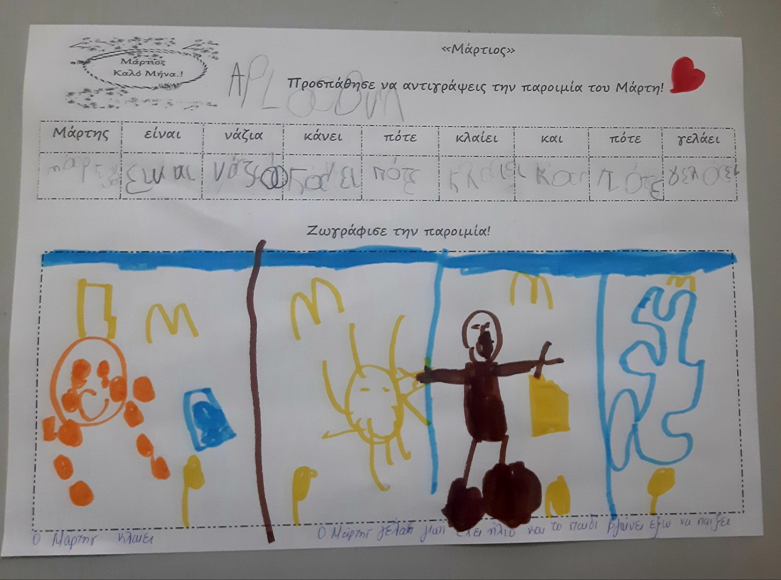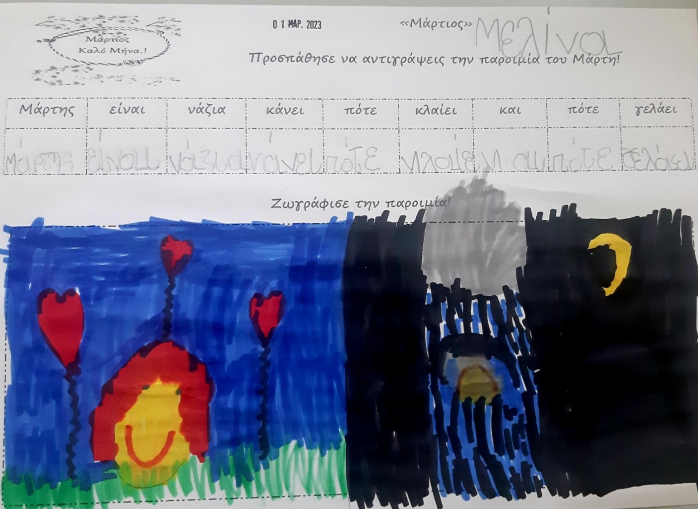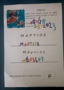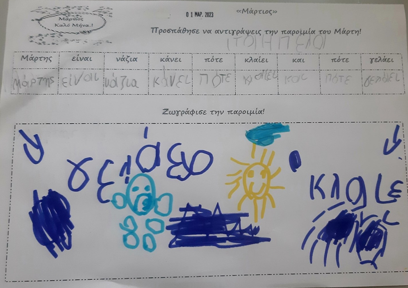 Γράψαμε το όνομα του Μάρτη με μικρά και κεφαλαία.Μάθαμε την παροιμία«Μάρτης είναι, νάζια κάνει ποτέ κλαίει πότε γελάει»και την ζωγραφίσαμε.Μετά την κάναμε κατασκευή.Ο Μάρτης προσωποποιήθηκεκαι πότε κλαίει και πότε γελάει.Φτιάξαμε μαρτάκια και τα φορέσαμε στο χεράκι μας για να μην μας κάψει ο ήλιος.Γράψαμε το μέρος του προσώπου που λείπει από την κυρά Σαρακοστήκαι το όνομα τηςκαι ετοιμάσαμε την ατομική μαςκατασκευήγια να την πάρουμε στο σπίτι μαςκαι να κόβουμε κάθε εβδομάδα και από ένα πόδι.