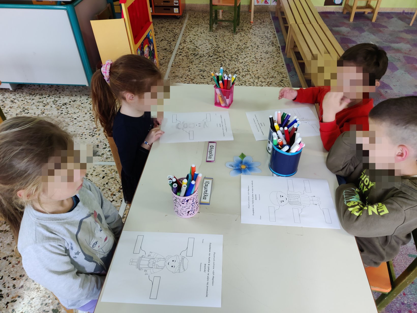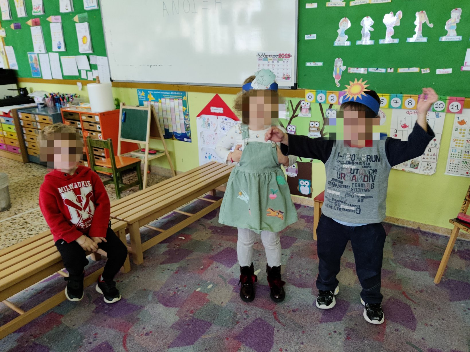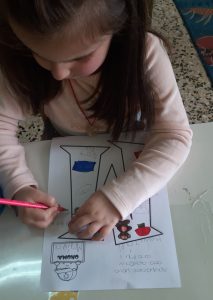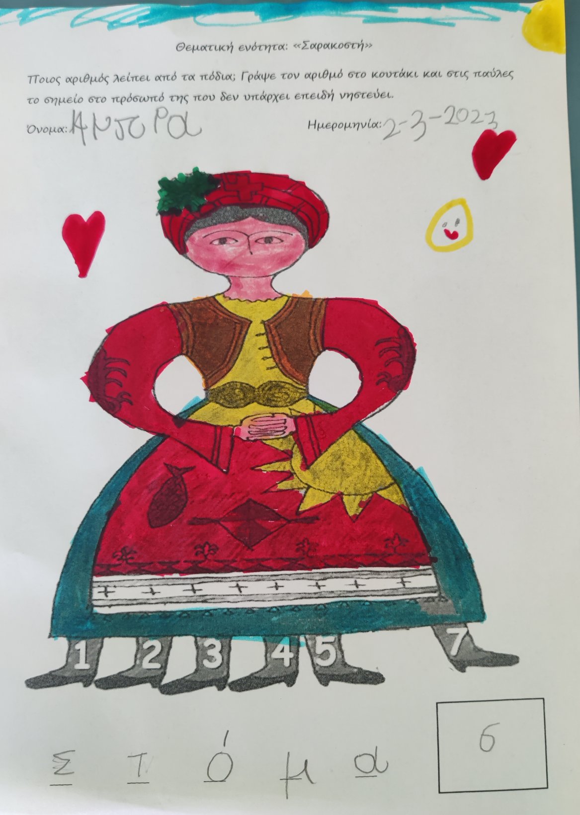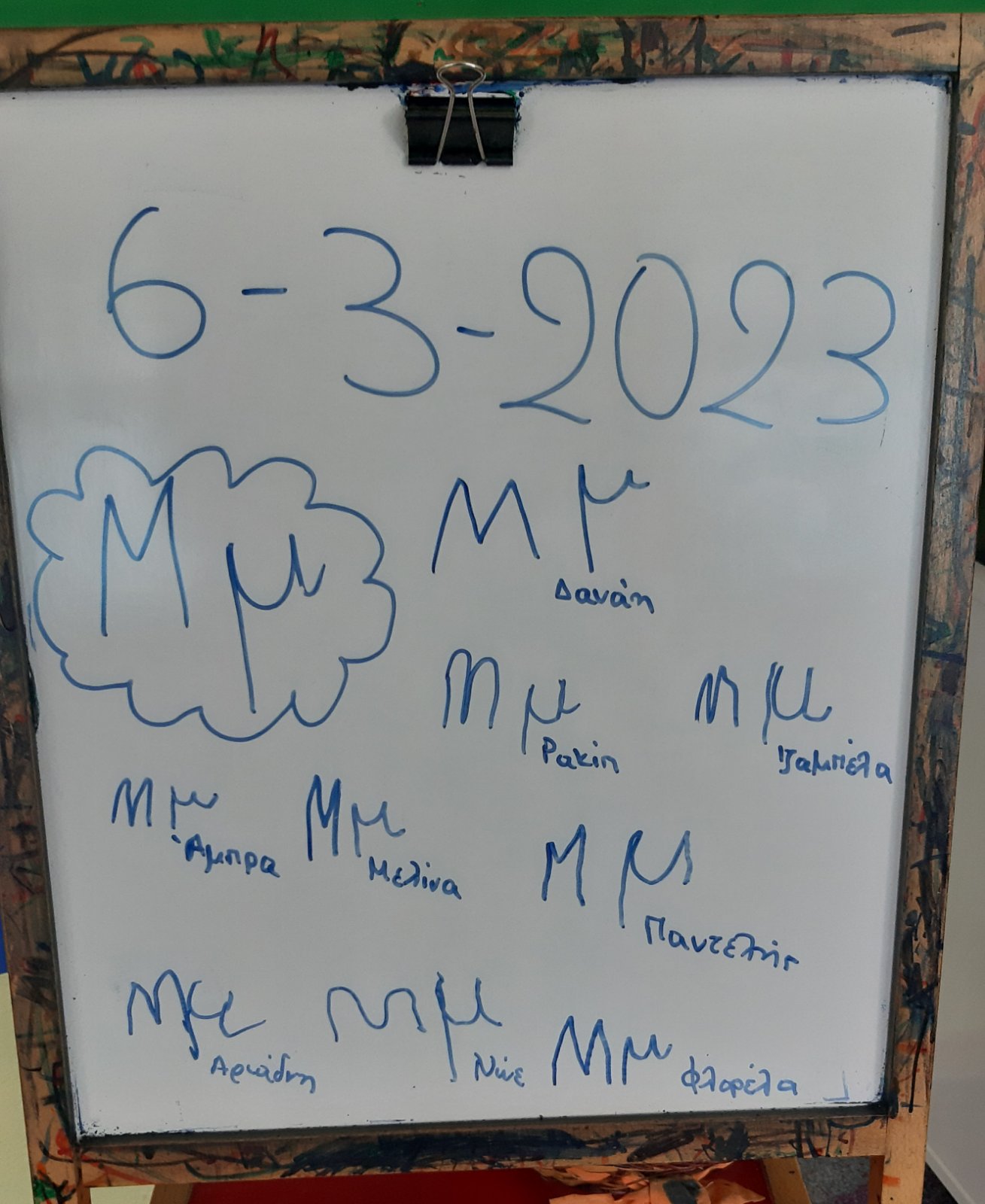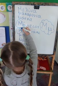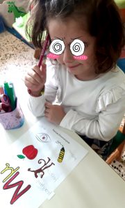 Γράψαμε το όνομα του Μάρτη με μικρά και κεφαλαία.Μάθαμε την παροιμία«Μάρτης είναι, νάζια κάνει ποτέ κλαίει πότε γελάει»και την ζωγραφίσαμε.Μετά την κάναμε κατασκευή.Ο Μάρτης προσωποποιήθηκεκαι πότε κλαίει και πότε γελάει.Φτιάξαμε μαρτάκια και τα φορέσαμε στο χεράκι μας για να μην μας κάψει ο ήλιος.Γράψαμε το μέρος του προσώπου που λείπει από την κυρά Σαρακοστήκαι το όνομα τηςκαι ετοιμάσαμε την ατομική μαςκατασκευήγια να την πάρουμε στο σπίτι μαςκαι να κόβουμε κάθε εβδομάδα και από ένα πόδι.