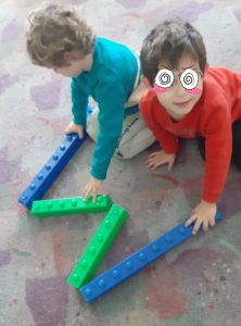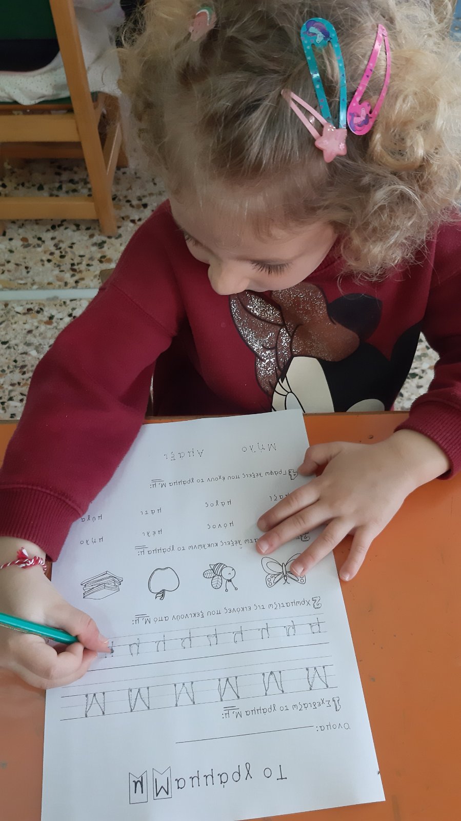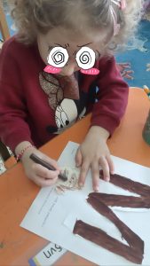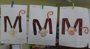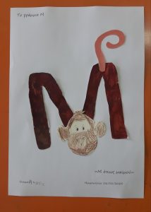 Ψάξαμε στις καρτέλες πρώτης ανάγνωσης να βρούμε λέξεις που αρχίζουν από το γράμμα Μ.Σχηματίσαμε το κεφαλαίο και το πεζό με υλικάαπό το οικοδομικό υλικό της τάξης.Βρήκαμε λέξεις που αρχίζουν από το γράμμα μ και το εντοπίσαμε μέσα σε αυτές.Μετά το γράψαμε και στον ασπροπίνακα.Το ζωγραφίσαμε,1το γράψαμε πολλές φορές,το σχηματίσαμε με την πλαστελίνη μας.και τέλος του δώσαμε μορφή:Έγινε μία χαριτωμένη μαϊμούσαν την μικρή μαϊμού που παρακολουθήσαμε στην αγαπημένη μας σειρά “Ένα γράμμα, μια ιστορία”.