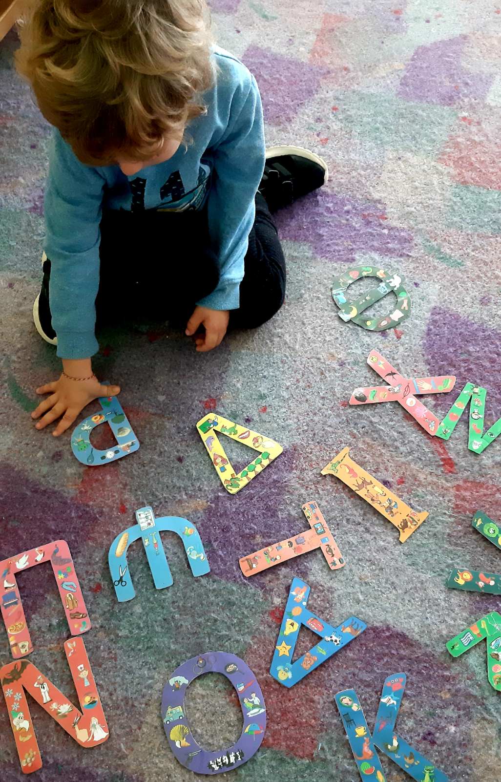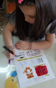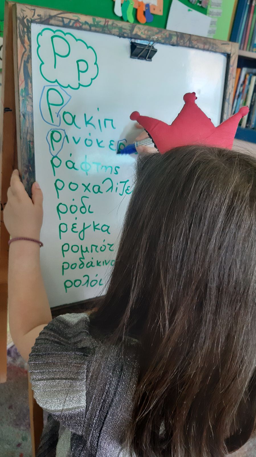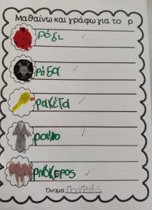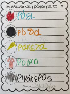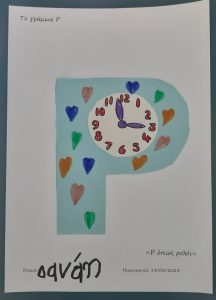 Εντοπίσαμε το γράμμα Ρ ανάμεσα σε άλλα.και λέξεις που αρχίζουν από αυτό.Το σχεδιάσαμε με το οικοδομικό υλικό της τάξης.Χορέψαμε το χορό του ρομπότ που ξεκινάει από αυτό.Το κυκλώσαμε στις λέξεις που βρήκαμε και γράψαμε στον ασπροπίνακα.Και μάθαμε να το γράφουμεΜε κεφαλαίο και με μικρό.Και αποκωδικοποιήσαμε το γρίφο για να βρούμε την κρυμμένη λέξη που αρχίζει από το Ρ.Και η αγαπημένη μας συνήθεια:Το μετατρέψαμε σε ……. ρολόι.Και γράψαμε όπως μπορούσαμελέξεις που αρχίζουν από Ρ.