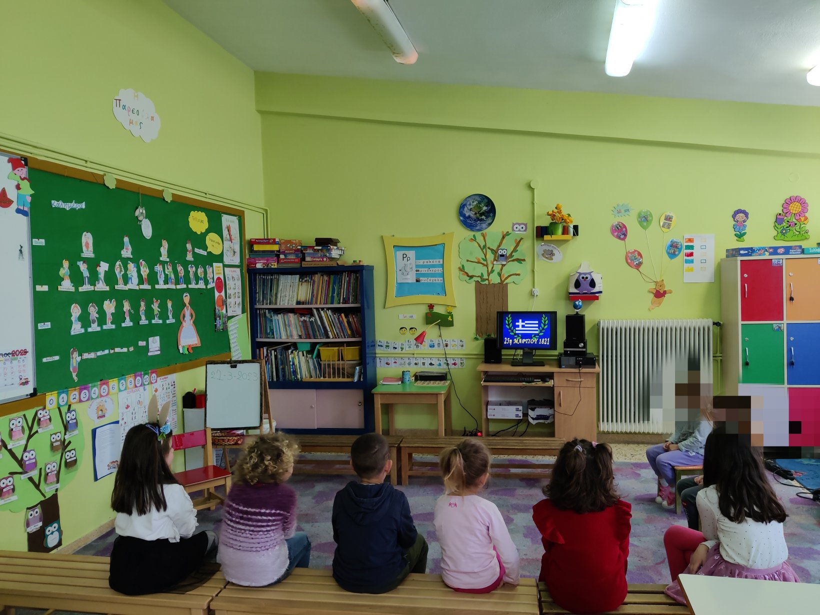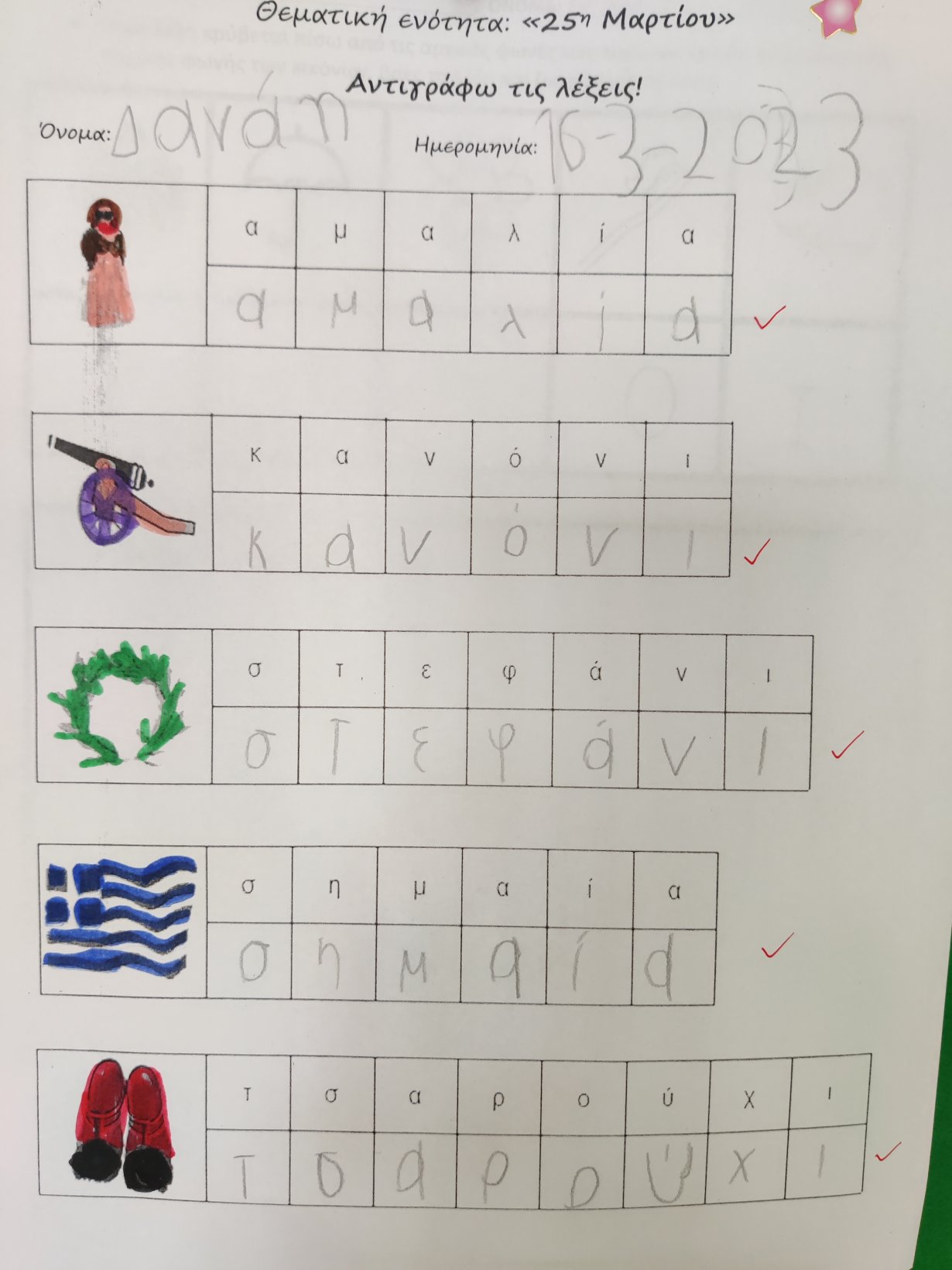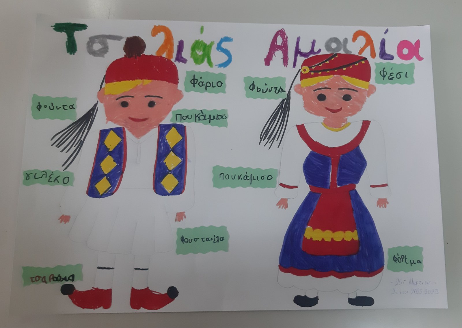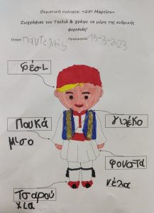 Κόψαμε και κολλήσαμετις προσκλήσεις για την σχολική γιορτή μας.1Διαβάσαμε το βιβλίο «Μπαρούτι για την επανάσταση» της Σοφίας Καλαντζάκου.Βροντοφωνάξαμε το ποίημα μαςστη γιορτούλα που κάναμε για τους γονείς μας.Τραγουδήσαμε,χορέψαμε,και ανήμερα της εθνικής μας εορτής, εκκλησιαστήκαμε, κάναμε αρτοκλασία, παρελάσαμε μέχρι την πλατεία του χωριού,και καταθέσαμε το στεφάνι μας στο μνημείο των πεσόντων.