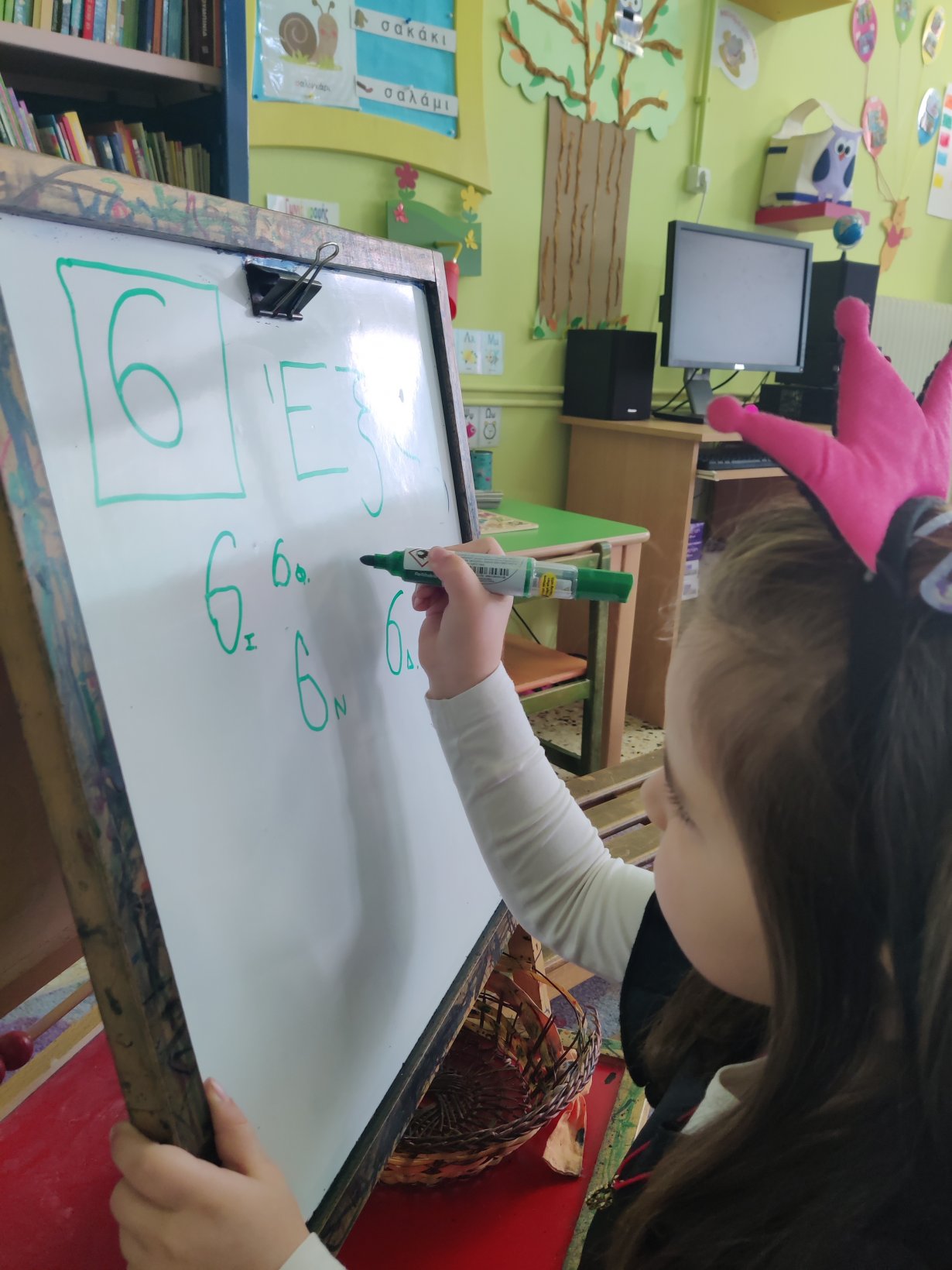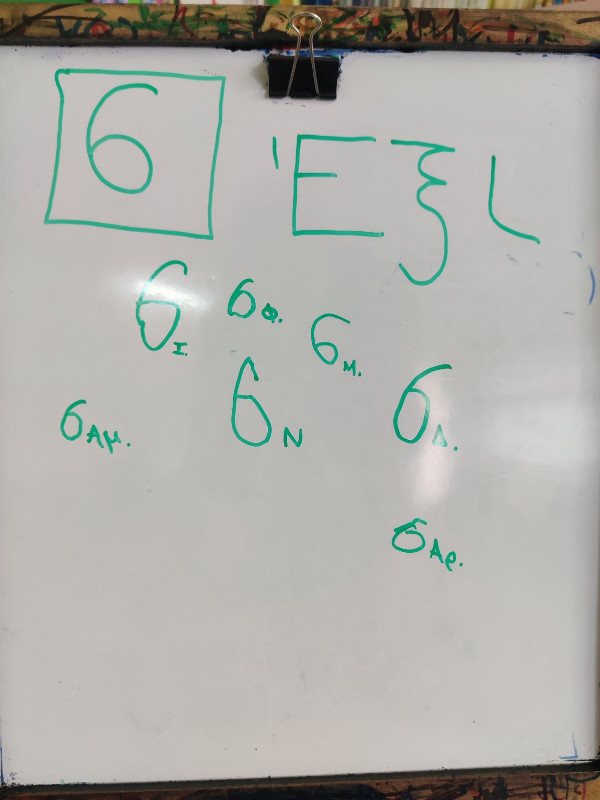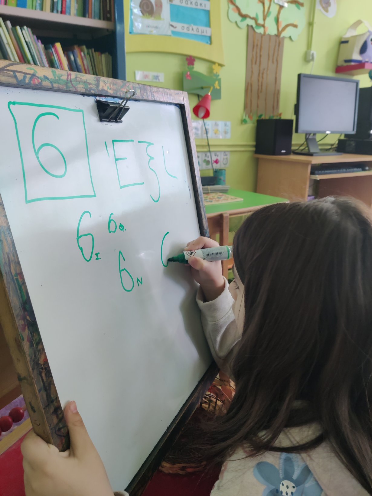Γράψαμε τον αριθμό 6στον ασπροπίνακα της τάξης.Το 6.Βρήκαμε 6 αντικείμενα ο καθένας6 τουβλάκια,6 μαρκαδόρους,6 αυτοκινητάκια,6 γράμματα της αλφαβήτας.