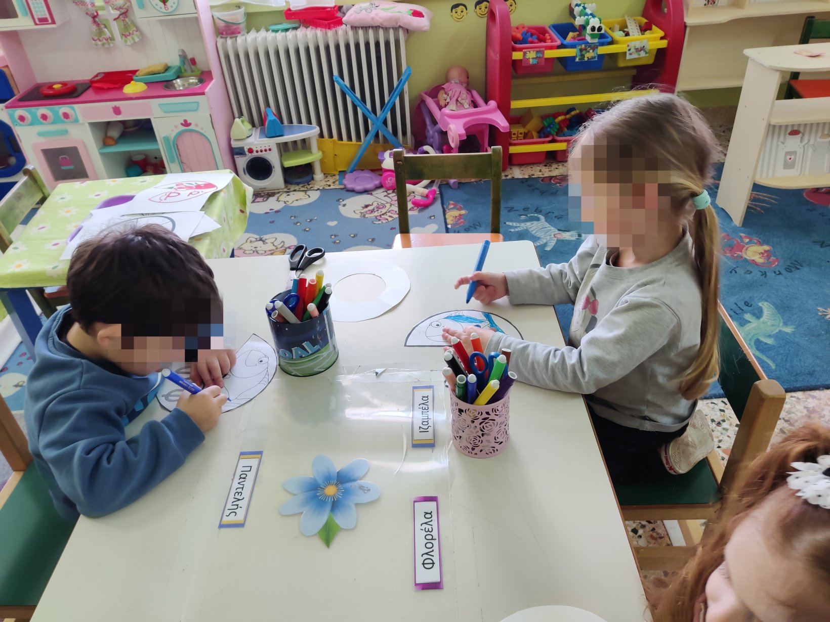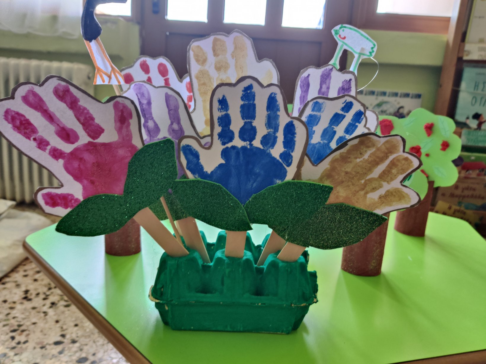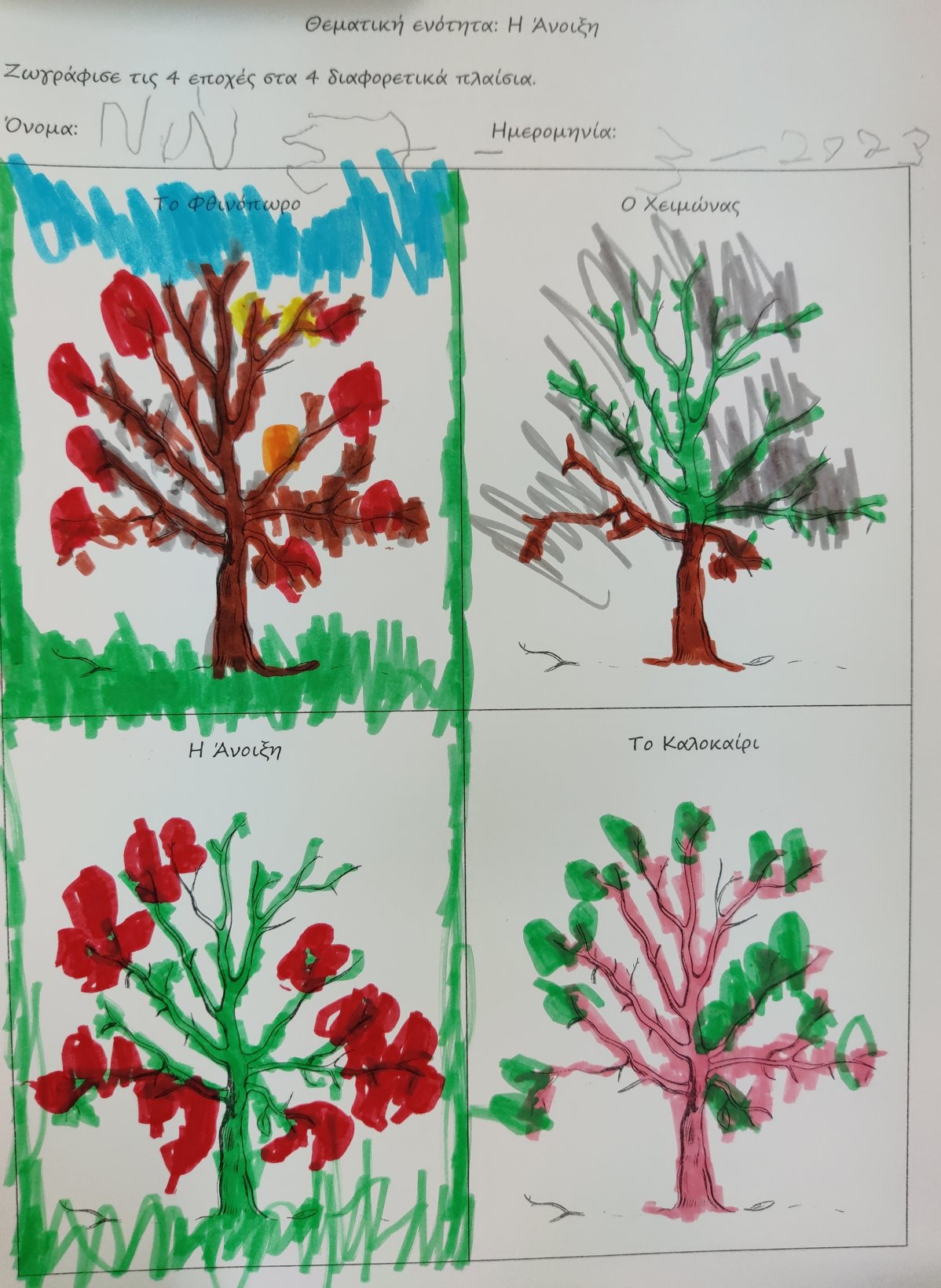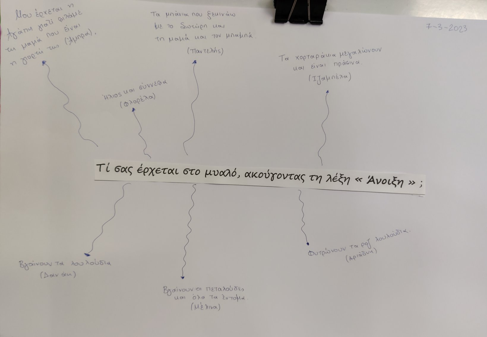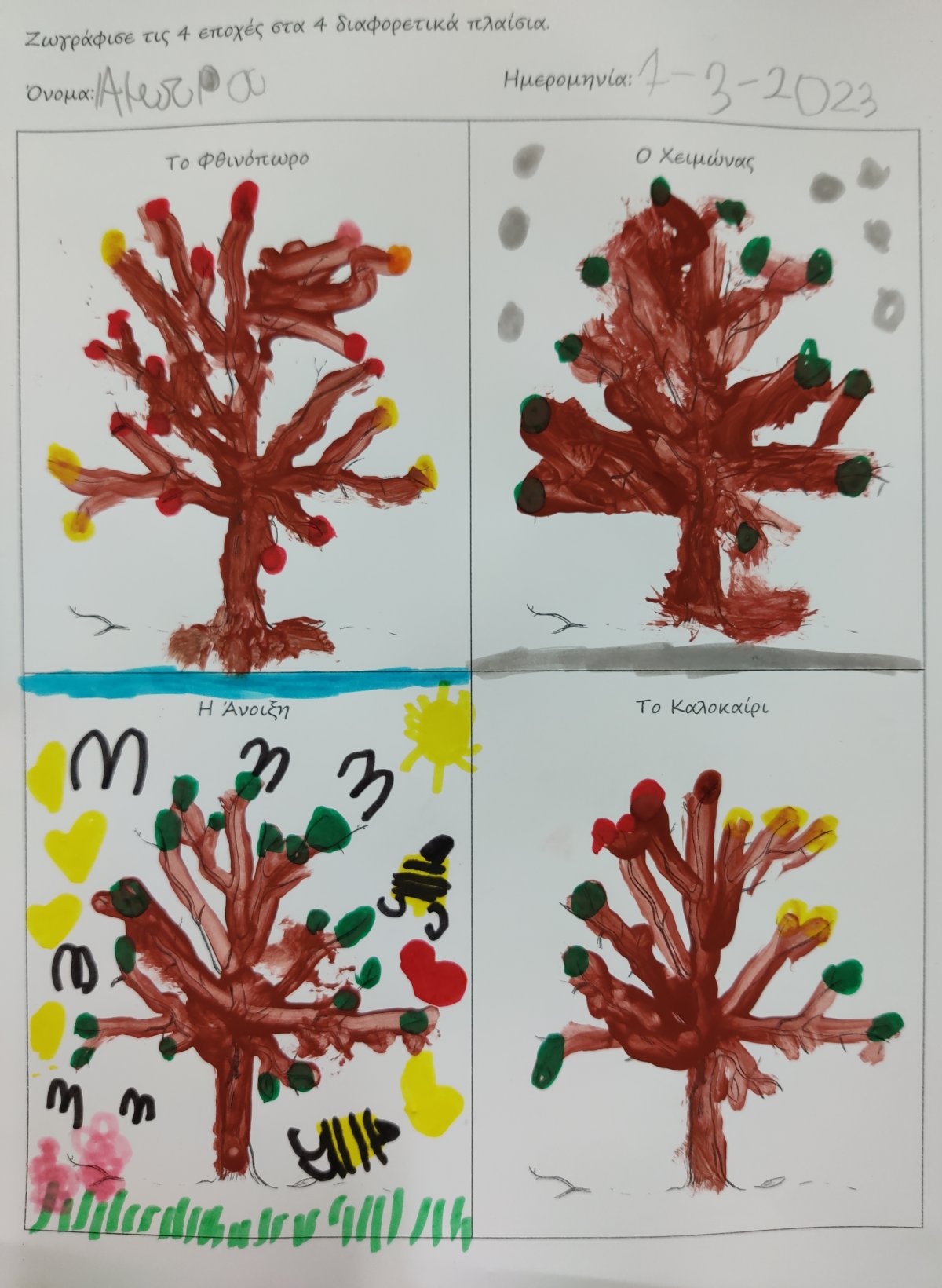 Την ζωγραφίσαμε στον μαυροπίνακά μας.Μάθαμε τον μύθο του Βοριά και του Ήλιου.Ζωγραφίσαμε τα σημεία του μύθουπου μας έκαναν περισσότερο εντύπωσηκαι κατόπιν τα δραματοποιήσαμε. Ο Ήλιος και ο Βοριάς αποφάσισαν να διαγωνιστούν ποιος θα καταφέρει να ρίξει πρώτος την κάπα του διαβάτη.Ο αέρας ξεκίνησε πρώτος να φυσάει δυνατά.Ο διαβάτης τυλίχτηκε με την κάπα του για να μην κρυώσει.Κατόπιν ο Ήλιος έστειλε τις ζεστές του ηλιαχτίδες στη Γη.και ο διαβάτης, έβγαλε την κάπα του για να δροσιστεί. Νικητής ανακηρύχθηκε ο Ήλιος!Με το αποτύπωμα της παλάμης μας, φτιάξαμε τον πιο όμορφο ανοιξιάτικο κήπο.Προσεγγίσαμε την Άνοιξη μέσα από τις αισθήσεις μας.Πώς την αντιλαμβανόμαστεμέσω της αφής, της όρασης, της γεύσης, της όσφρησης και της όρασης;