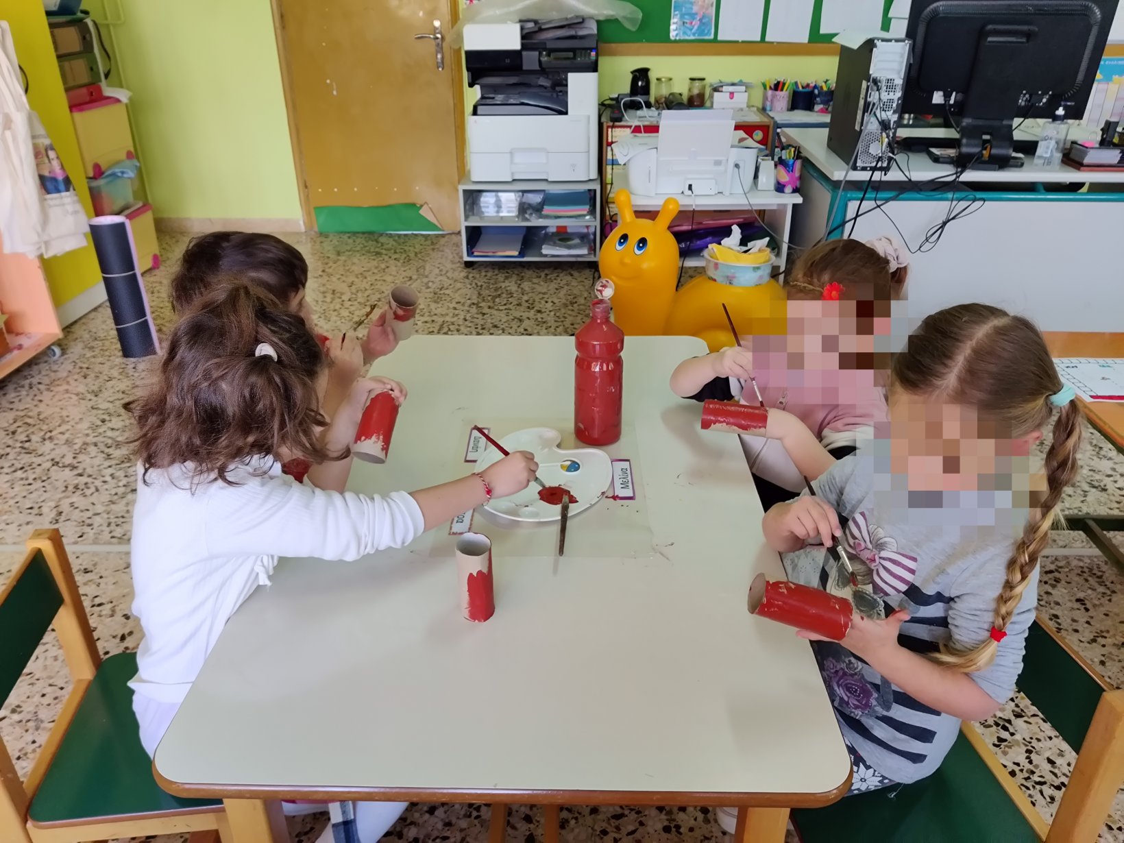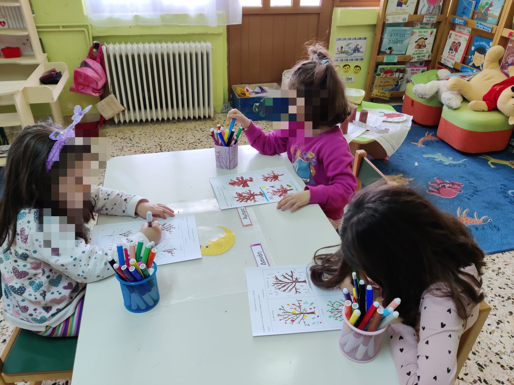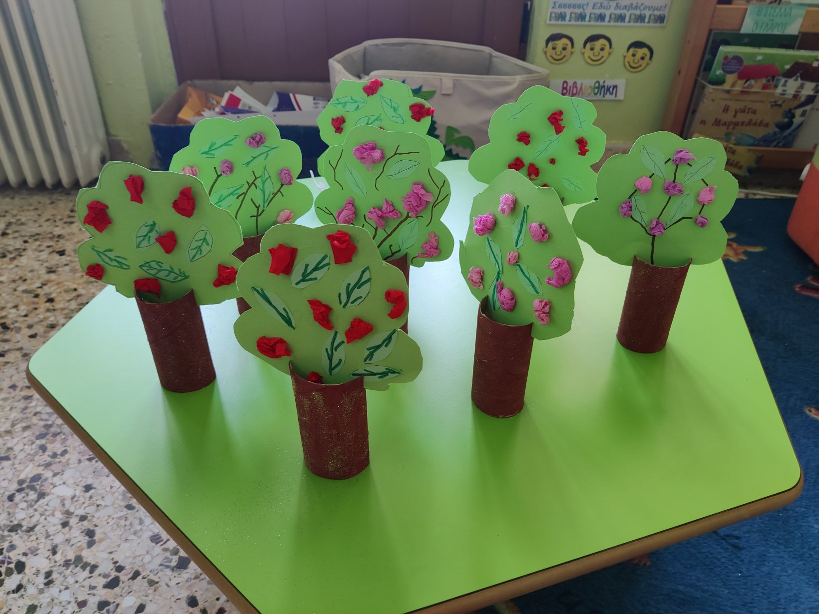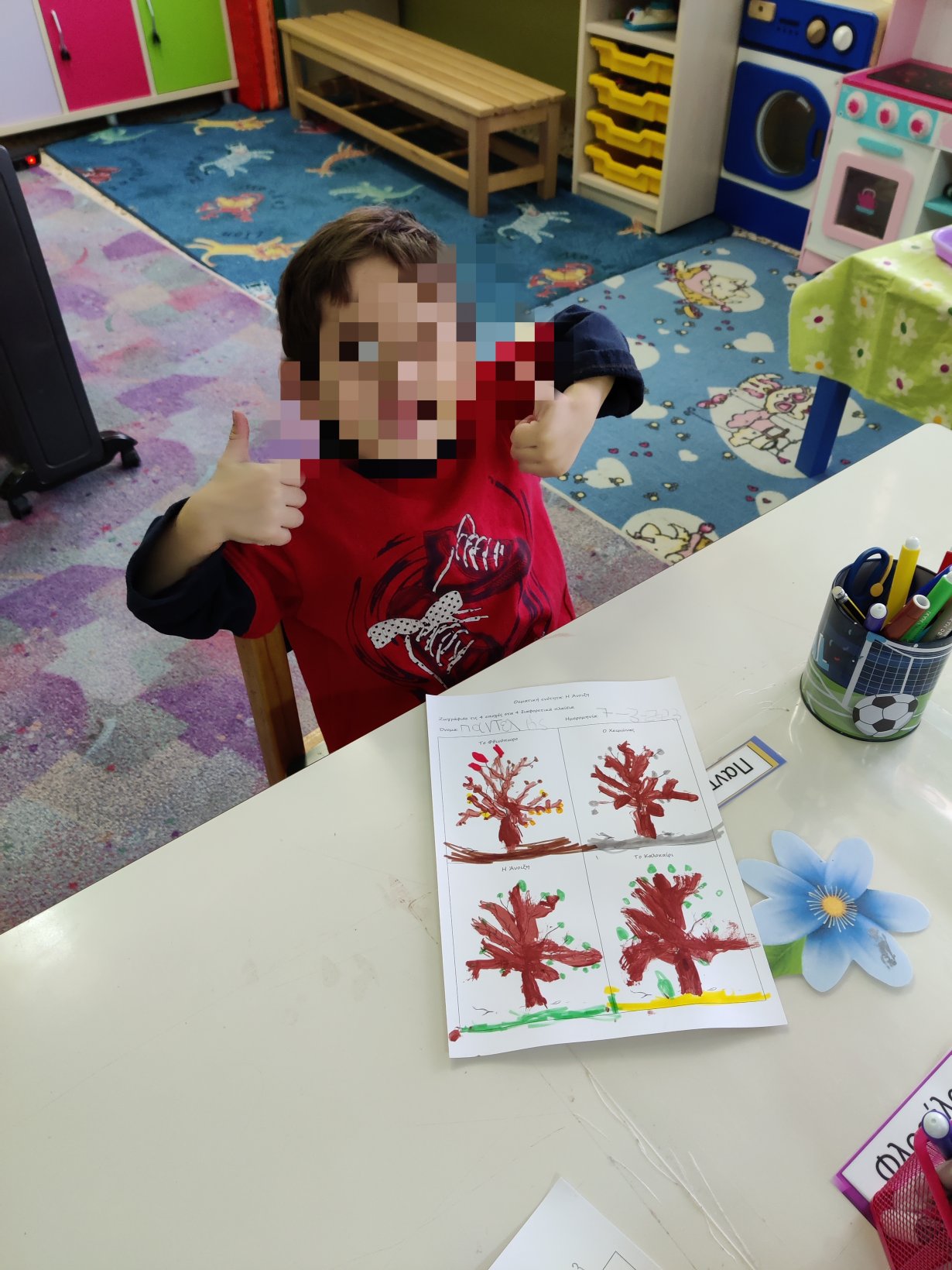 Καταγράψαμε σε ιστόγραμμα τις ήδη υπάρχουσες γνώσεις των παιδιών για την Άνοιξη.Κάναμε επανάληψη τους αριθμούς από το 1 έως το 5.και βάψαμε με μία μπατονέτα τόσα κουτάκια όσα μας υποδείκνυε ο αριθμός κάθε φορά.Θυμηθήκαμε τα χρώματατων προηγούμενων εποχώνκαι τα αποδώσαμε στο δέντροτης κάθε εποχής.Βάψαμε ρολά υγείαςκαι τα μετατρέψαμε σε ανοιξιάτικα δέντρα.Η κατασκευή μας.Συνθέσαμε τη λέξη “Άνοιξη”.Με τα γράμματα του παζλ.Με τα τουβλάκια απ’ το οικοδομικό υλικό της τάξης.Είδαμε στον υπολογιστή παρουσίαση με τα γεγονότα που εκτυλίσσονται την Άνοιξη και προσπαθήσαμε να τα περιγράψουμε.