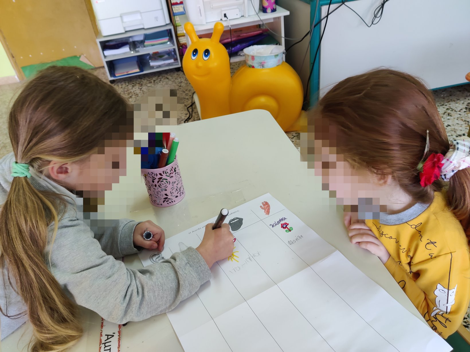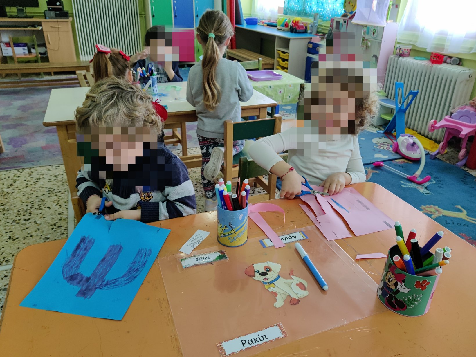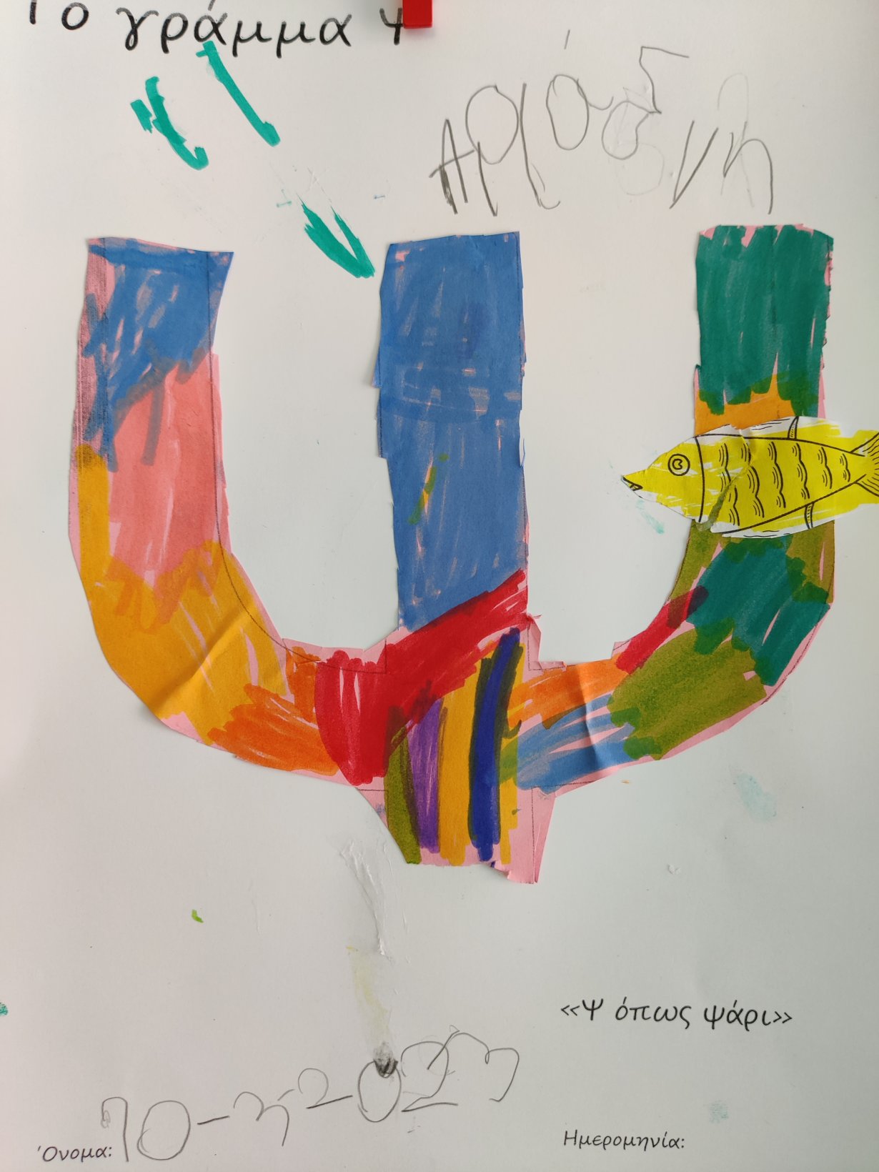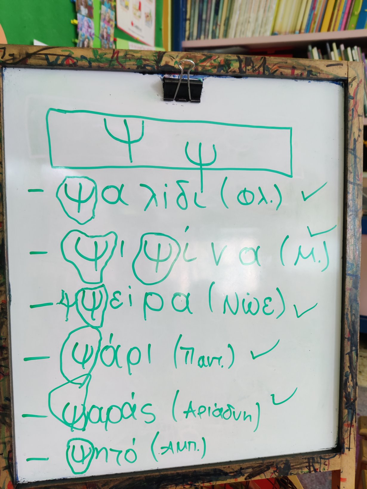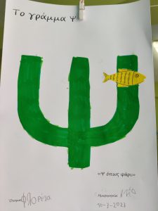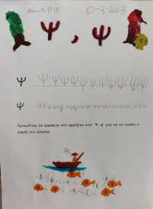 Παρακολουθήσαμε την ιστορία της ψιλοτάκουνης ψιψίνας.Βρήκαμε λέξεις που αρχίζουν απ’ τη φωνούλα ψκαι κυκλώσαμε το γράμμα όπου το βρήκαμε.Το γράψαμε πολλές φορές, κεφαλαίο και μικρό και το εντοπίσαμε ανάμεσα σε άλλα.Κόψαμε, κολλήσαμεκαι φτιάξαμε την κατασκευή του ψ.Ψ όπως ψάρι.Ζωγραφίσαμε τον τροχό του Ψ.1
