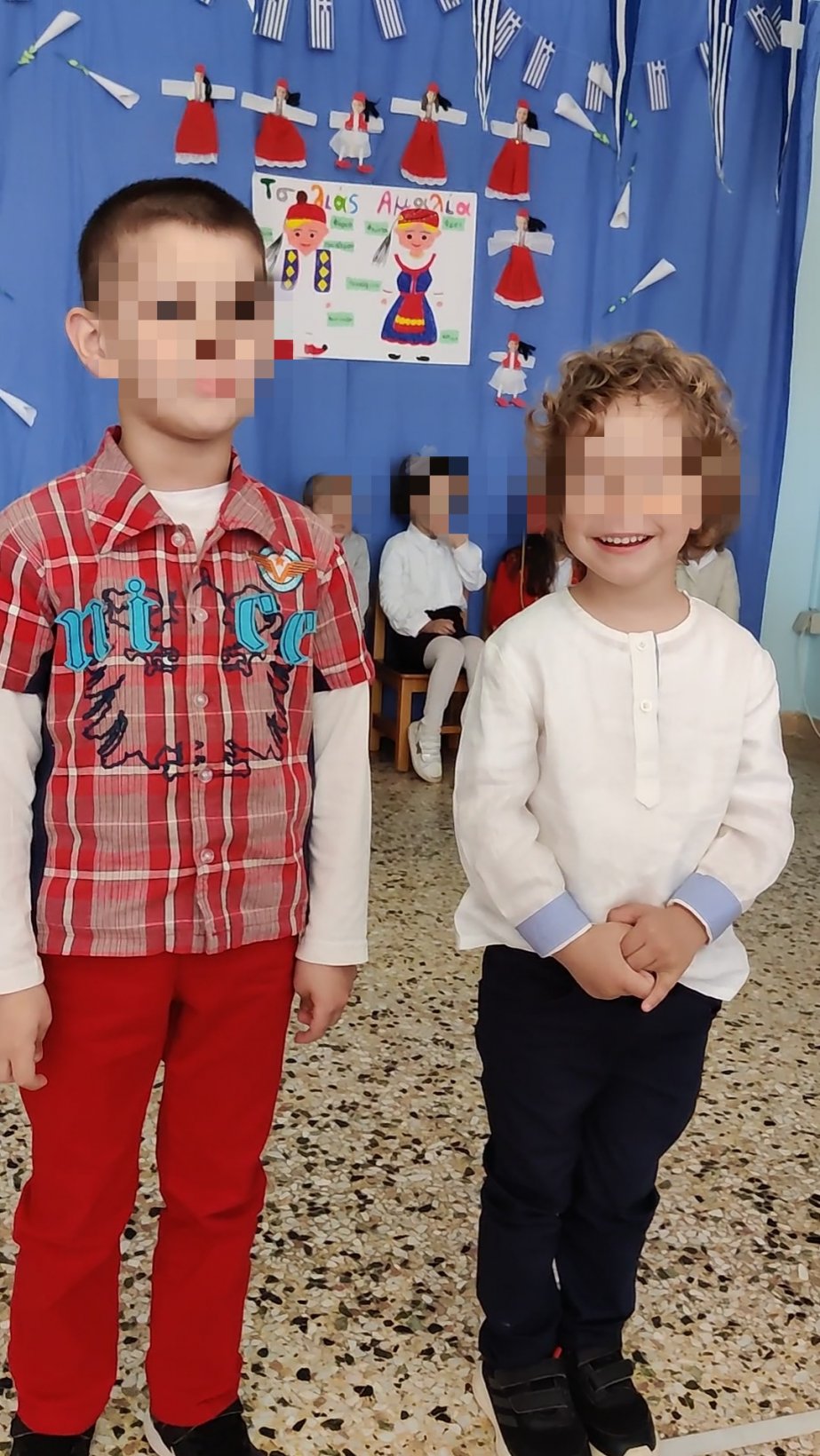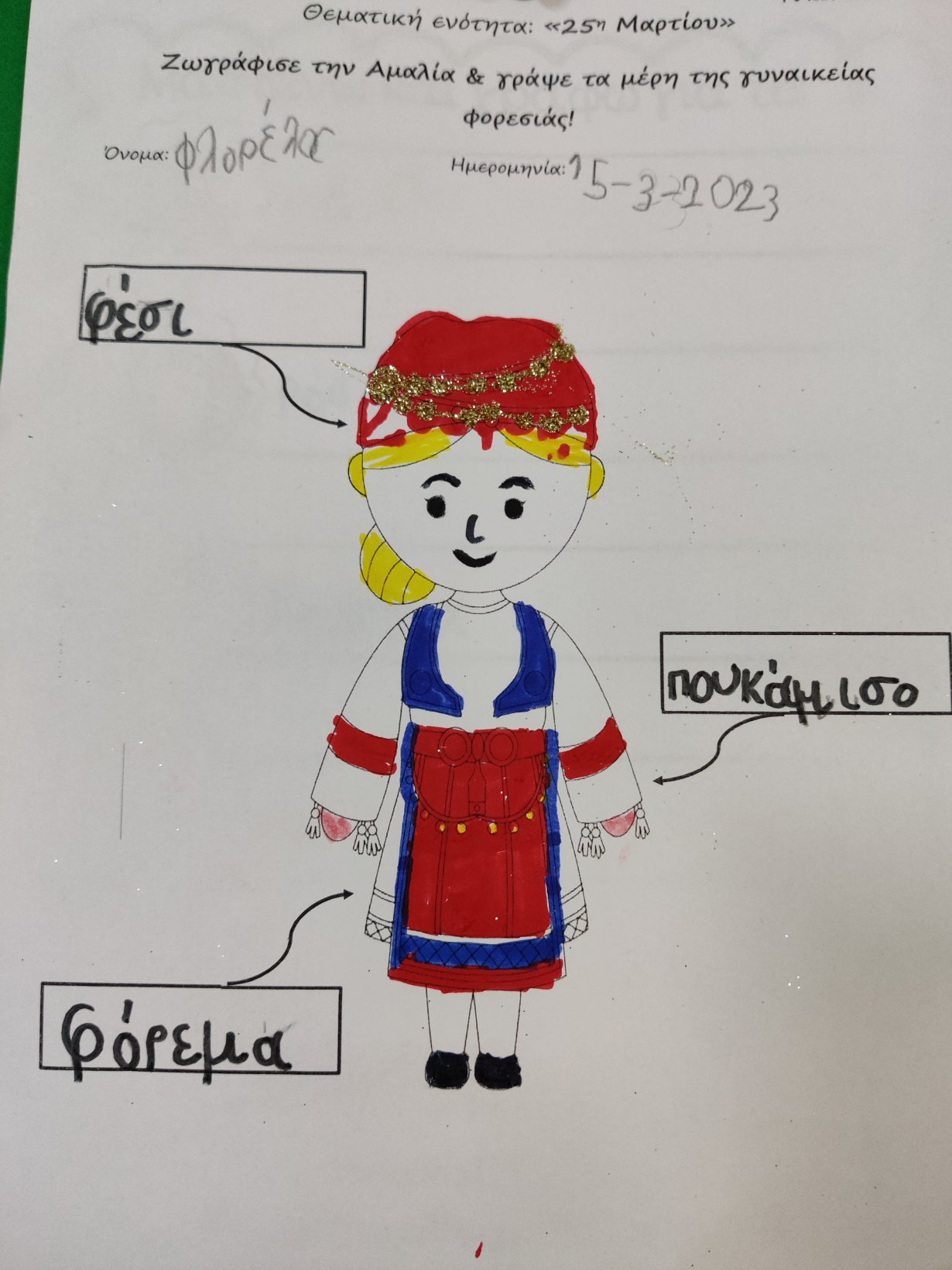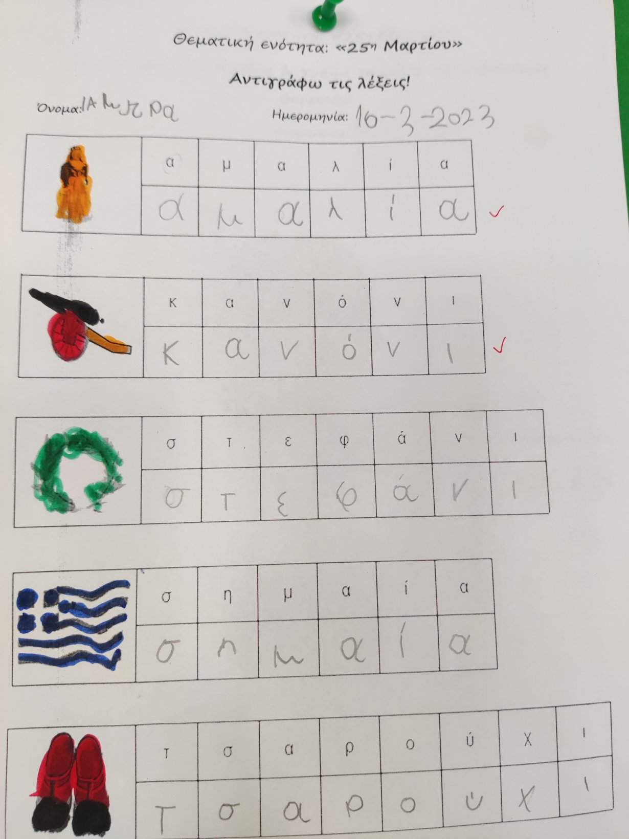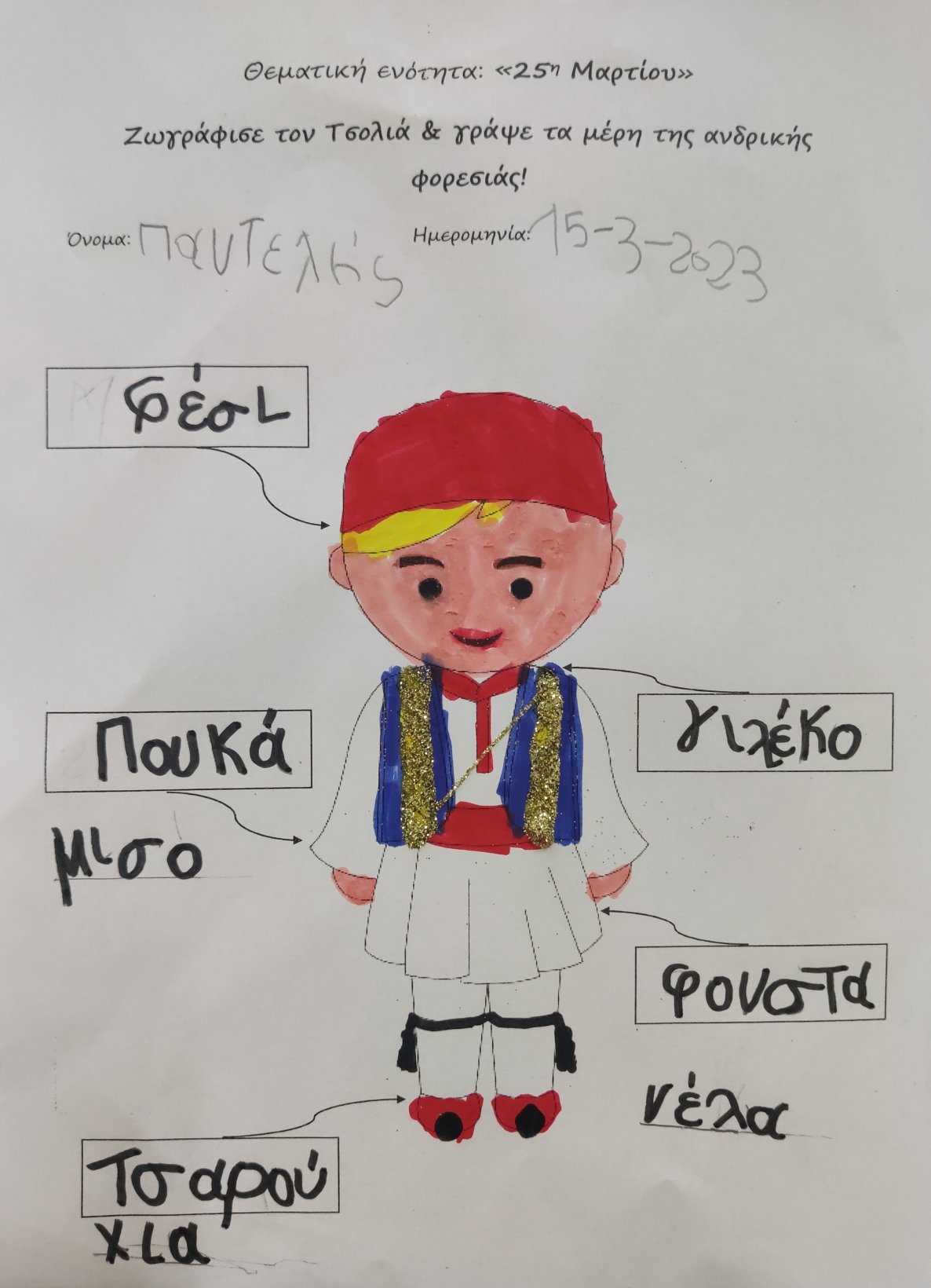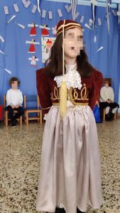 Μιλήσαμε για τη φορεσιά των Ελλήνων στην επανάσταση του 1821.Σκιτσάραμε τις στολές του Τσολιά και της Αμαλίας.και τις ζωγραφίσαμε.Γράψαμε τις ονομασίες των επιμέρους κομματιών.Έτοιμη η ομαδική μας κατασκευή!1Κατόπιν τις γράψαμε σε φύλλο εργασίας.12Γράψαμε και λεξούλες σχετικέςμε την Ελληνική επανάσταση.Κόψαμε λευκό χαρτόνι.Βάψαμε με πράσινη μπογιά ξύλινα καλαμάκια για βλαστό.Κόψαμε τα φύλλα.Έτοιμα τα κρινάκια μας!1Γνωρίσαμε τους Ήρωες της Ελληνικής επανάστασης και πολλά από τα σημαντικά γεγονότα της περιόδου.Αντιστοιχήσαμε τα ονόματα τουςμε τις καρτέλες αναφοράς.Κόψαμε τμήματα της στολής των Ελλήνων αγωνιστών,κολλήσαμε πούλιες και χρυσόσκονεςκαι κολλήσαμε τη φωτογραφία μας.Μάθαμε την τεχνική του pixel. Ζωγραφίσαμε τα κουτάκια με τα υποδεικνυόμενα χρώματα και αναδείχτηκαν οι ελληνικές φορεσιές (Ευχαριστούμε την Νηπιαγωγό Λίτσα Γεραλή που μας εμπιστεύτηκε το υλικό της).ΤσολιάςΑμαλίαΠαρακολουθήσαμε του ήρωες του 1821 να ζωντανεύουν μπροστά στα μάτια μας με τη βοήθεια της τεχνολογίας.