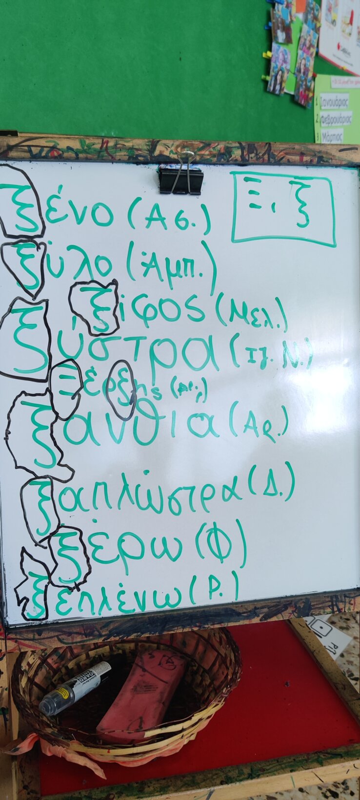 α) Παρακολουθήσαμε μία παρουσίαση για το γράμμα Ξ και εντοπίσαμε τη “φωνούλα” του στις λέξεις.β) Καταγράψαμε λέξεις που αρχίζουν από την φωνούλα αυτήκαι κυκλώσαμε το γράμμα μέσα σε αυτές.γ) Το γράψαμε για να μάθουμε τον τρόπο γραφής τουδ) και το μετατρέψαμε σε ένα πολύχρωμο ξυλόφωνο.