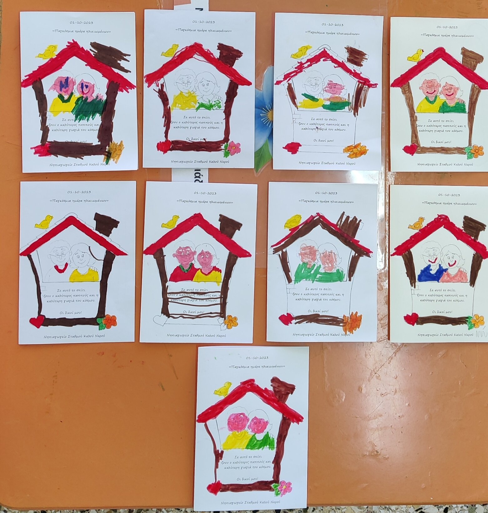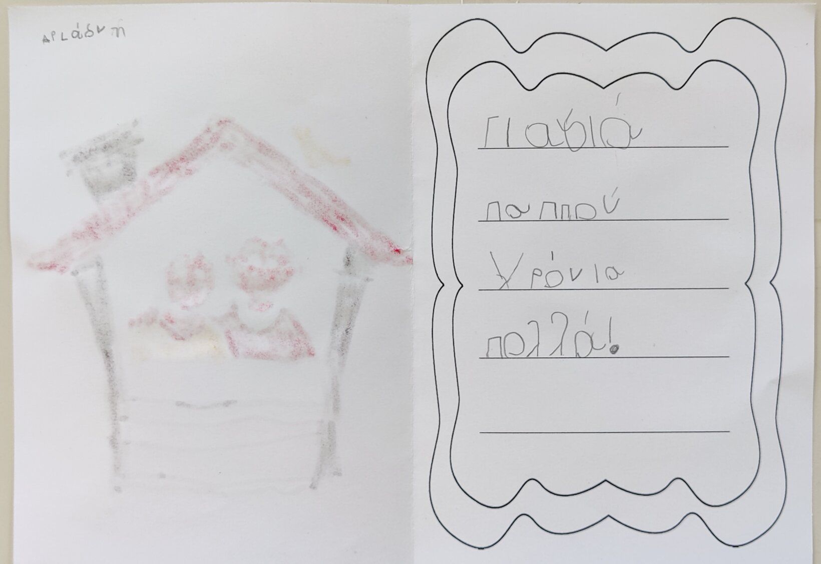 Περιγράψαμε πίνακες ζωγραφικής με θέμα τους ανθρώπους της 3ης ηλικίας.Ζωγραφίσαμε τον παππού και τη γιαγιά.και γράψαμε τις ευχές μας.Το εσωτερικό της κάρτας.Το εξώφυλλο