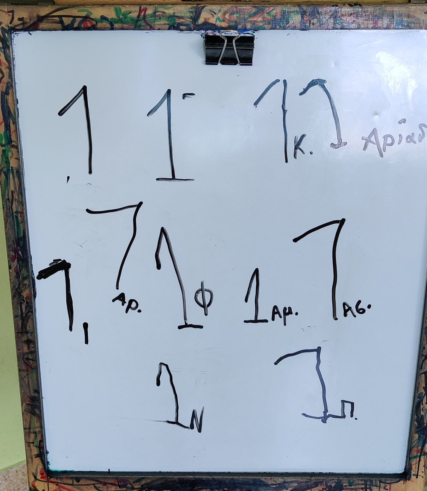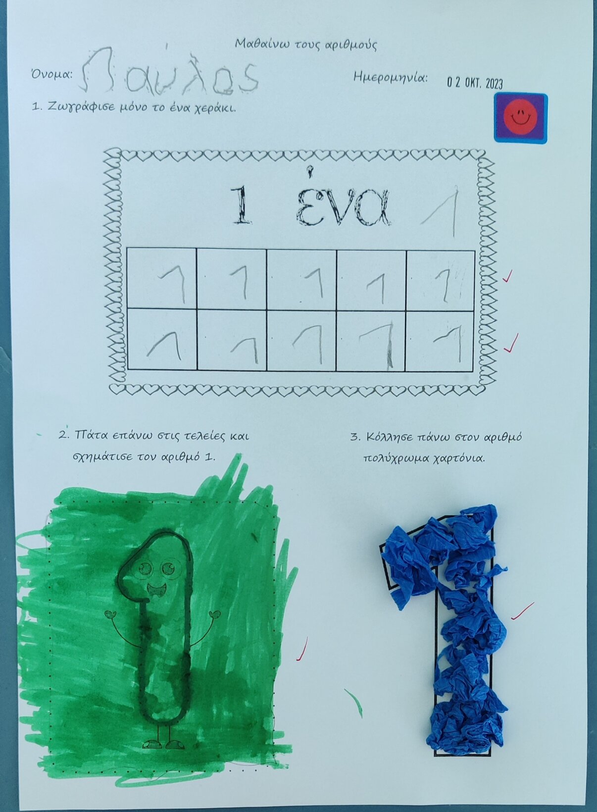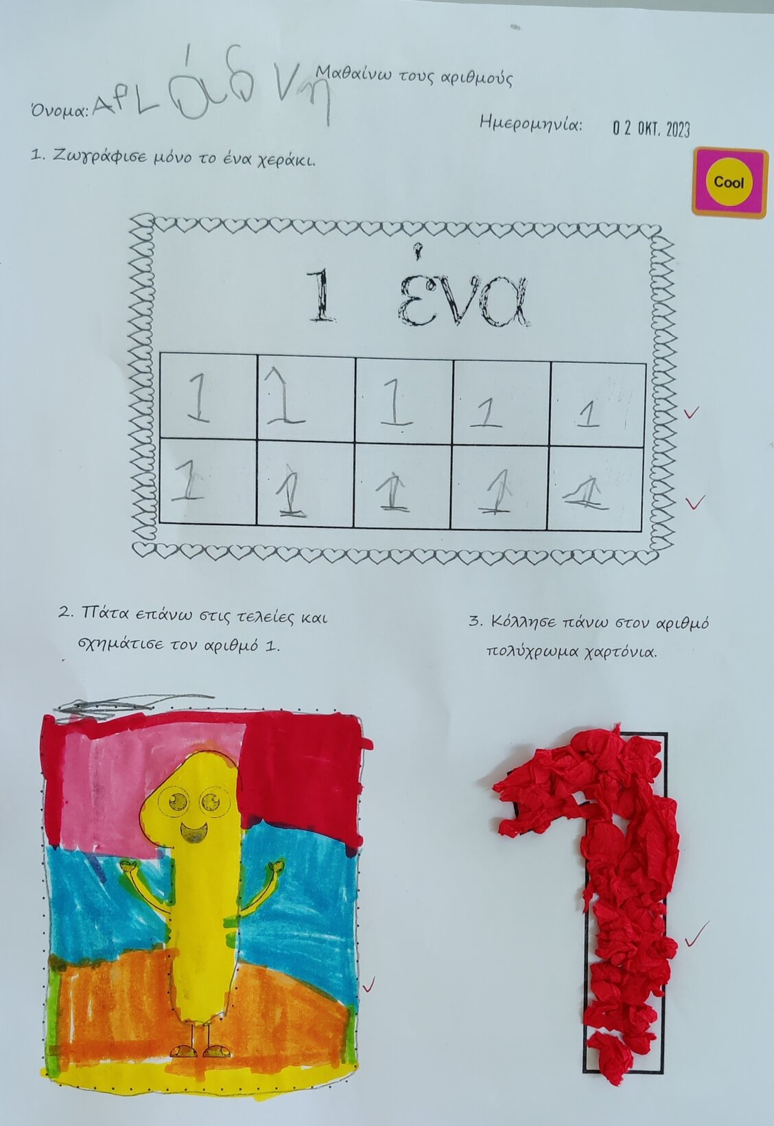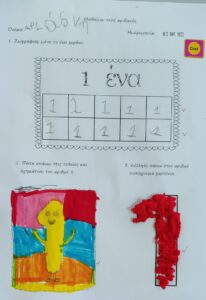 Γράψαμε τον αριθμό 1στον ασπροπίνακα.Κόψαμε πολύχρωμα χαρτιά γκοφρέ,τα κάναμε μπαλίτσεςσχηματίσαμε το 1 και το γράψαμε πολλές φορές.