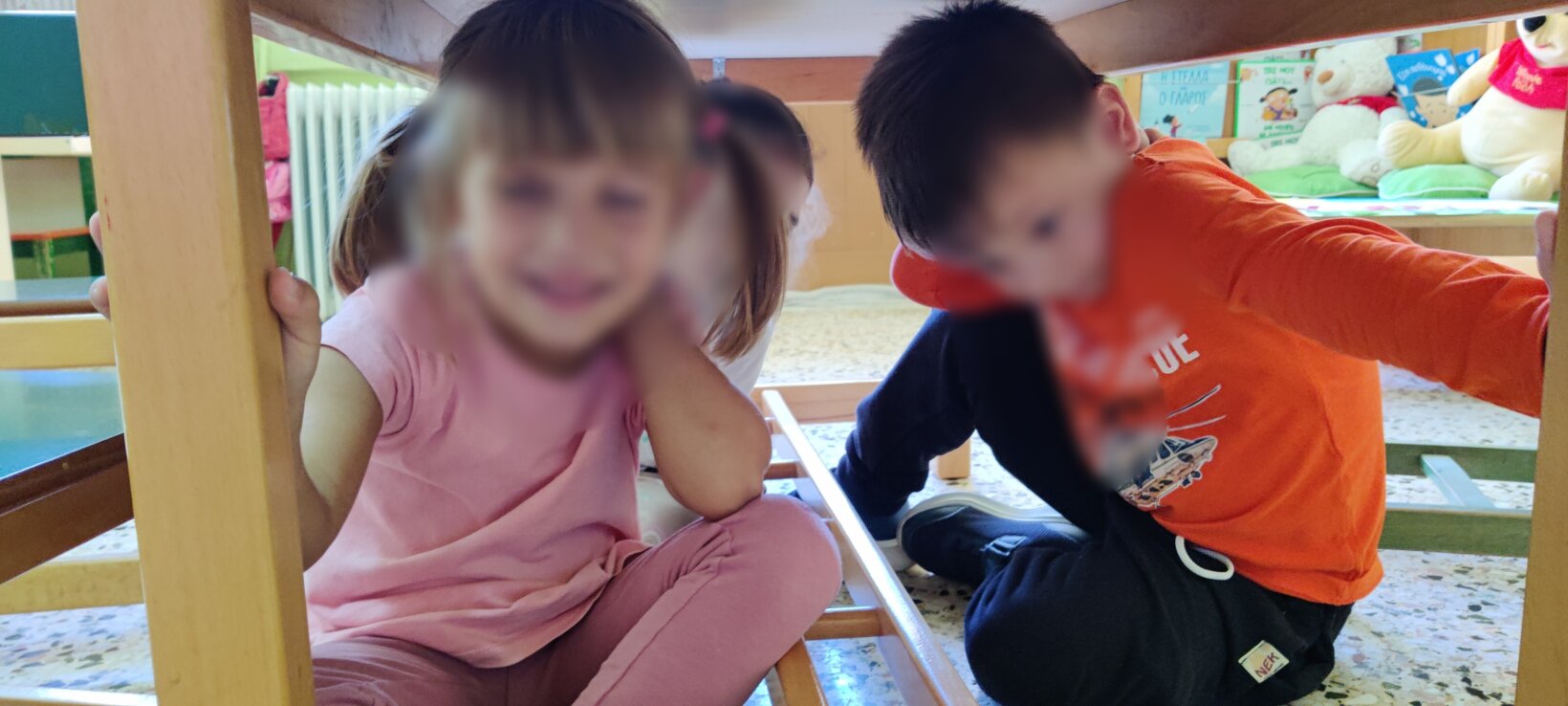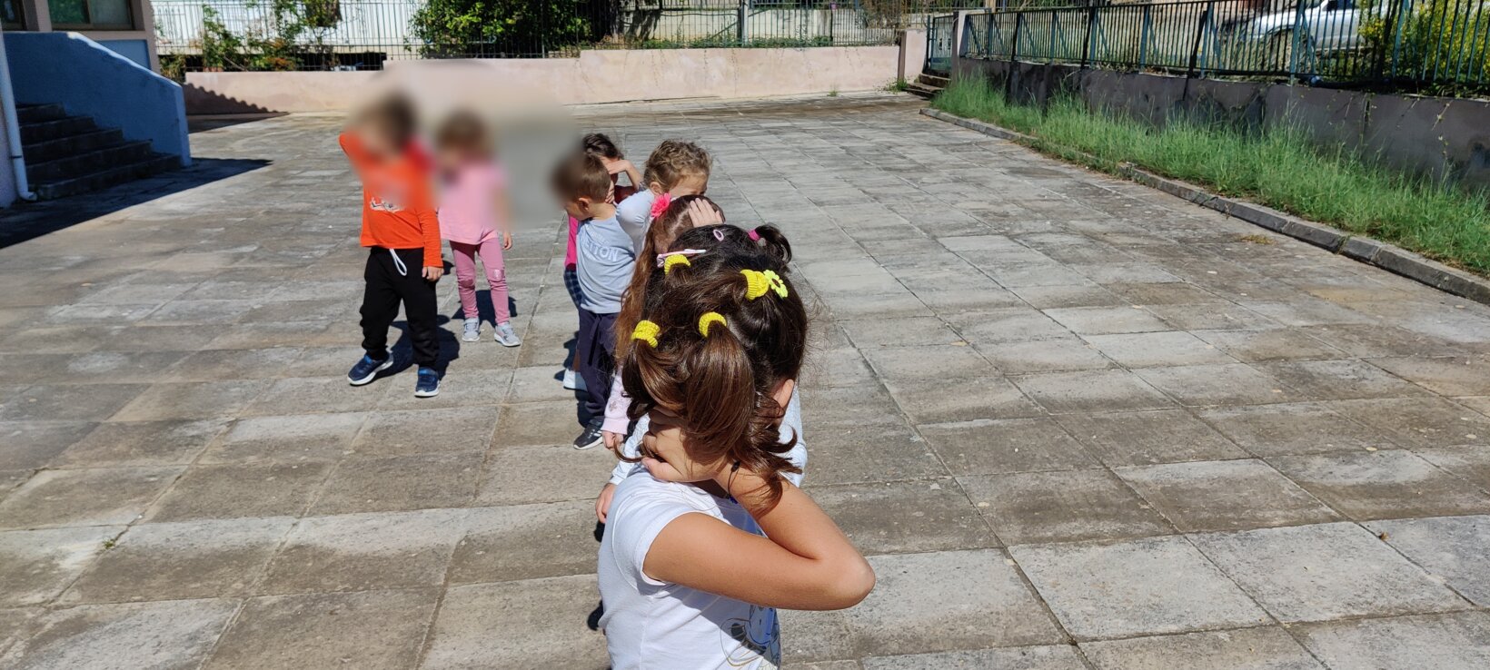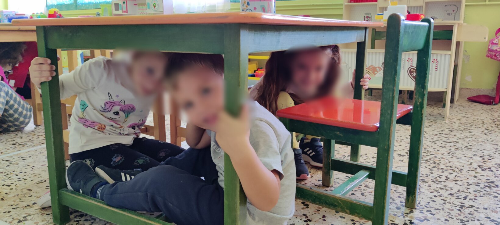 Η σφυρίχτρα της κυρίας ήχησε 3 φορές. 1η άσκηση σεισμού για τη φετινή χρονιά.Όλοι χωρίς πανικό κάτω απ’ τα τραπεζάκια,κρατάμε με το ένα χέρι το πόδι του τραπεζιού και με το άλλο προστατεύουμε τον αυχένα μας.Με τη λήξη του “σεισμού”,όλοι με τρένο βγήκαμε έξω στο μέρος διαφυγής-τη βρύση του σχολείου μας.