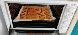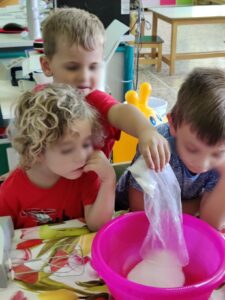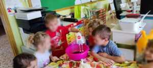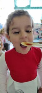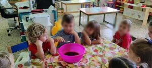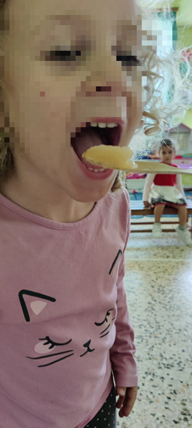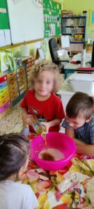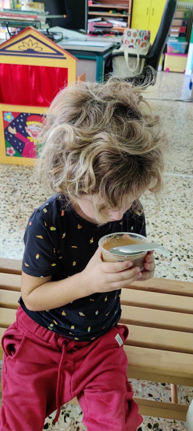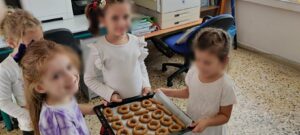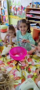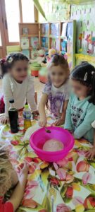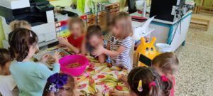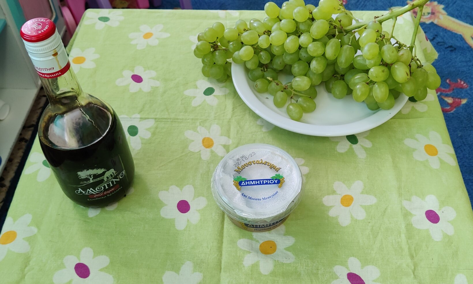 Μιλήσαμε για τον τρύγο. Δοκιμάσαμε σταφύλια,πετιμέζικαι μουσταλευριά και περιγράψαμε τις γεύσεις.Επιστρατεύσαμε όλες μας τις αισθήσεις.Σε ένα μπολ ρίξαμε ζάχαρη,λάδι,κανέλα,γαρύφαλλο,baking powder και αλεύριτα ανακατέψαμε με το μίξερκαι φτιάξαμε μία μυρωδάτη ζύμη.Την πλάσαμε με τα χεράκια μαςφτιάξαμε όμορφα μουστοκούλουρατα φουρνίσαμε, φάγαμε και κεράσαμε και τους δικούς μας.Μάθαμε ποια ποτά προέρχονται από το σταφύλι, τη διαδικασία για να φτάσουμε από το αμπέλι στο κρασί και μιλήσαμε για τον Διόνυσο.Σειροθετήσαμε τις λέξεις της πρότασης “Διόνυσος, ο θεός του κρασιού”.