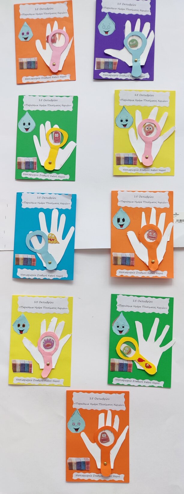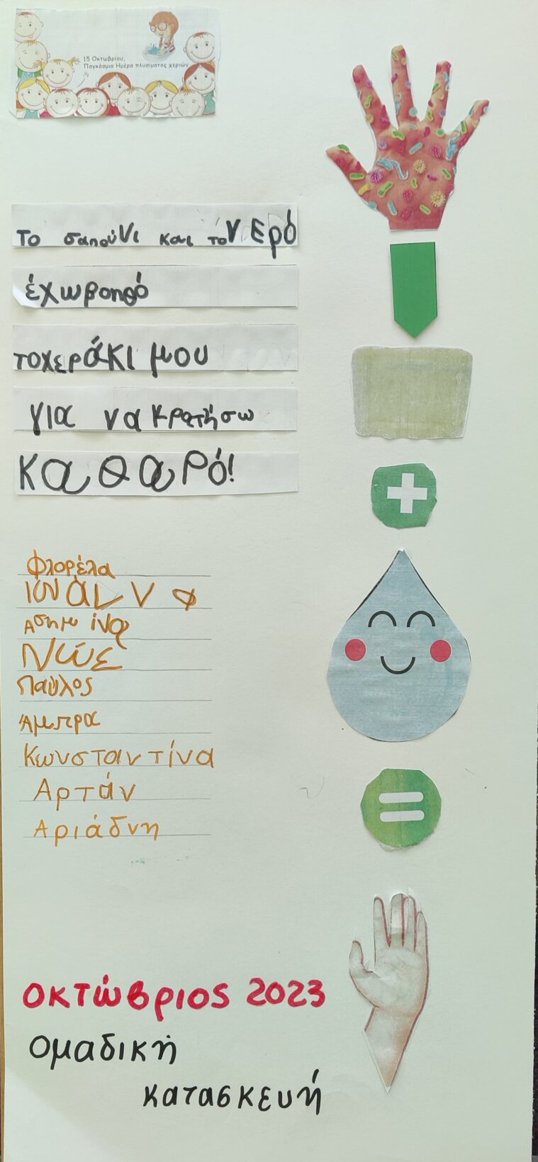 Η 15η Οκτωβρίου έχει οριστεί ως η Παγκόσμια ημέρα πλυσίματος χεριών. Θυμηθήκαμε όσα είχαμε αναφέρει στις αρχές του σχολικού έτουςκι αφού σχεδιάσαμε και κόψαμε τις παλάμες των χεριών μας. Τους κολλήσαμε και το μικρόβιο και τον μεγεθυντικό φακό, για να μην μας ξεφύγει,κολλήσαμε το σαπούνι και το νερό και φτιάξαμε μια ενημερωτική κάρτα για τους γονείς μας.Φτιάξαμε, μάθαμε,γράψαμε το σύνθημά μαςκαι δημιουργήσαμε μια αφίσα για την παγκόσμια ημέρα.