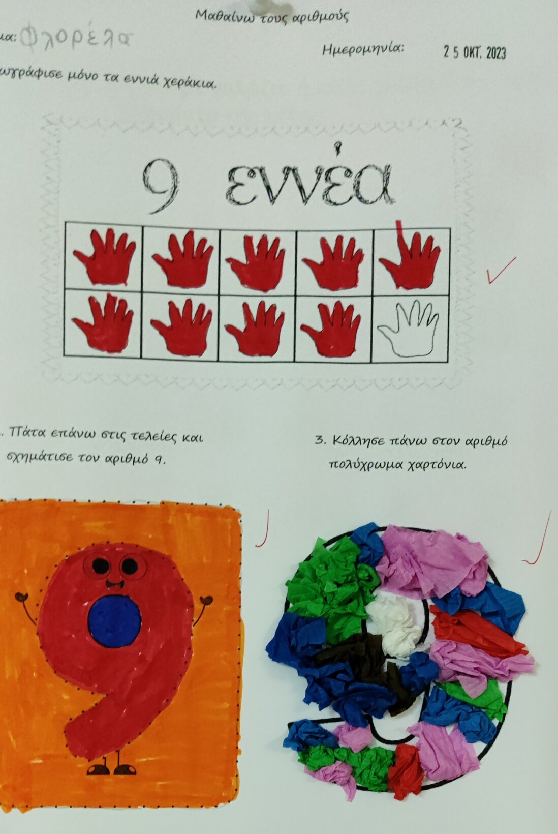 Ανιχνεύσαμε ποσοτικά τον αριθμό 9.Μετρήσαμε 9 χάντρες, 9 σφαίρες, 9 μαρκαδόρους, 9 κεφάλια παιδιώνκαι σχηματίσαμε το 9 με το μολύβι, με μαρκαδόρους με χαρτί γκοφρέμε μαρκαδόρους με χαρτί γκοφρέ.Το γράψαμε πολλές φορές στο φύλλο εργασίας.Διαβάσαμε την ιστορία του Οκτωβρίου από το βιβλίο “Τα παιδιά του Φθινοπώρου”.