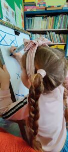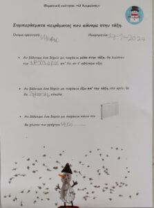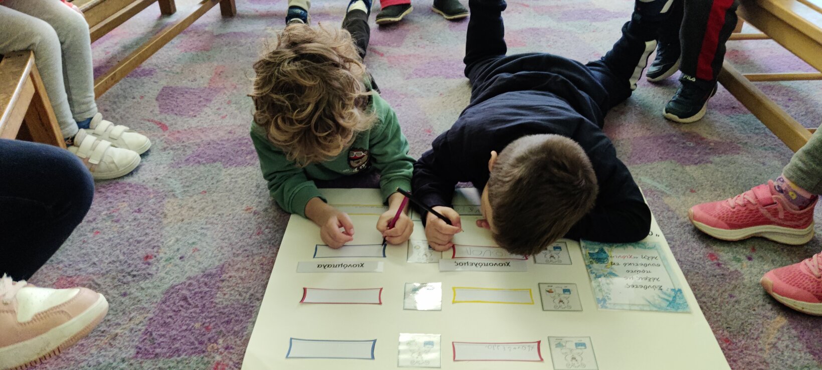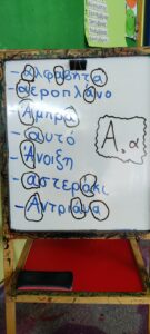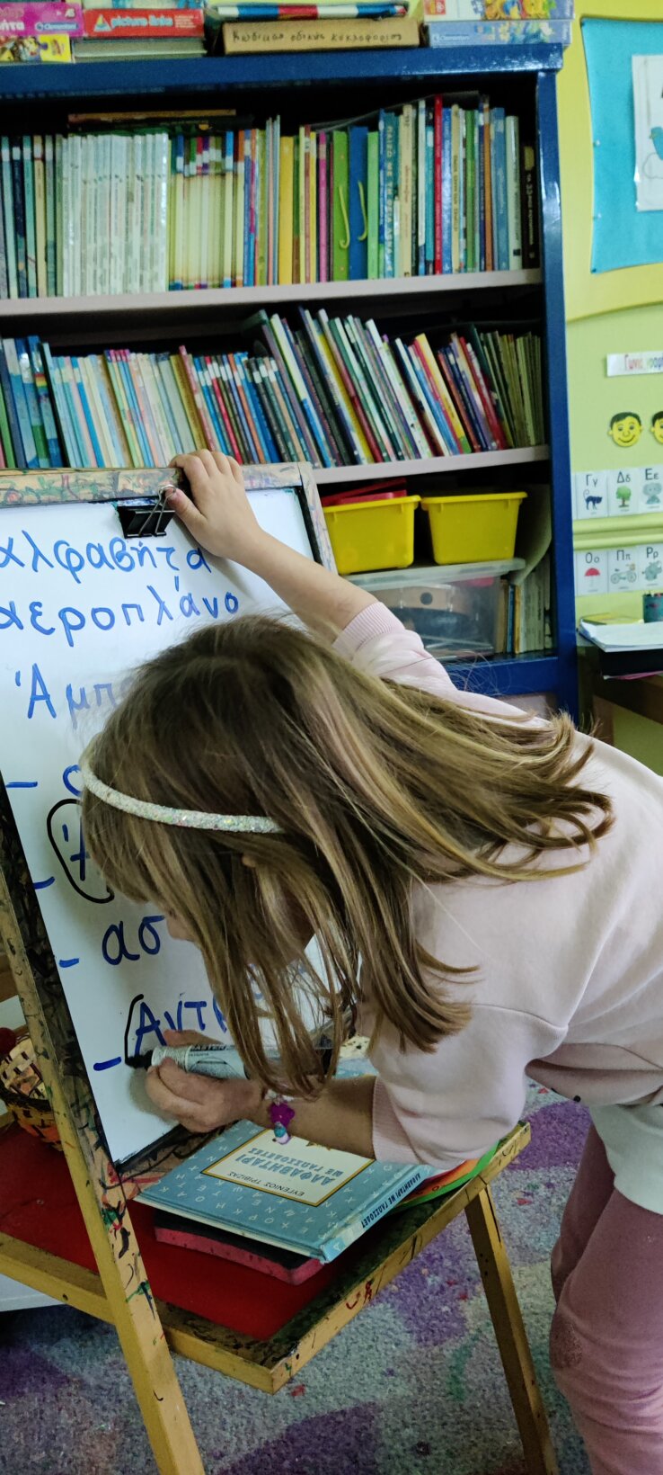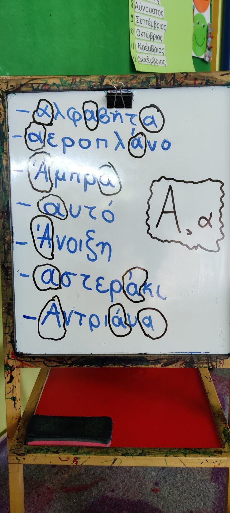 Με την επιστροφή μας, μιλήσαμε, καταγράψαμε και ζωγραφίσαμε τα highlights των διακοπών μας.Συζητήσαμε στην ολομέλεια για την διάθεση των ανθρώπων να βάζουν νέους στόχους με την έλευση κάθε νέας χρονιάς.Κόψαμε λοιπόν, ζωγραφίσαμε και κολλήσαμε τις αναμνήσεις μας από το 2023.και θέσαμε το στόχο μας για το 2024.Συνθέσαμε με τα υλικά της τάξης τους αριθμούς της νέας χρονιάς.Με τους αριθμούς από το ημερολόγιο της τάξης.2024Το συμπληρώσαμε σε φύλλο εργασίας.Το γράψαμε και στα παιχνίδια μας κατά την ελεύθερη ώρα.Μάθαμε το γλωσσοδέτη με το αρκουδάκι που ήθελε να αγγίξει ένα αστεράκι.Βρήκαμε λέξεις που αρχίζουν από α.και το εντοπίσαμε τόσο στον πίνακαόσο και στις καρτέλες της ανάγνωσης.α όπως αλάτιΗ γωνιά της γραφήςΠαρακολουθήσαμε την ιστορία της αχτένιστης αγελάδας και μάθαμε το τραγούδι “Αχ και να’μουν αχινός”.