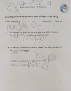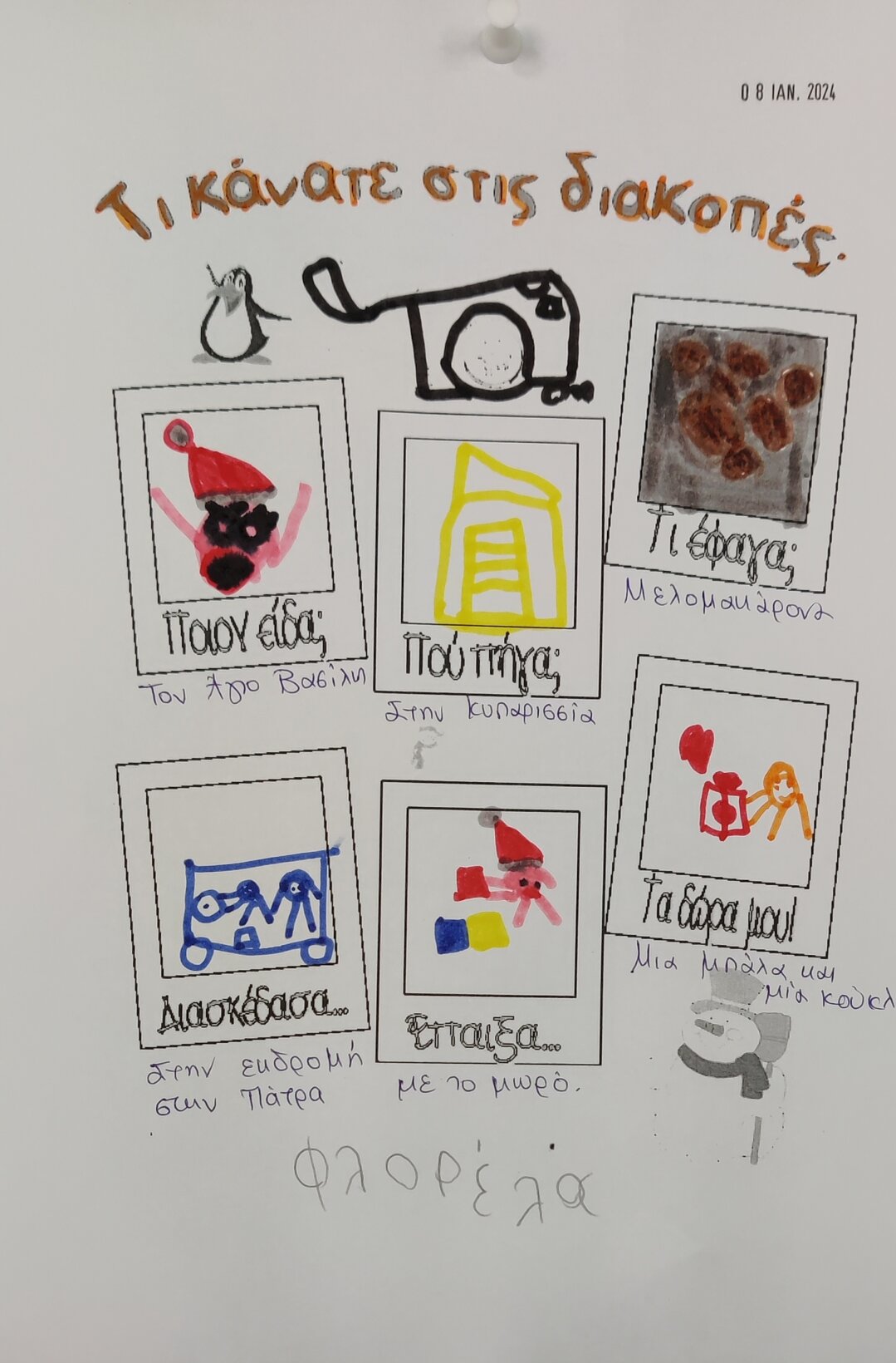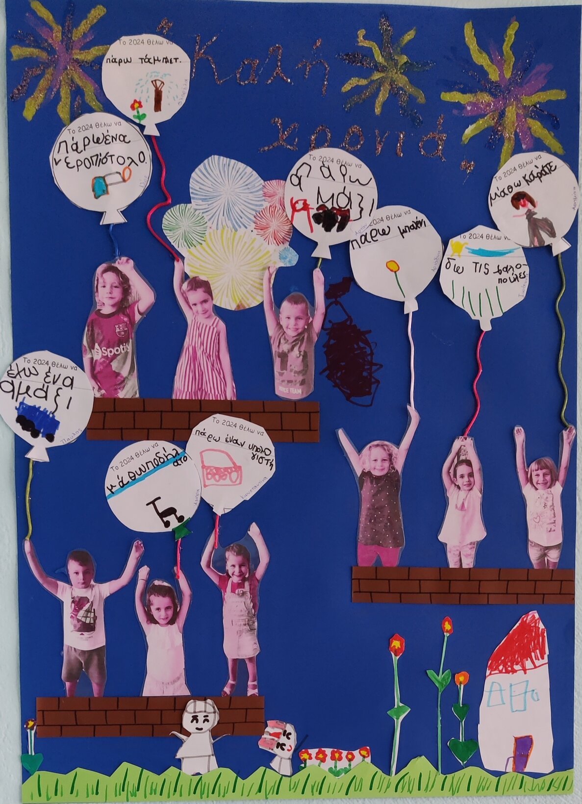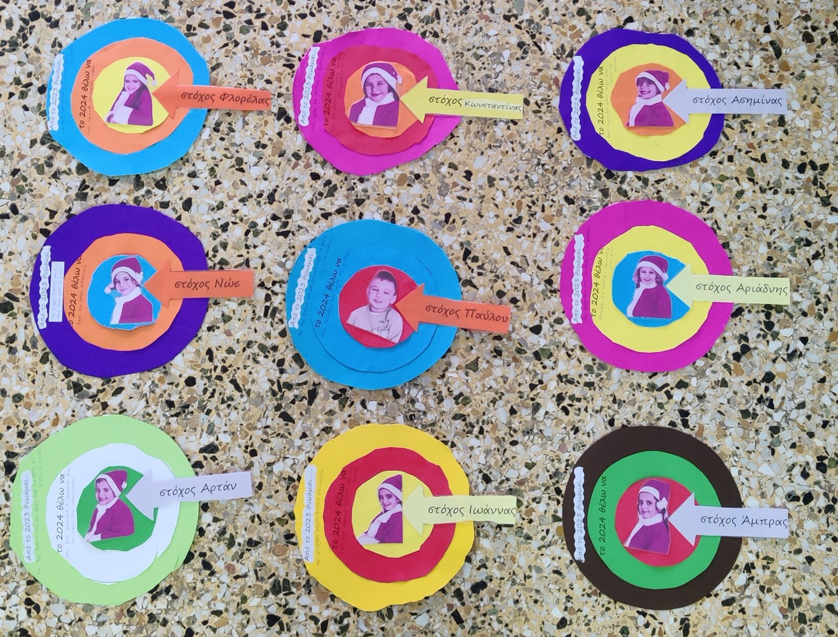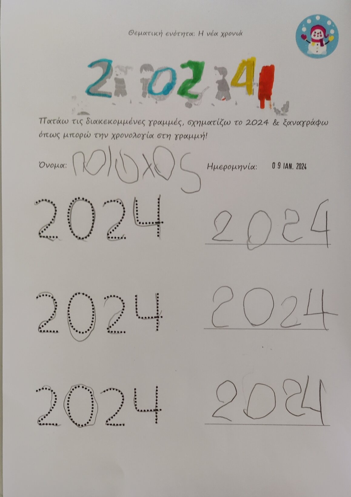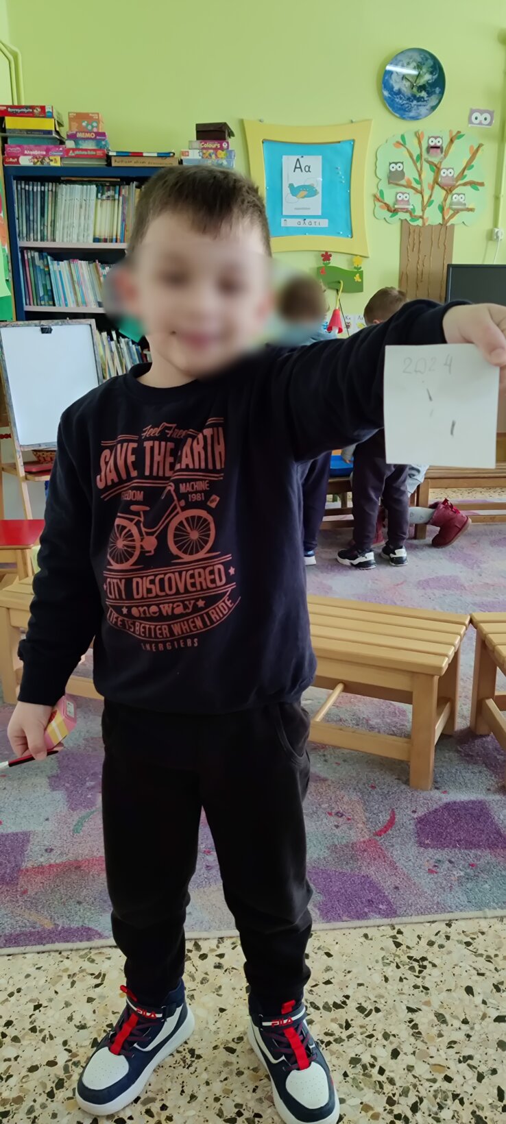 Το γράψαμε σε φύλλο εργασίας.Το γράψαμε και με πλαστελίνη.Δημιουργήσαμε με πηλό το γούρι της χρονιάς.Το ζωγραφίσαμε και κολλήσαμε τα διακοσμητικά.Έτοιμο το γούρι του 2024!Ετοιμάσαμε και ένα για το Ίδρυμα Μελά για να τους ευχαριστήσουμε για τη δωρεά τους.Γιορτάσαμε τα γενέθλια του Παύλου.και του ετοιμάσαμε όμορφες ζωγραφιές για να του ευχηθούμε και να τον ευχαριστήσουμε για τα κεράσματά του.Ζωγραφίσαμε,γράψαμε,κολλήσαμε καιφτιάξαμε μία ομαδική κατασκευή με τις ευχές μας για τη νέα χρονιά.Κόψαμε τη βασιλόπιτα του 2024.Τα δώρα μας όπως κάθε χρονιά περίμεναν τον τυχερό αλλά και τους υπόλοιπους συμμαθητές του.Τυχερή αναδείχτηκε φέτος η Φλορέλα μας!Τα πήραμε φεύγοντας, μαζί με το γούρι της χρονιάς.