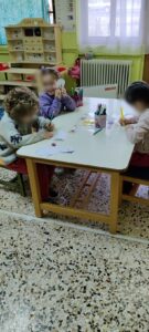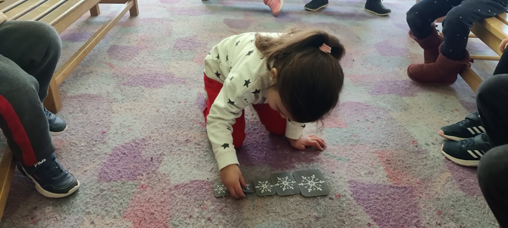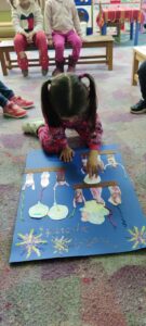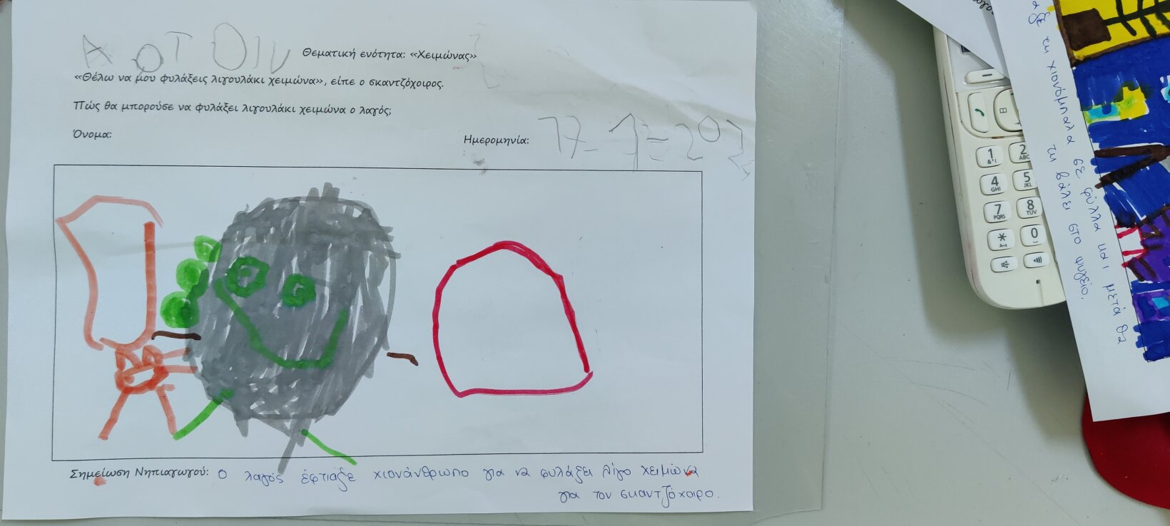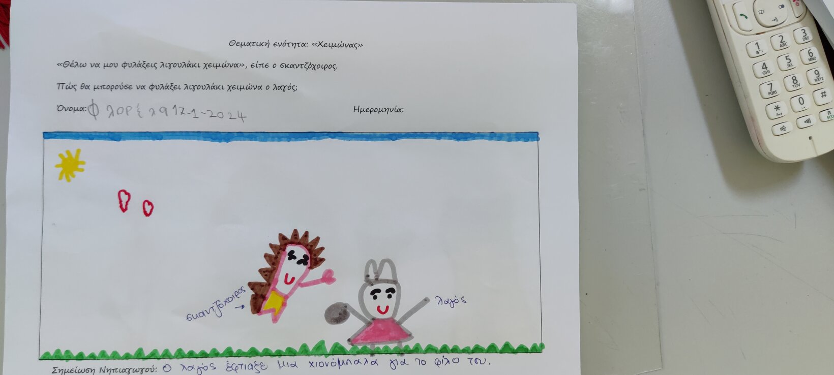 και μάθαμε την ιστορία του μικρού σκαντζόχοιρου και του φίλου του.Ζωγραφίσαμε τις ιδέες μας για τον τρόπο που θα μπορούσε να φυλάξει λίγο χειμώνα ο λαγός για το φίλο του.Διαβάσαμε την ιστορία του αγαπημένου “Μεγάλου χνουδωτού” και κάναμε υποθέσεις για τη συνέχειά της.Σειροθετήσαμε από το μεγαλύτερο στο μικρότερο τις χιονονιφάδεςκαι κόψαμε τον μεγάλο Χνουδωτό και τον κολλήσαμε ανάλογα με το μέγεθός του σε αντίστοιχου μεγέθους ιγκλού, ξεκινώντας από τον μεγαλύτερο και καταλήγοντας στον μικρότερο.Μιλήσαμε για τα μέσα θέρμανσης, καταγράψαμε ο καθένας όσα διαθέτει στο σπίτι του, μετρήσαμε και κάναμε συγκρίσεις.Μάθαμε το αρχικό γράμμα του χειμώνα.Το γράψαμε στον ασπροπίνακα,σε φύλλο εργασίας,