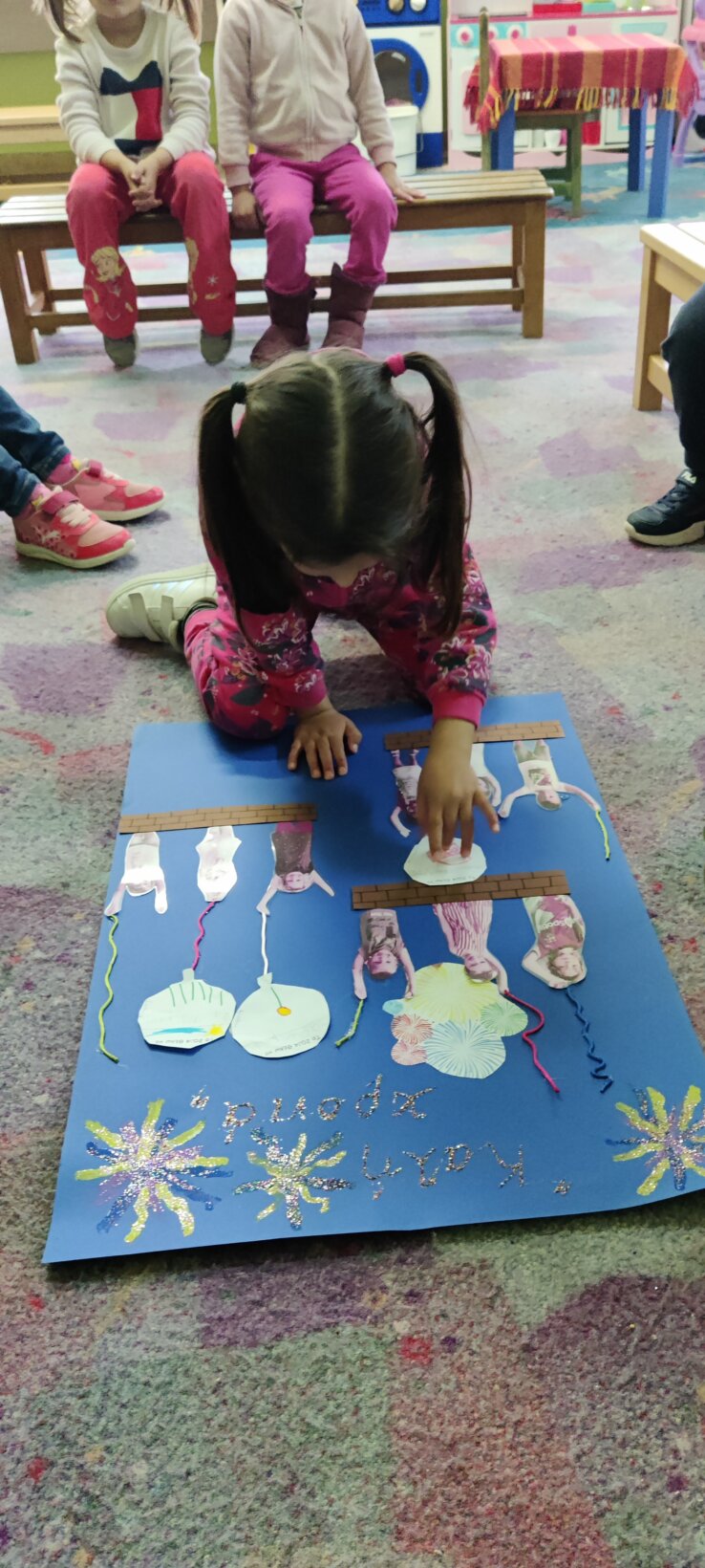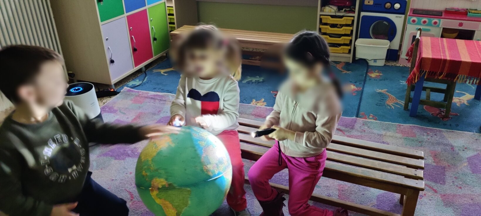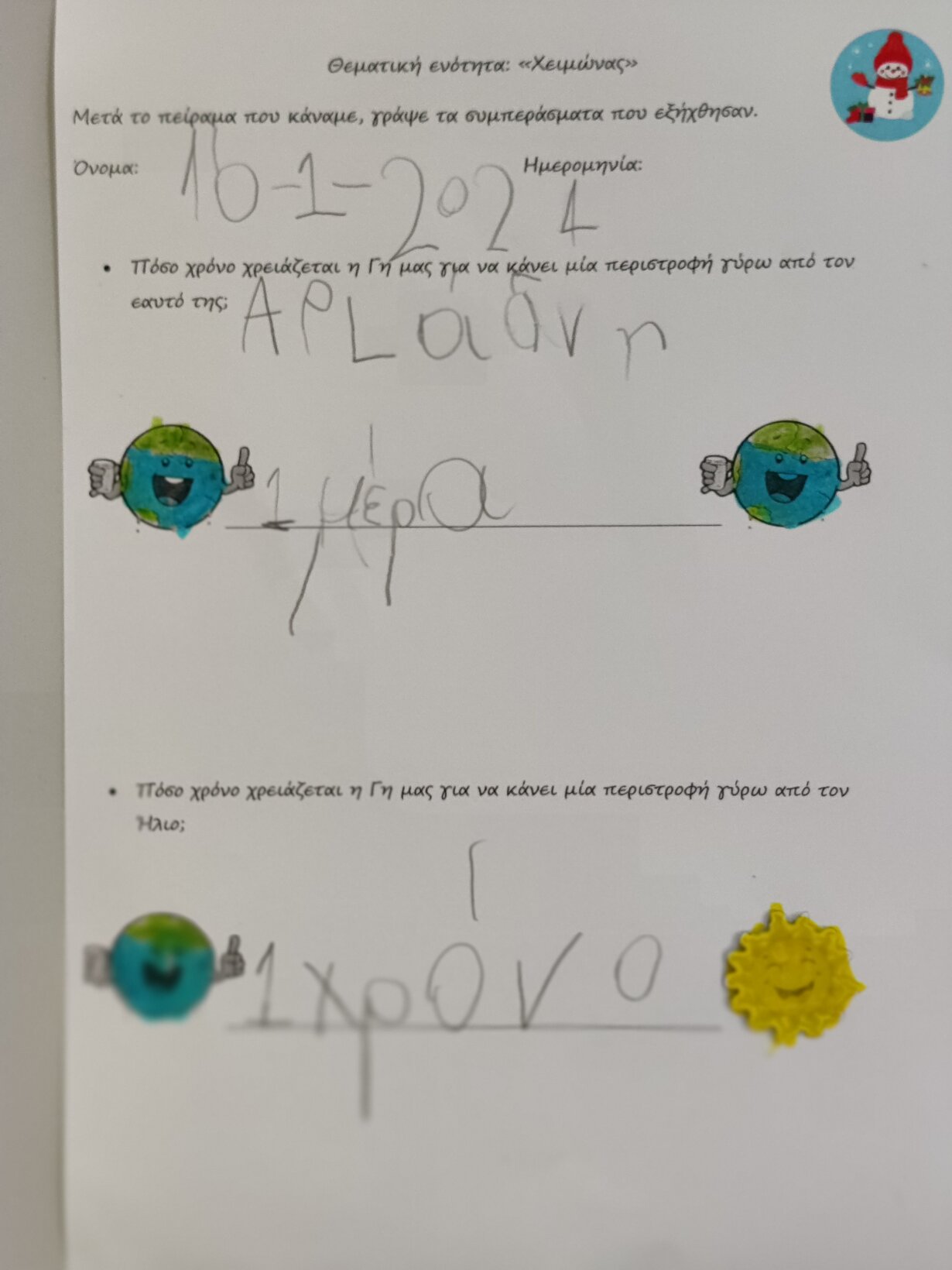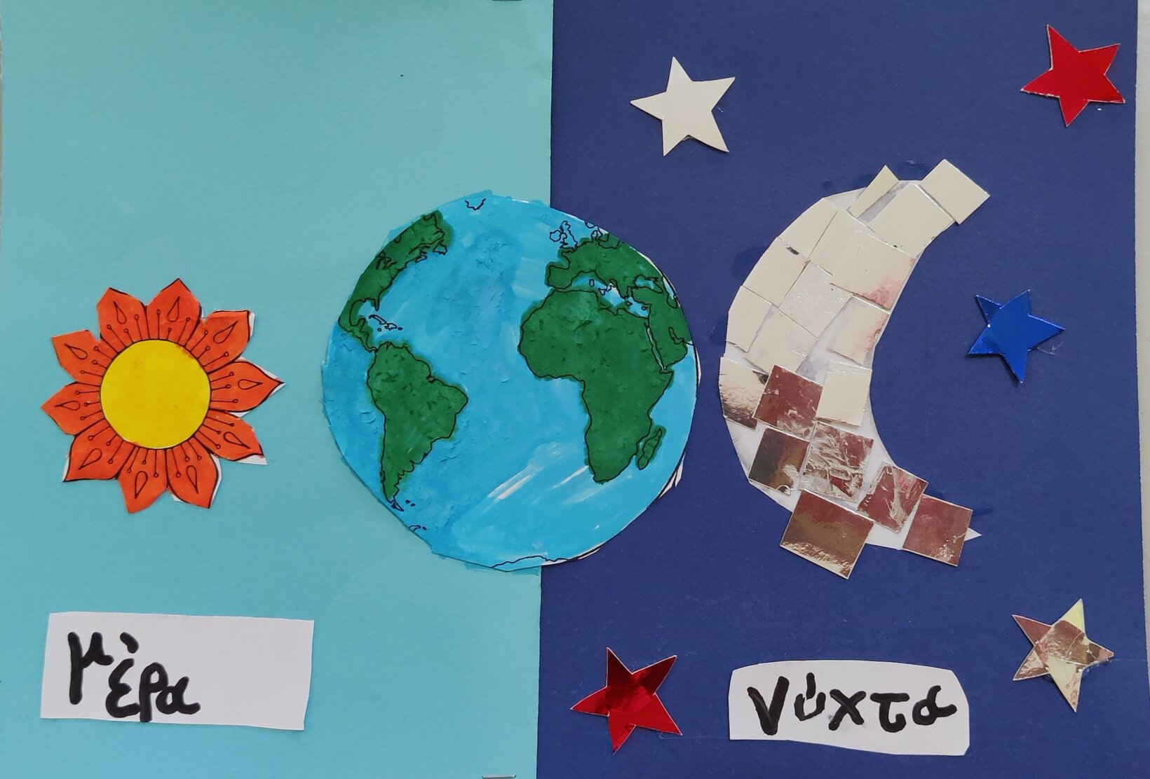 Μάθαμε για την εναλλαγή μέρας και νύχτας.Κάναμε το πείραμα με το φακό και την υδρόγειο σφαίρα και ανακαλύψαμε πότε έχει μέρα και πότε νύχτα στη χώρα μας.Καταγράψαμε τις νέες μας γνώσεις σε ένα φύλλο εργασίας.Αποτυπώσαμε την εναλλαγή μέρας και νύχταςστην κατασκευή που κάναμε.Παρακολουθήσαμε στο διαδίκτυο το “Λιγουλάκι χειμώνας” του Paul Stewart.